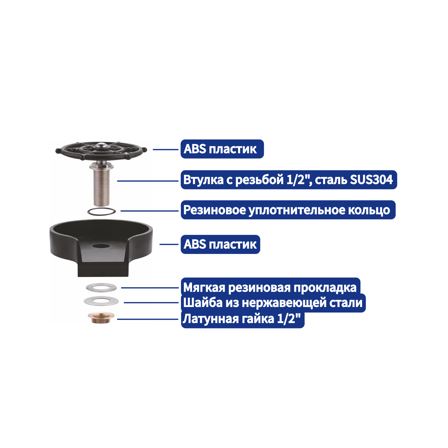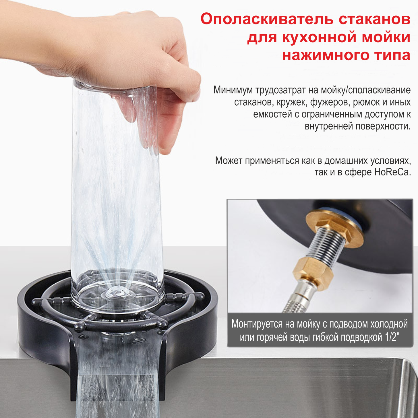 Ополаскиватель стаканов для кухонной мойки нажимного типа, материал ABS пластик крашенный в массе. Распылитель-втулка с резьбой для подключения воды 1/2".