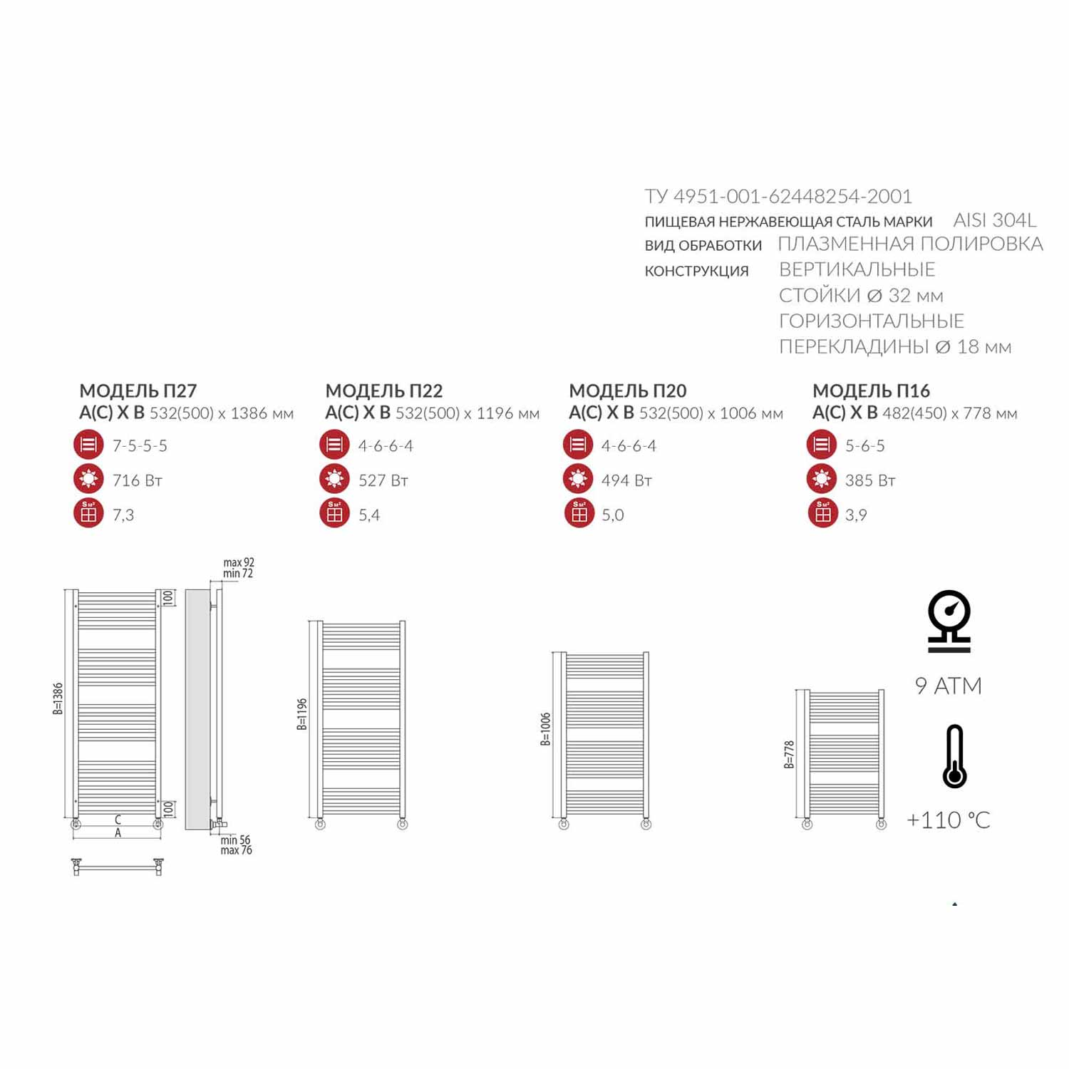 Водяной полотенцесушитель Terminus Аврора П16 300x780 4660059582207 с нижним подключением. Для производства полотенцесушителя используется только высококачественная нержавеющая сталь марки AISI 304L с высоким содержанием легирующих элементов, Ni и Cr, это позволяет изделиям сохранять стойкость к агрессивным коррозийным средам, что существенно продлевает срок их эксплуатации. Толщина стенки используемой трубы не менее 2 мм, это обеспечивает 10-ти кратный запас прочности, труба устойчива к резким перепадам давления в системе водоснабжения!