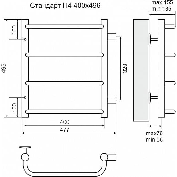 Водяной полотенцесушитель Terminus Стандарт П4 400x496 4670030725271 с боковым подключением. Для производства полотенцесушителя используется только высококачественная нержавеющая сталь марки AISI 304L с высоким содержанием легирующих элементов, Ni и Cr, это позволяет изделиям сохранять стойкость к агрессивным коррозийным средам, что существенно продлевает срок их эксплуатации. Толщина стенки используемой трубы не менее 2 мм, это обеспечивает 10-ти кратный запас прочности, труба устойчива к резким перепадам давления в системе водоснабжения!