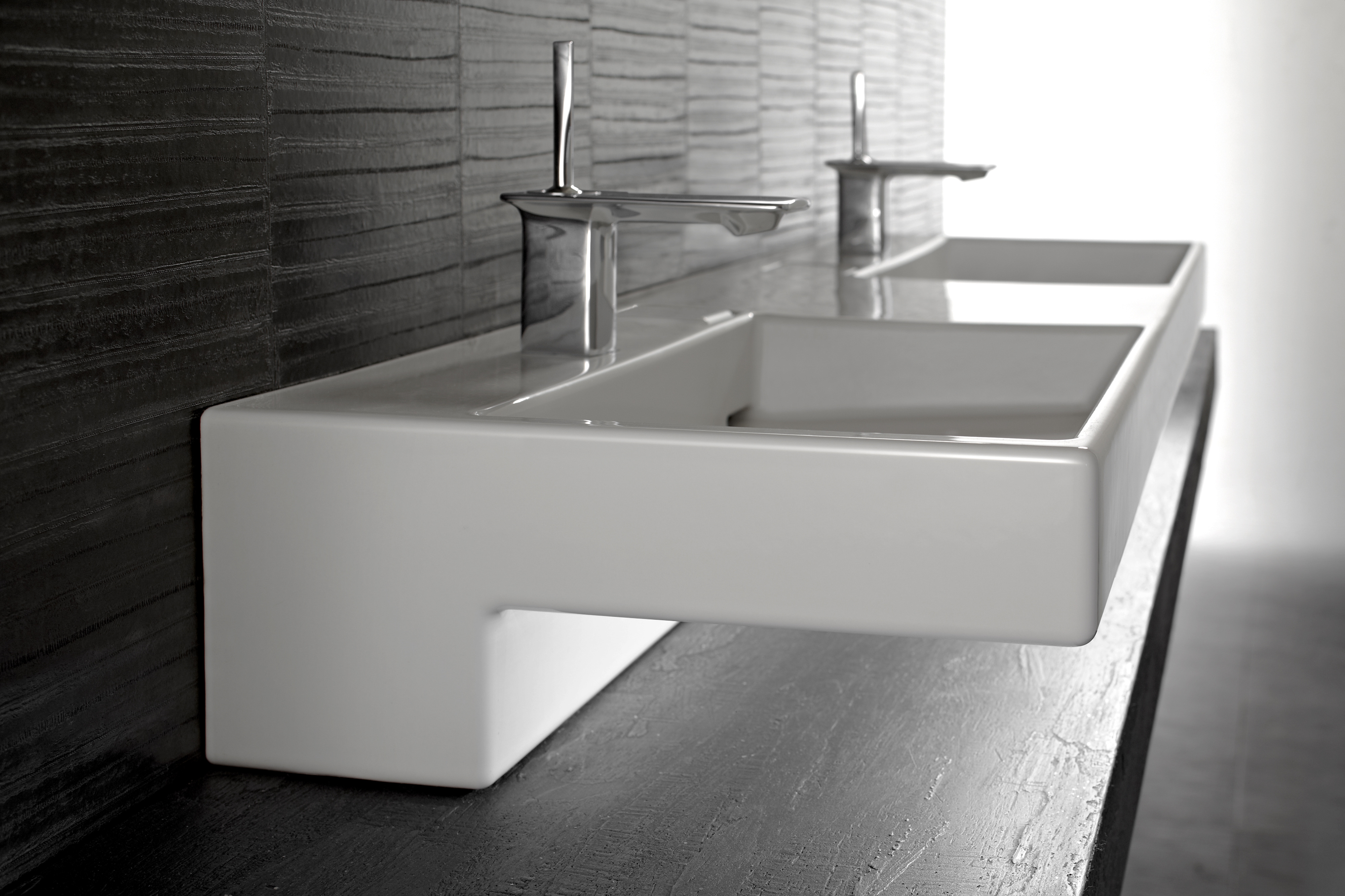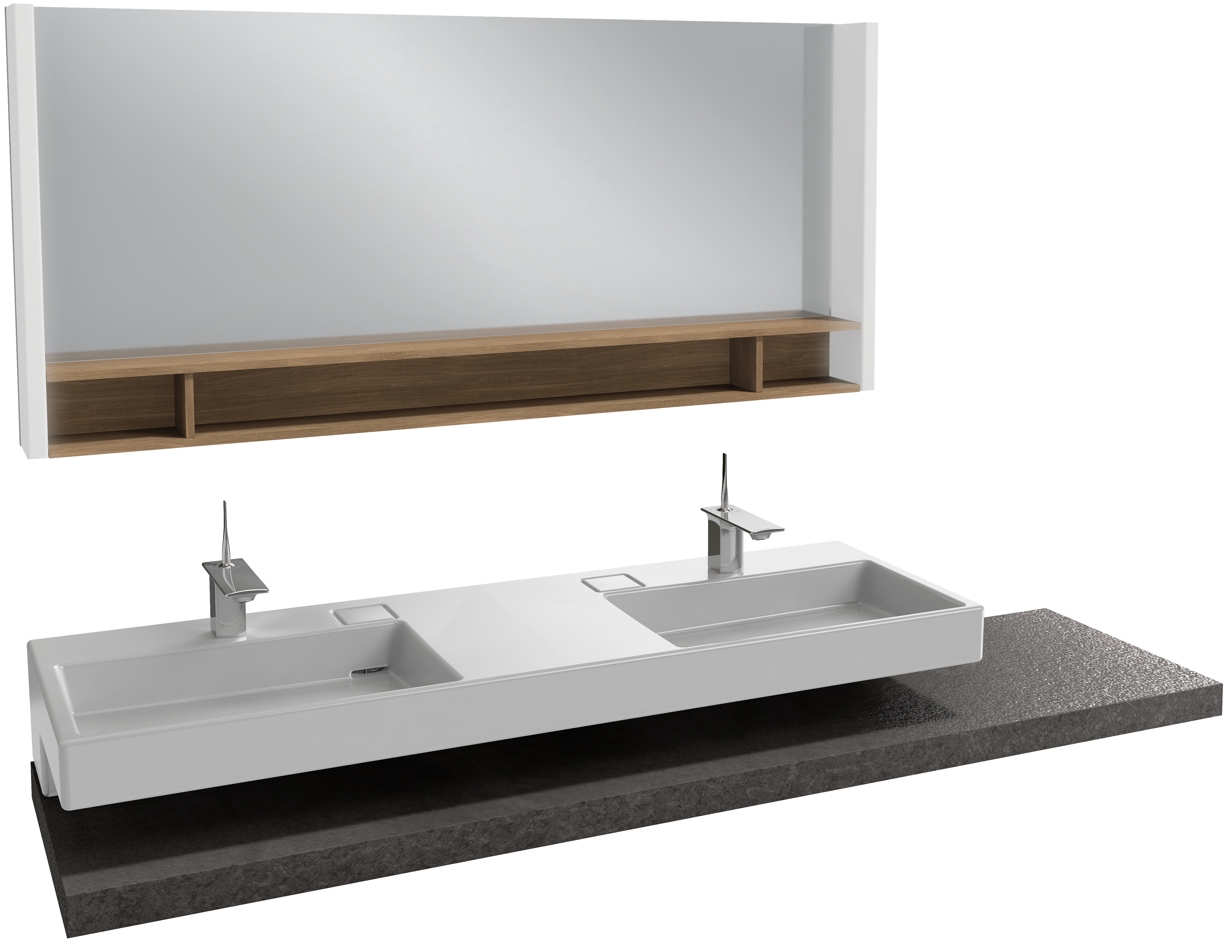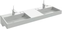 Двойная раковина Jacob Delafon Terrace 150 EXA112-00 с двумя готовыми и четырьмя намеченными отверстиями под два смесителя.
