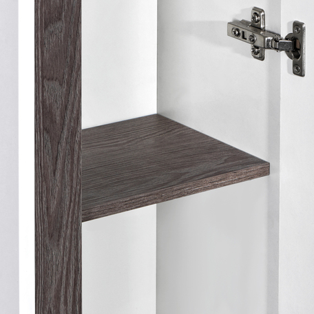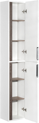 Подвесной шкаф-пенал Акватон Рене 31 1A222003NRC80 с двумя распашными дверцами и полками. Предназначен для использования в ванных комнатах с повышенной влажностью. Минималистичный стиль: четкая и лаконичная геометрия, интегрированные в фасад ручки, отсутствие выступающих деталей. Удачный контраст сочетания цветов и текстур: ультра белый глянец с темным оттенком дерева грецкий орех.
