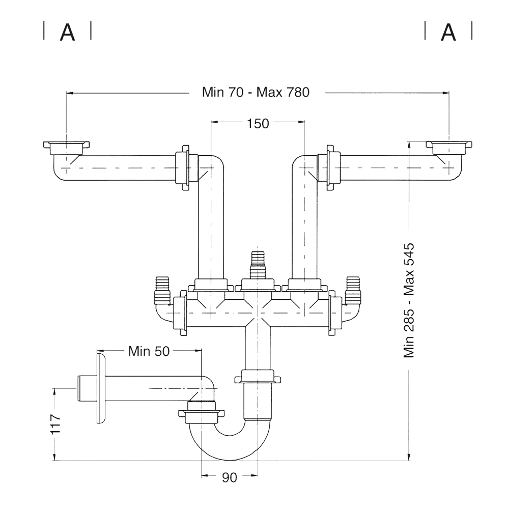 - Сифон предназначен для подключения кухонных моек, имеющих две раковины, к канализационной системе, для чего на данном сифоне присутствует двойной разборный выпуск