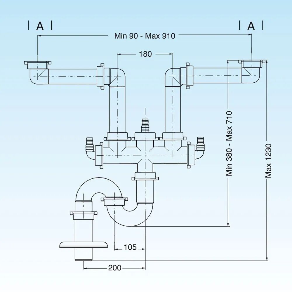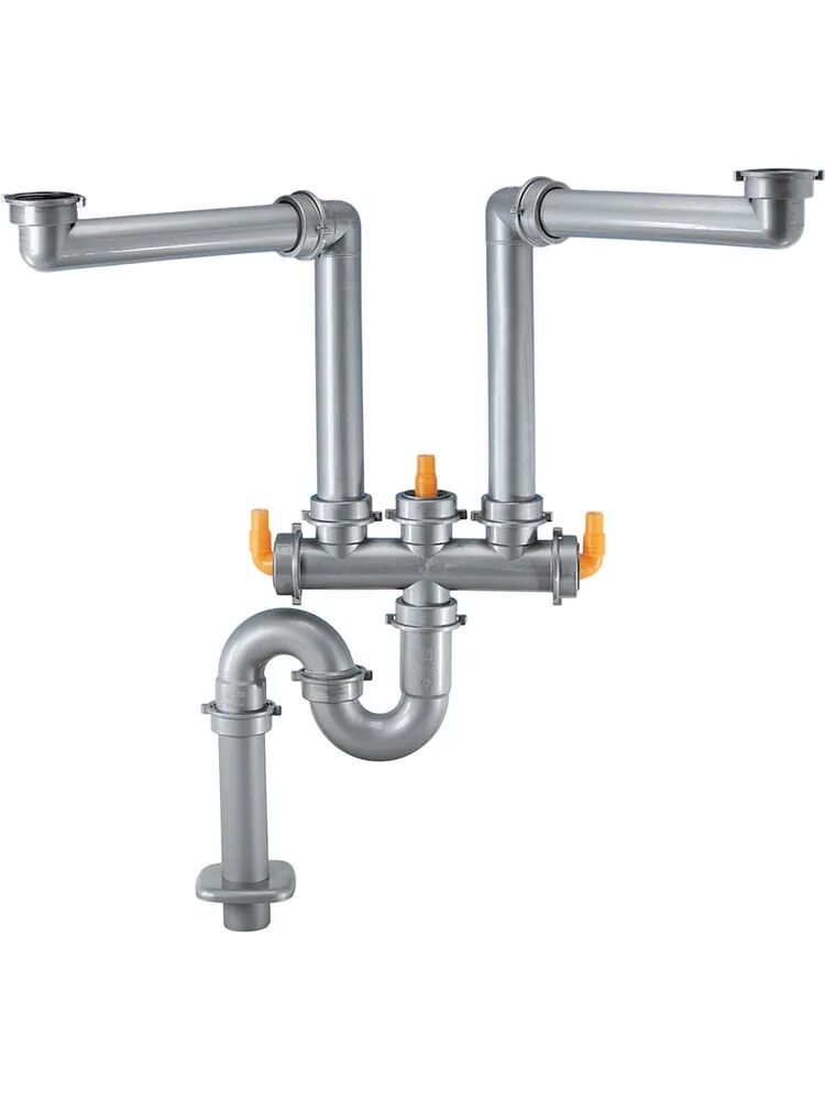 - Сифон предназначен для подключения кухонных моек, имеющих две раковины, к канализационной системе, для чего на данном сифоне присутствует двойной разборный выпуск