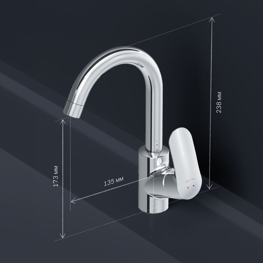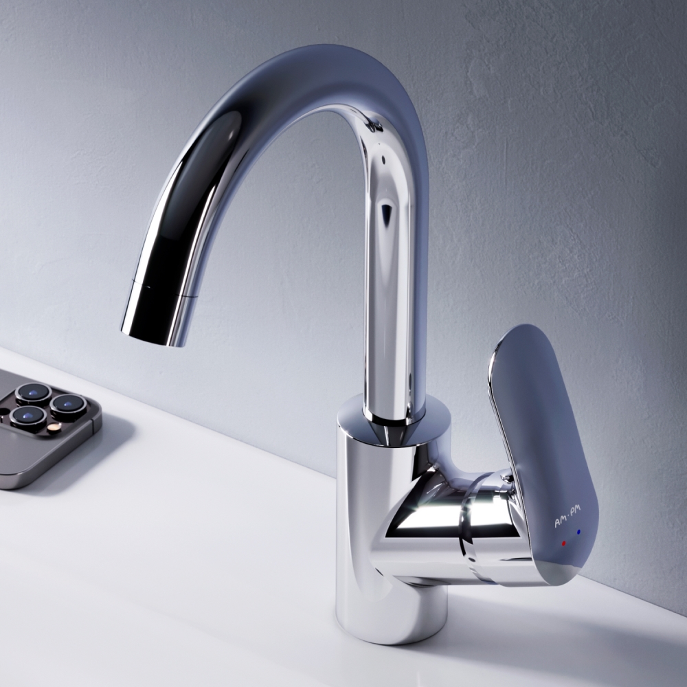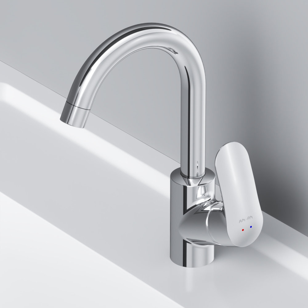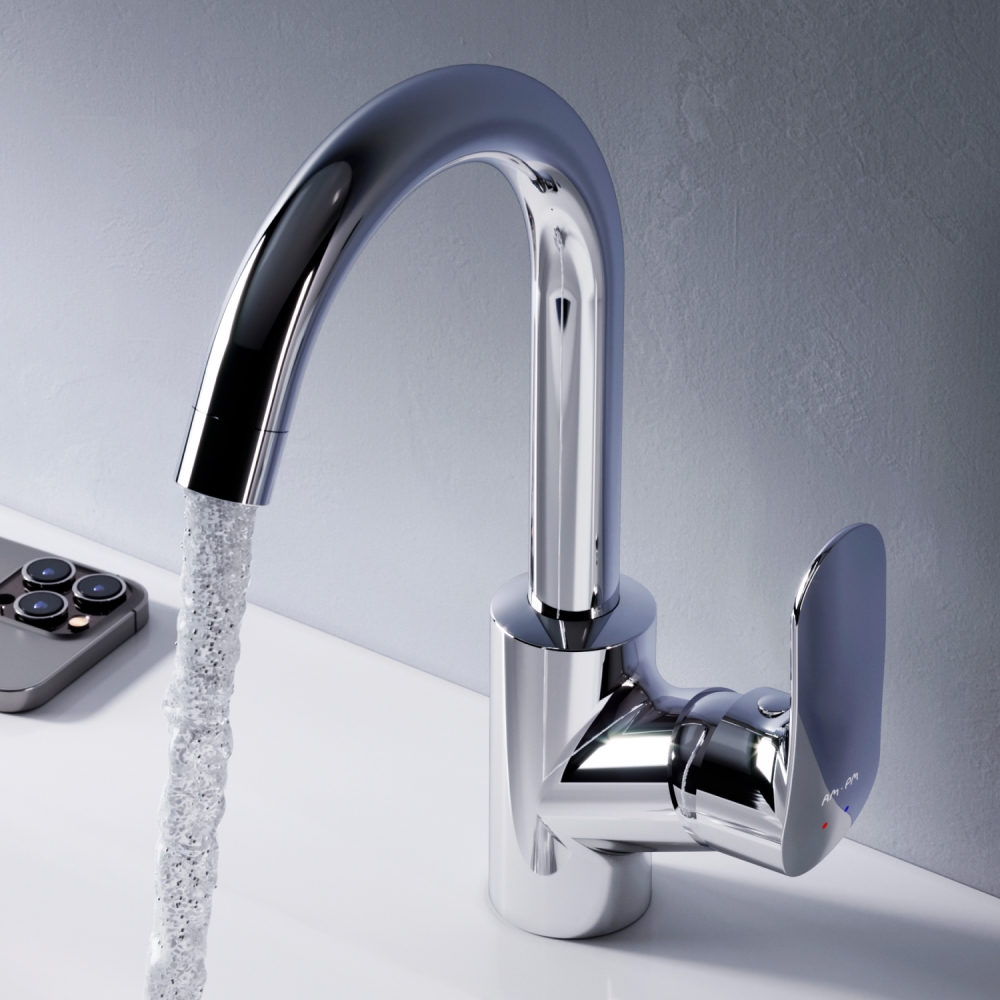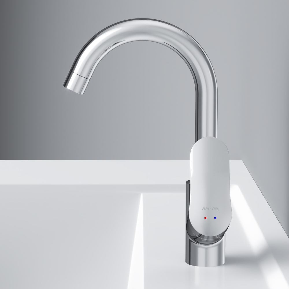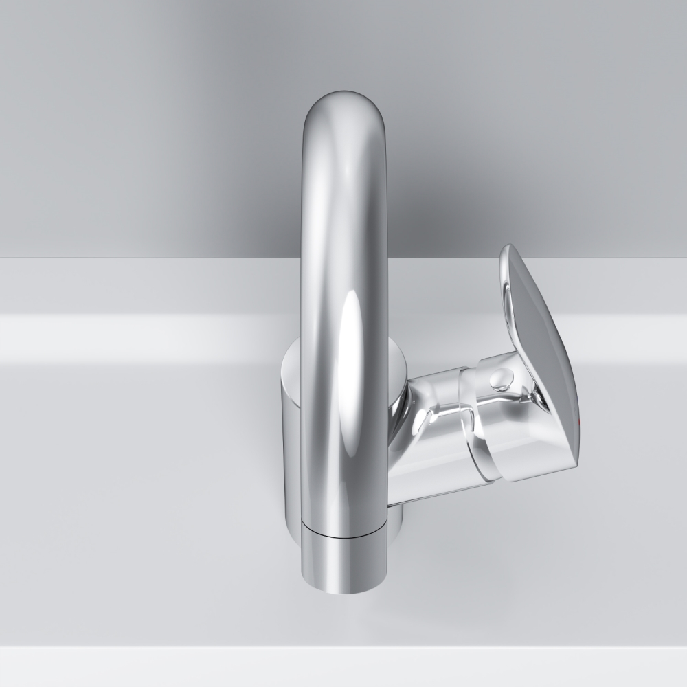 - Высокий излив придает смесителю утонченный вид и идеально подойдет для раковины с глубокой чашей, а благодаря обширной зоне движения ручки управлять температурой воды еще проще