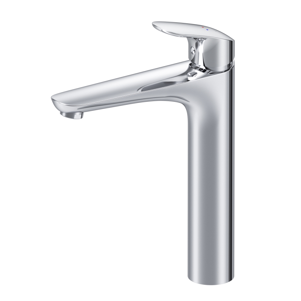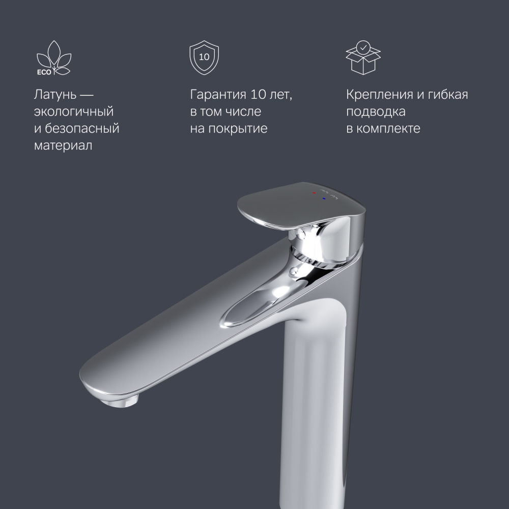 Высокий излив придает смесителю утонченный вид и идеально подойдет для раковины с глубокой чашей, а благодаря обширной зоне движения ручки управлять температурой воды еще проще.