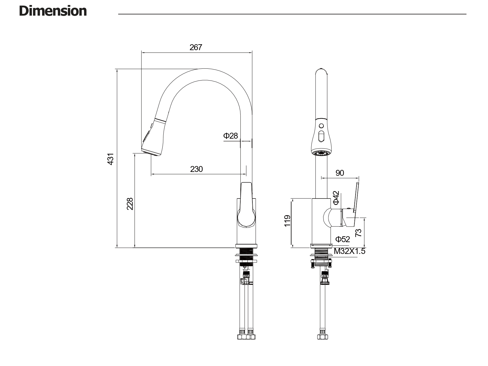 - Поворотная головка выдвижного излива на 360 градусов из нержавеющей стали