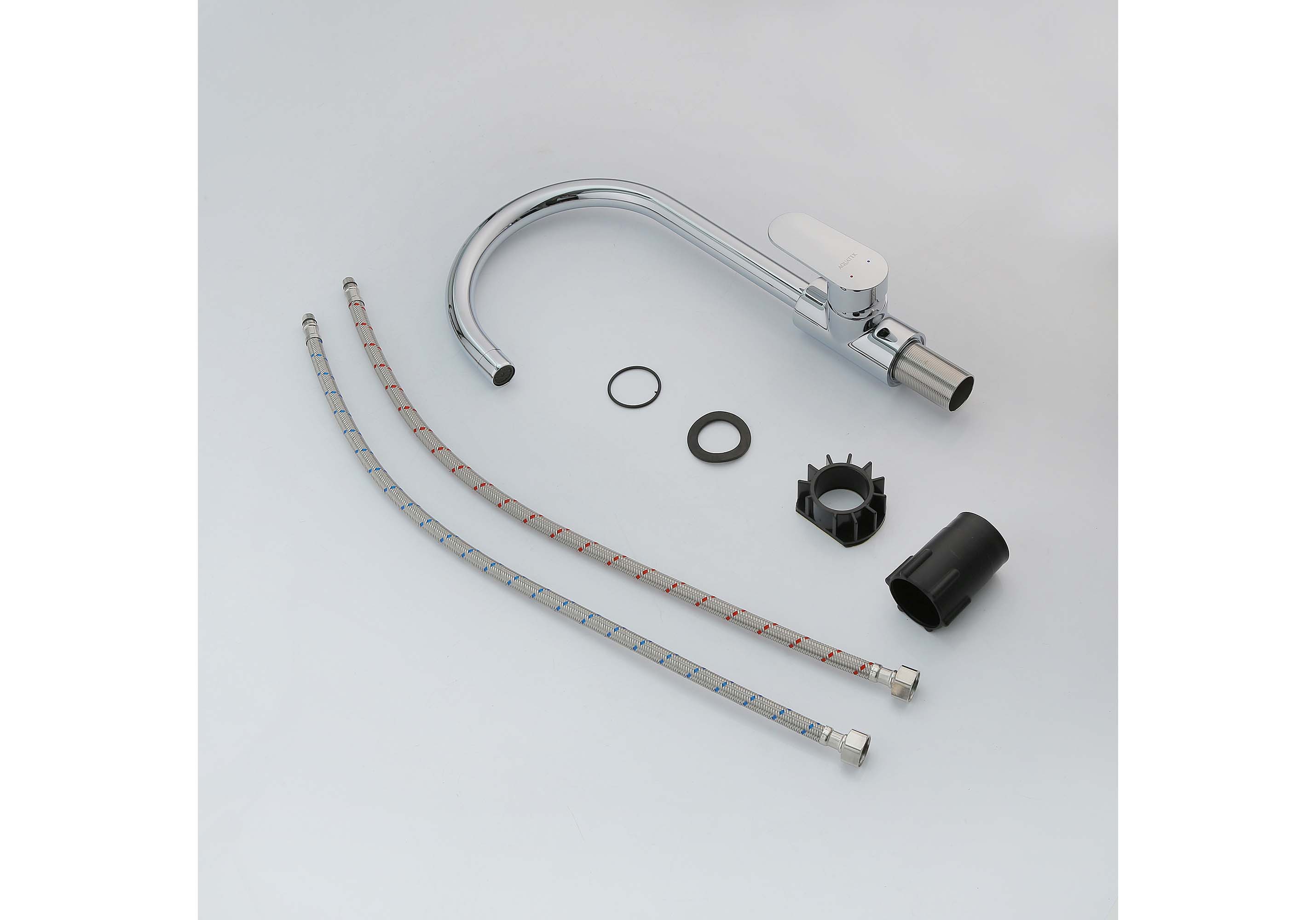 - Оснащен высоким изливом, подходит для большинства кухонных моек