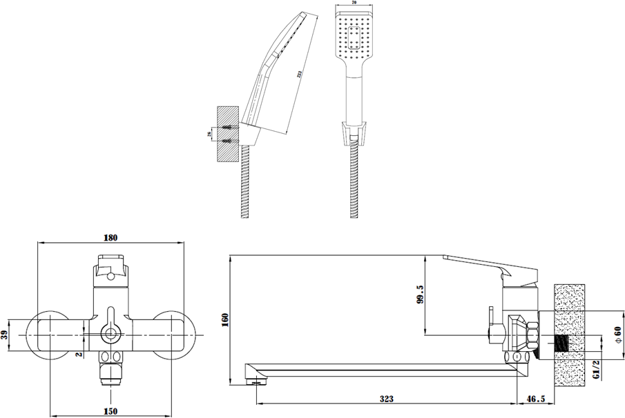 | Оснащение | душевой шланг, настенный держатель, эксцентрики, переключатель потоков, душевая лейка, аэратор |