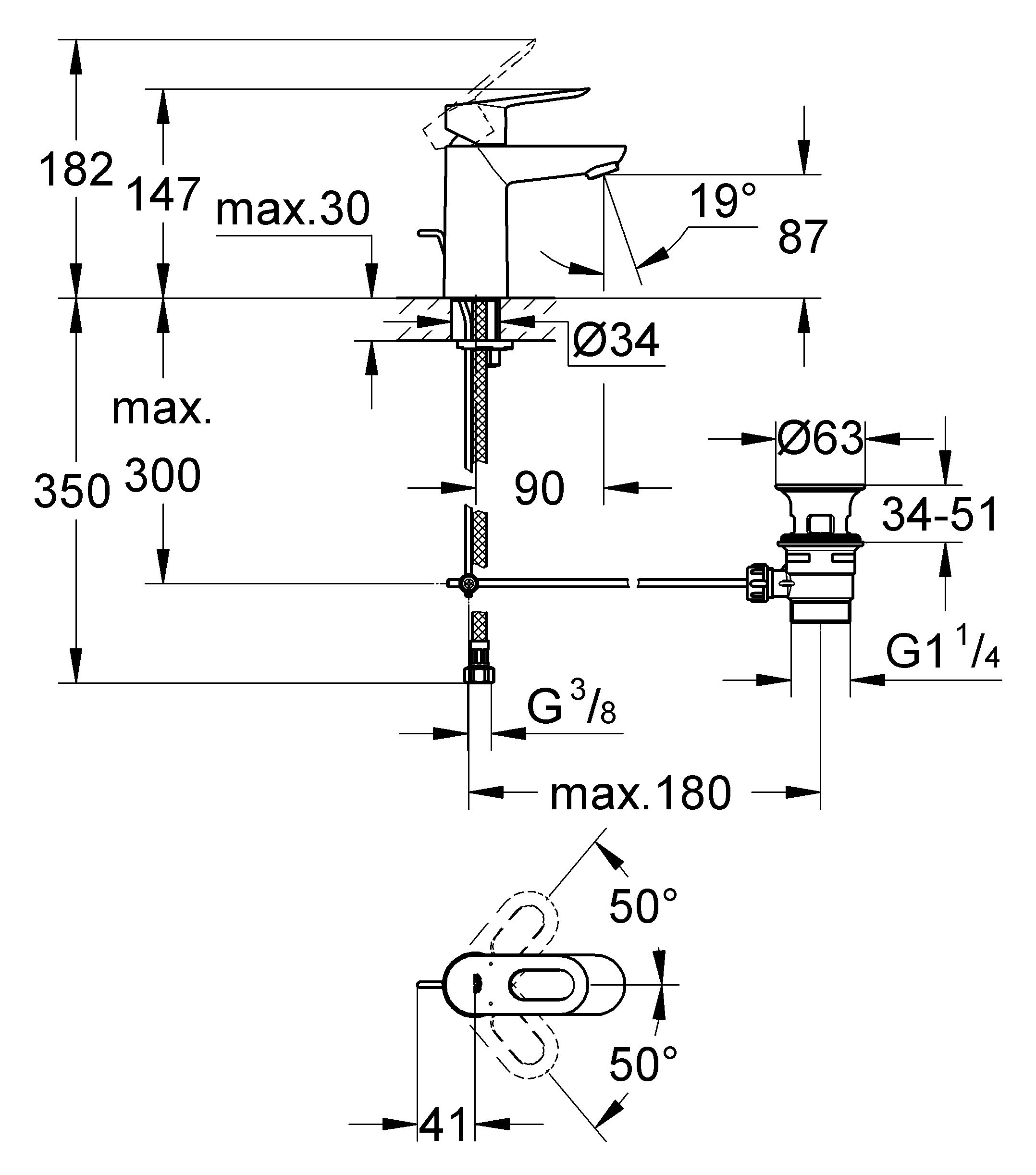 В комплекте поставки: смеситель, гибкая подводка, донный клапан.