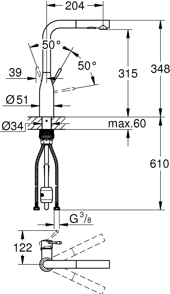 - Поворотный трубкообразный излив с радиусом поворота 360 градусов