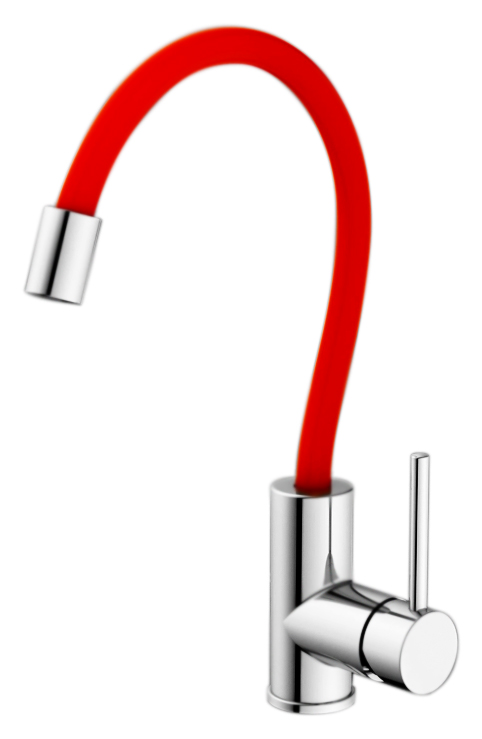 - Сочетание хромированного покрытия корпуса и матовых красных деталей делает смеситель стильным и оригинальным