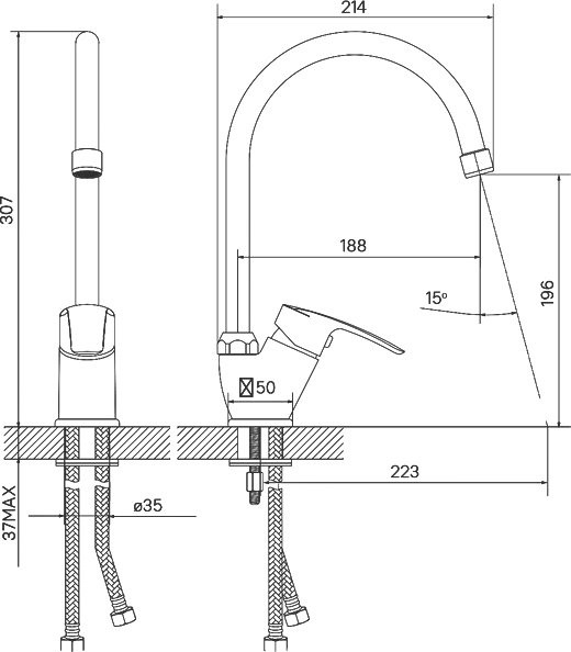 - Подключение к системе водоснабжения: гибкая подводка из нетоксичной EPDM резины в оплетке из нержавеющей стали, М10 - 1/2