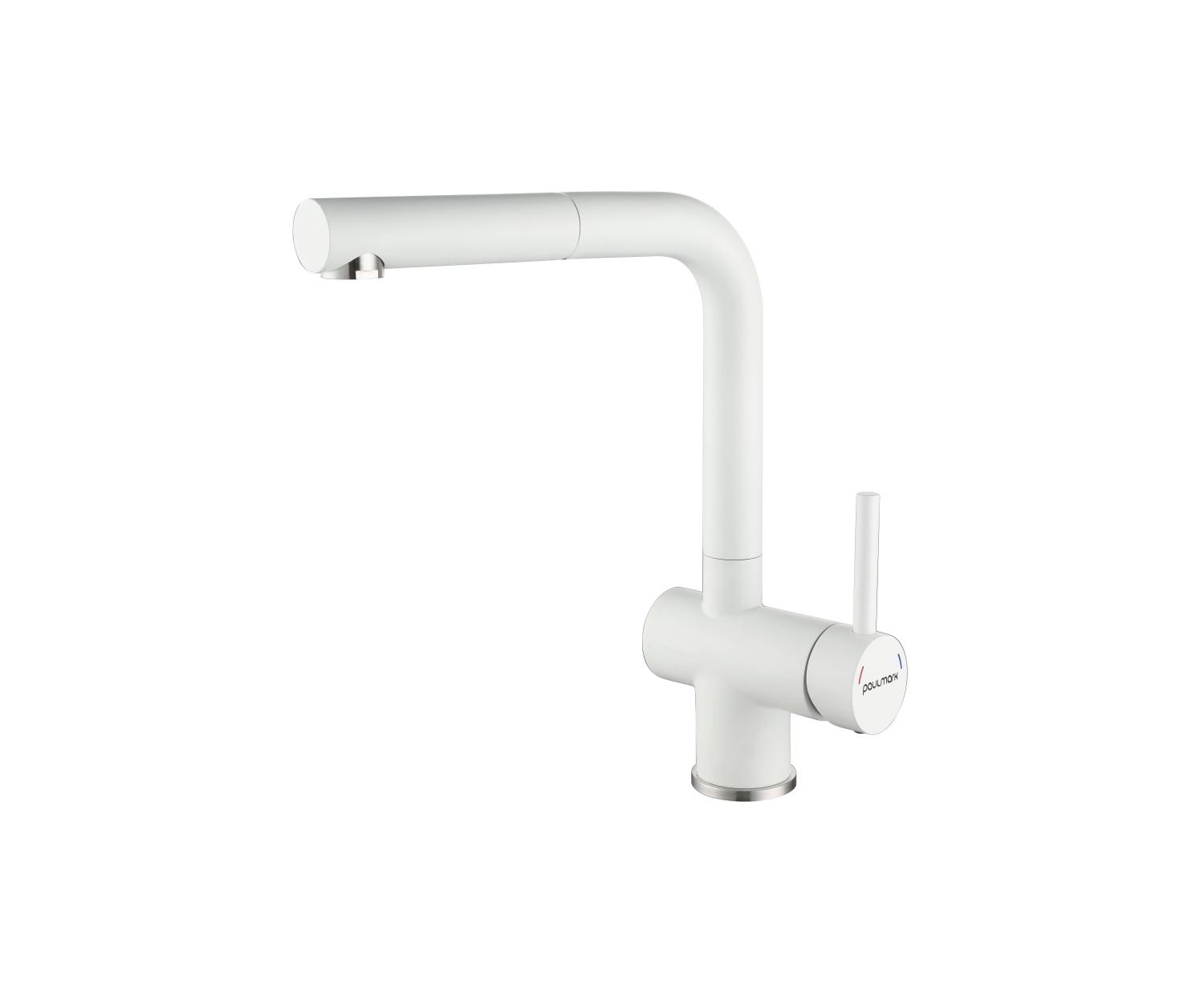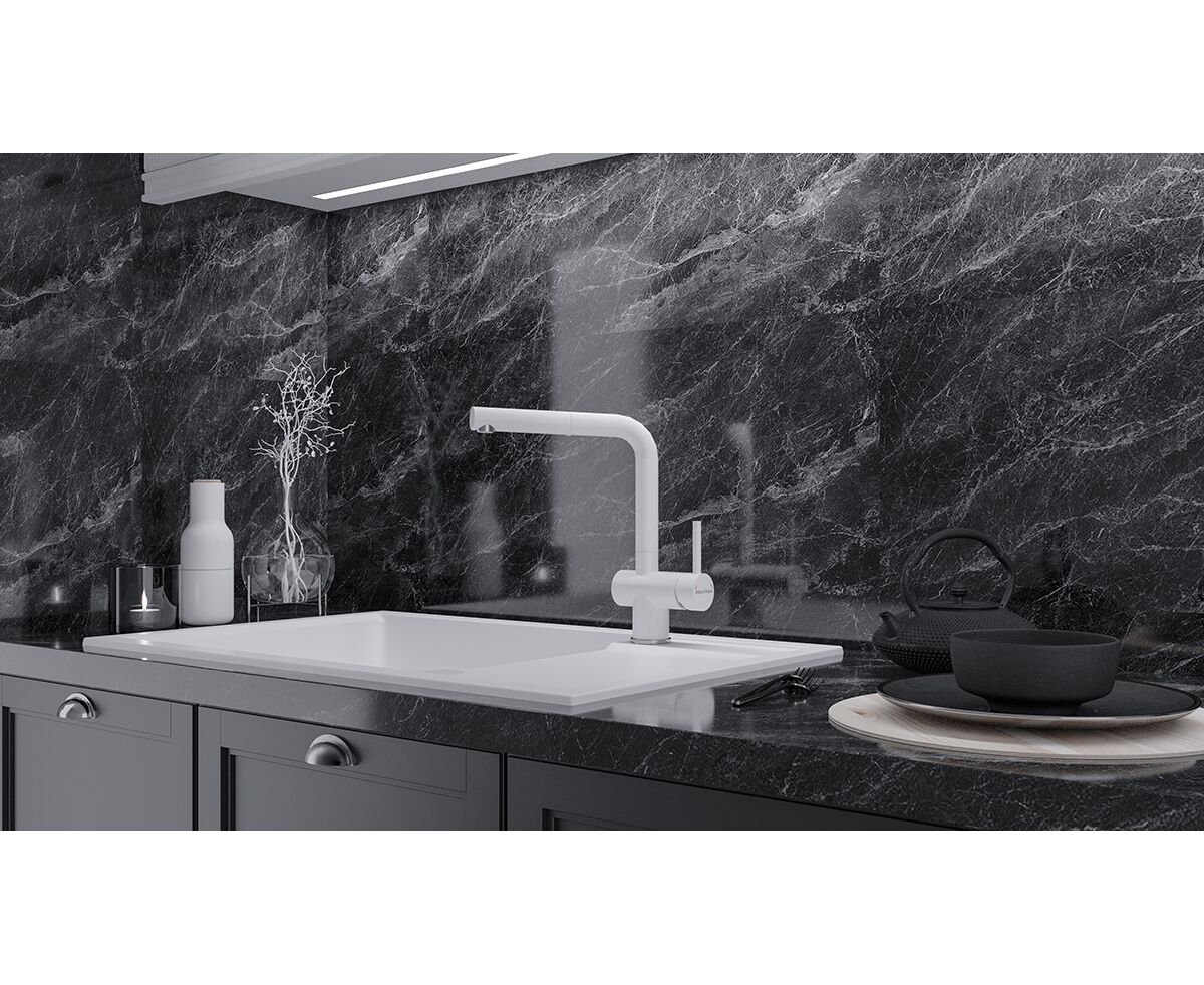 Смеситель с выдвижным изливом, обеспечивающим комфорт при мытье посуды, продуктов и уходе за мойкой. Изготовлен из нержавеющей стали AISI 304 с долговечным керамическим картриджем