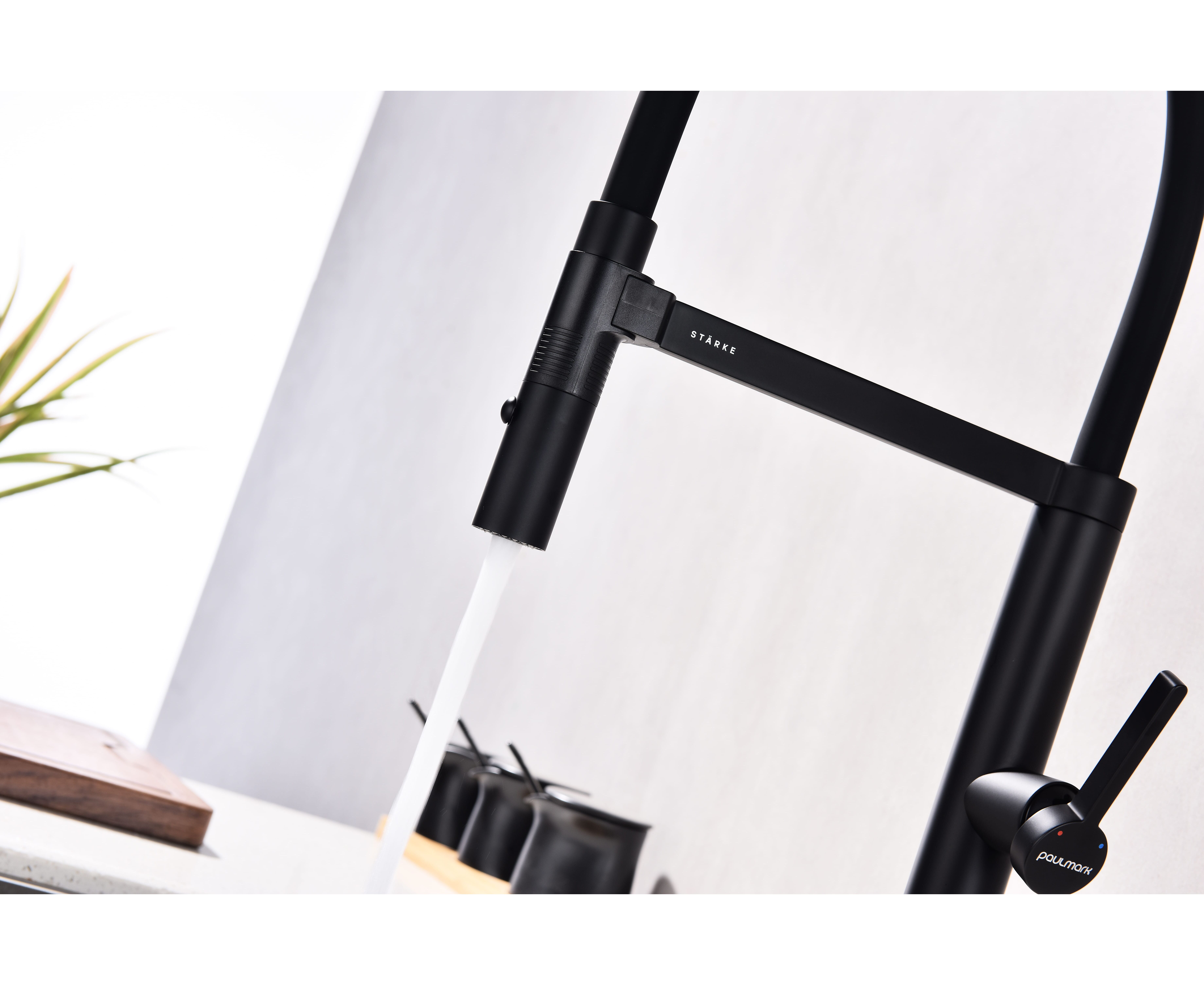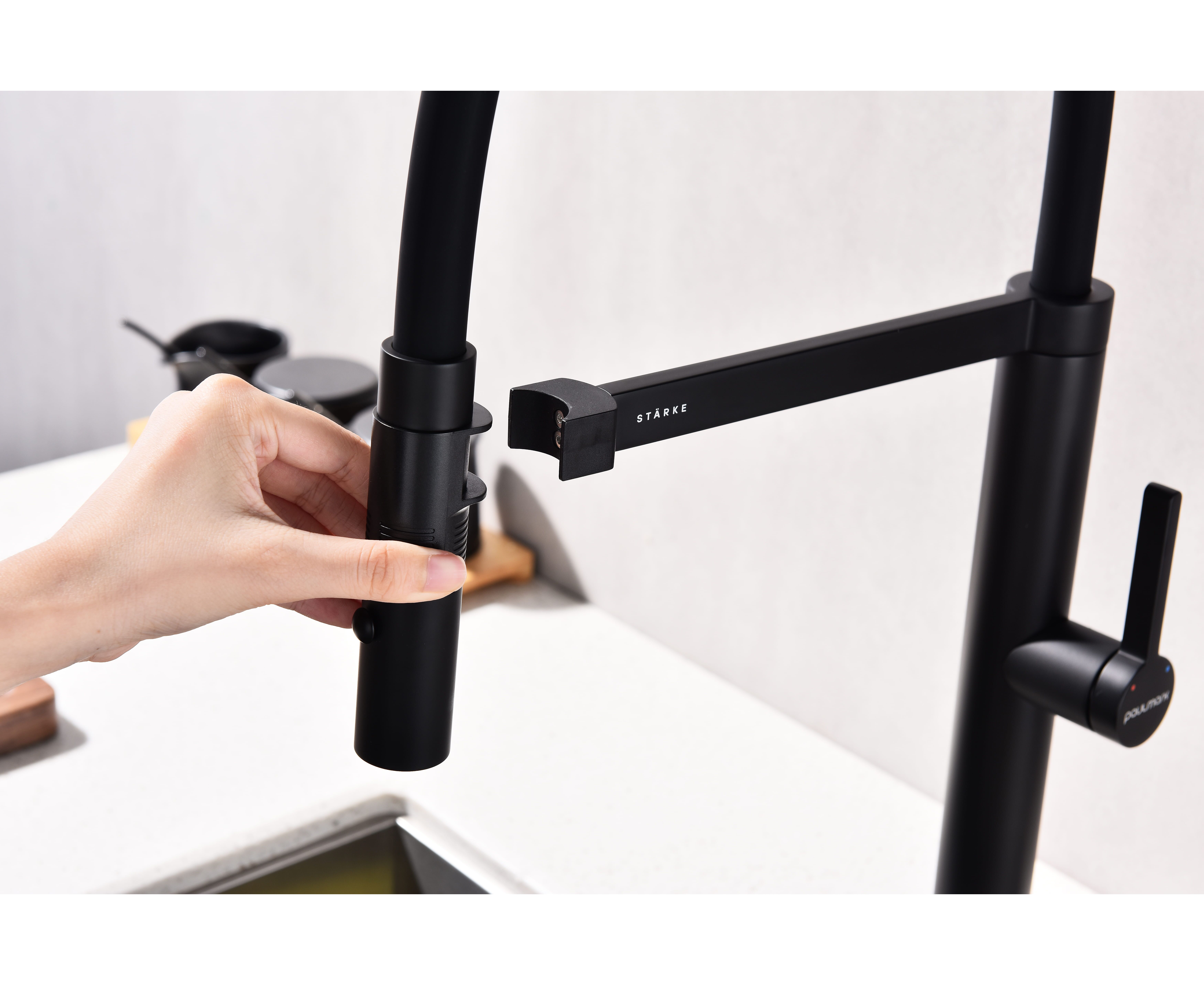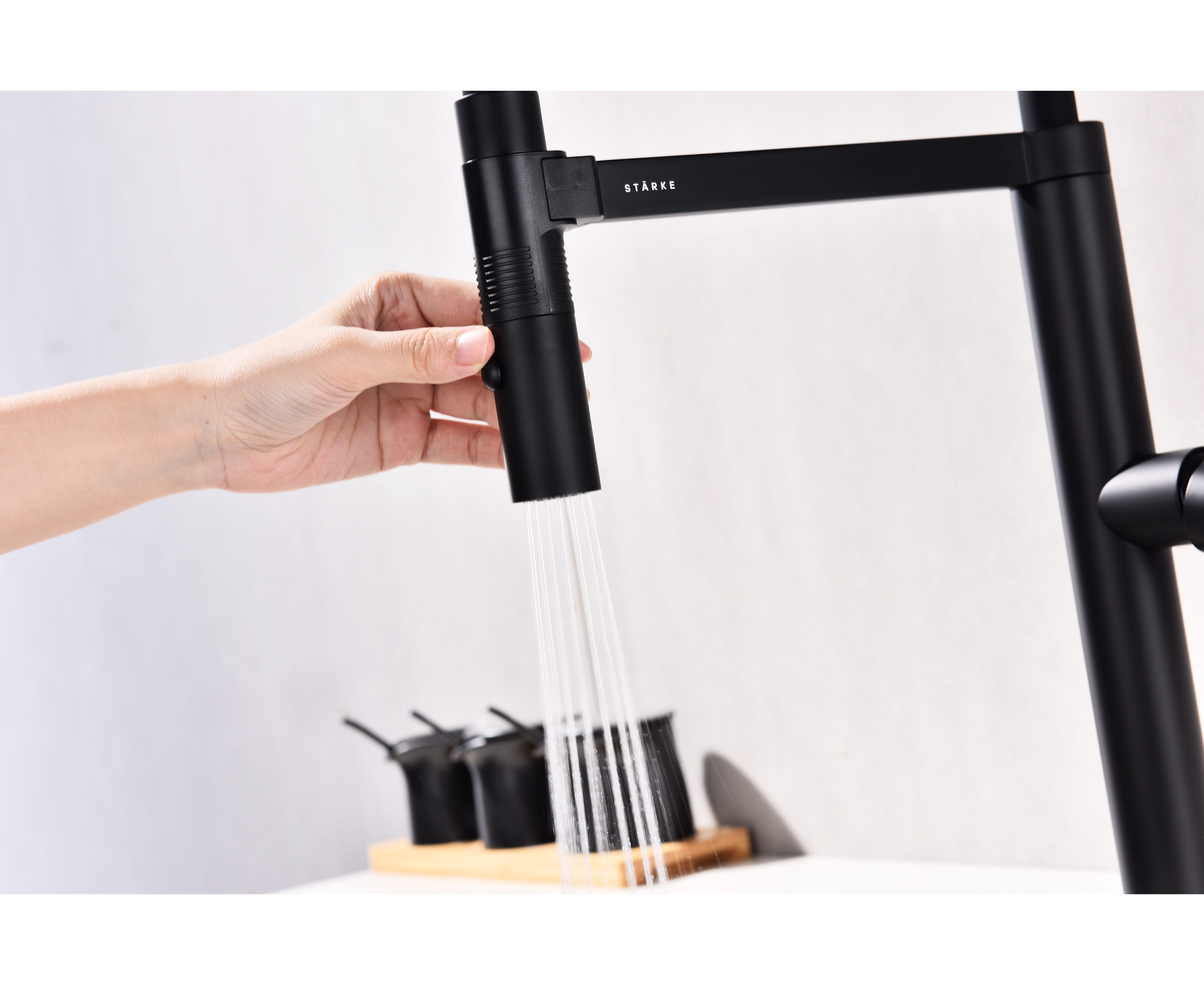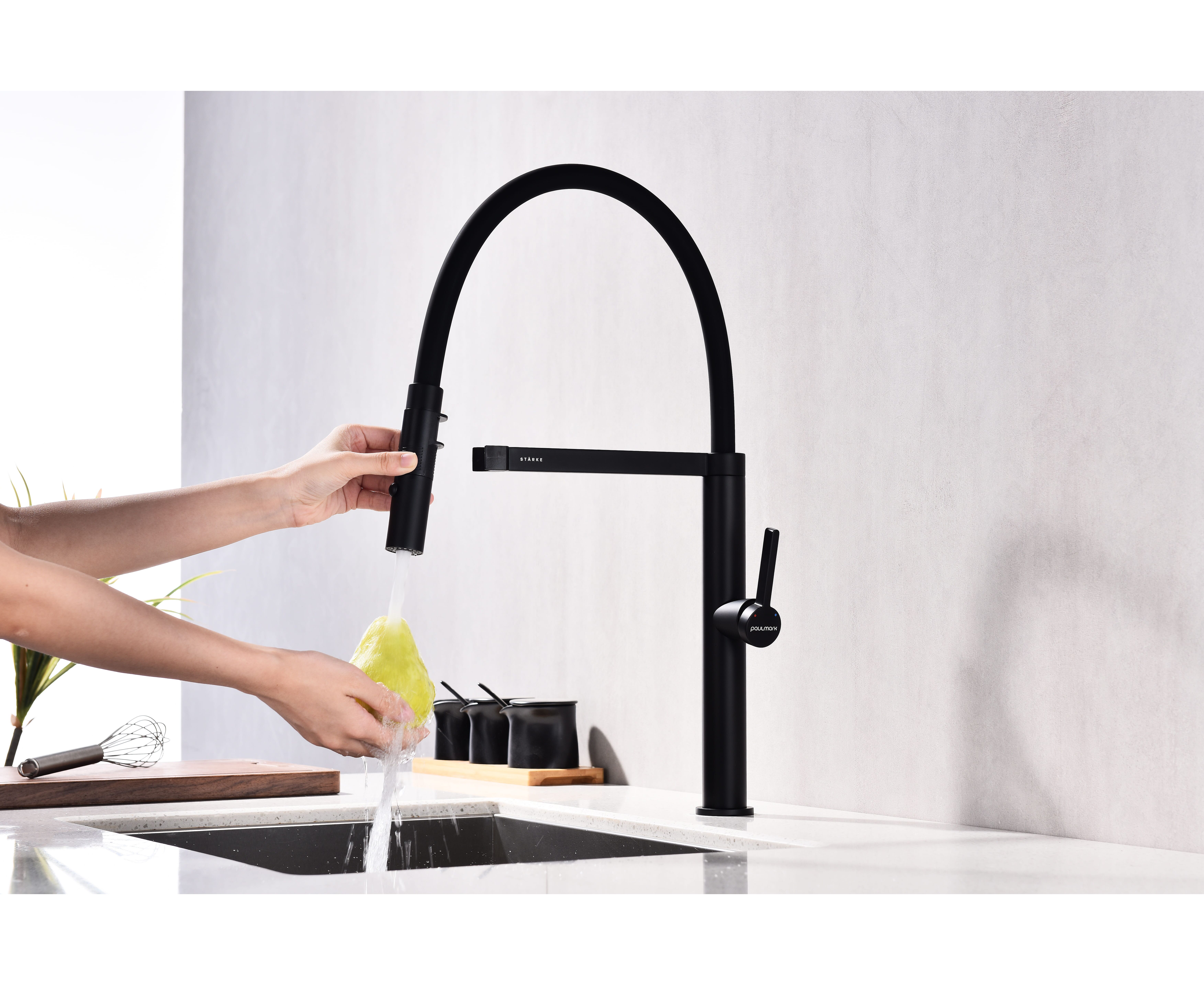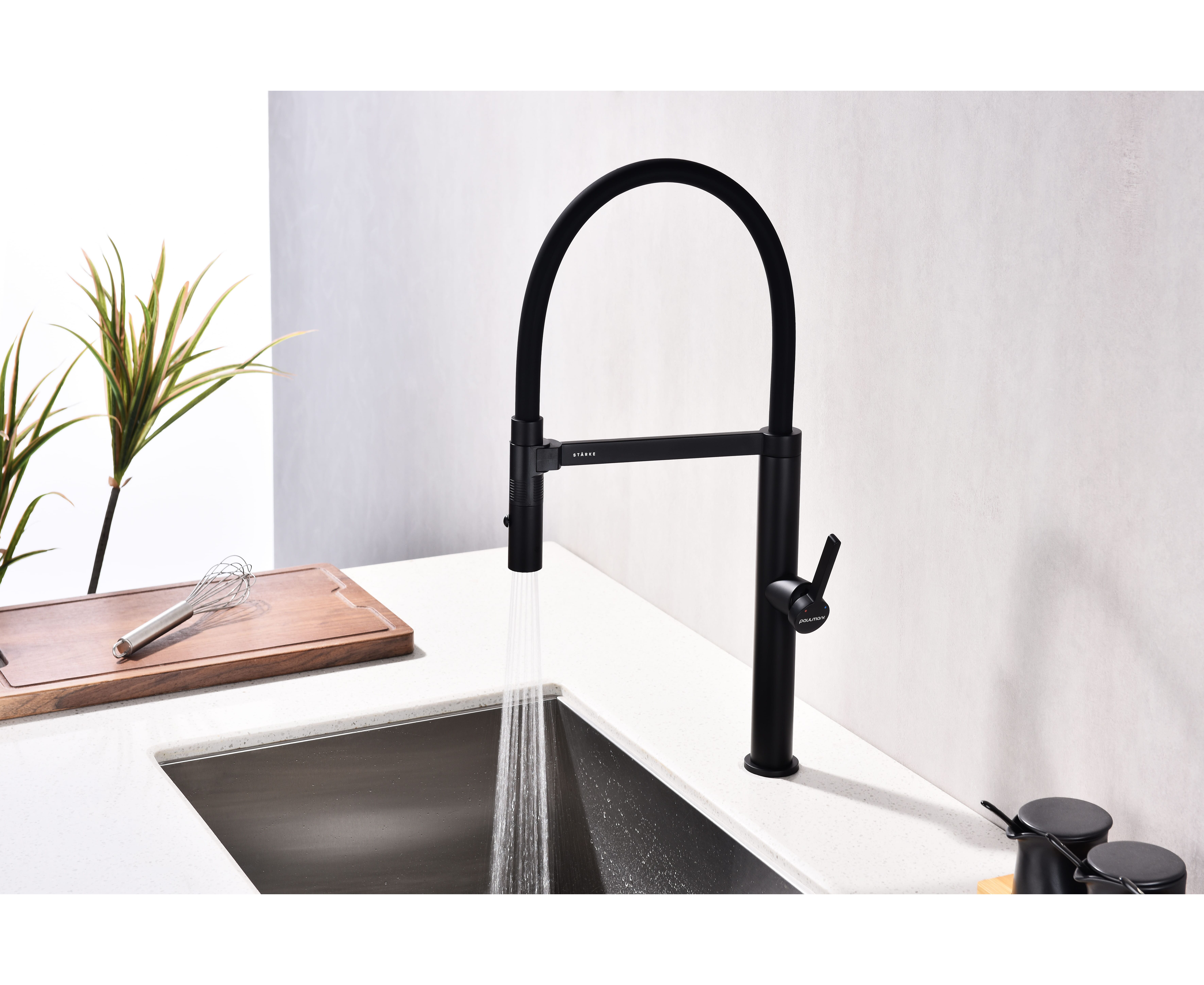 Смеситель с высоким гибким силиконовым изливом, вращающимся на 360°. Магнитный механизм фиксации обеспечивает удобство использования. Два режима подачи воды - мощная струя и экономичный душ - переключаются кнопкой на конце излива.
