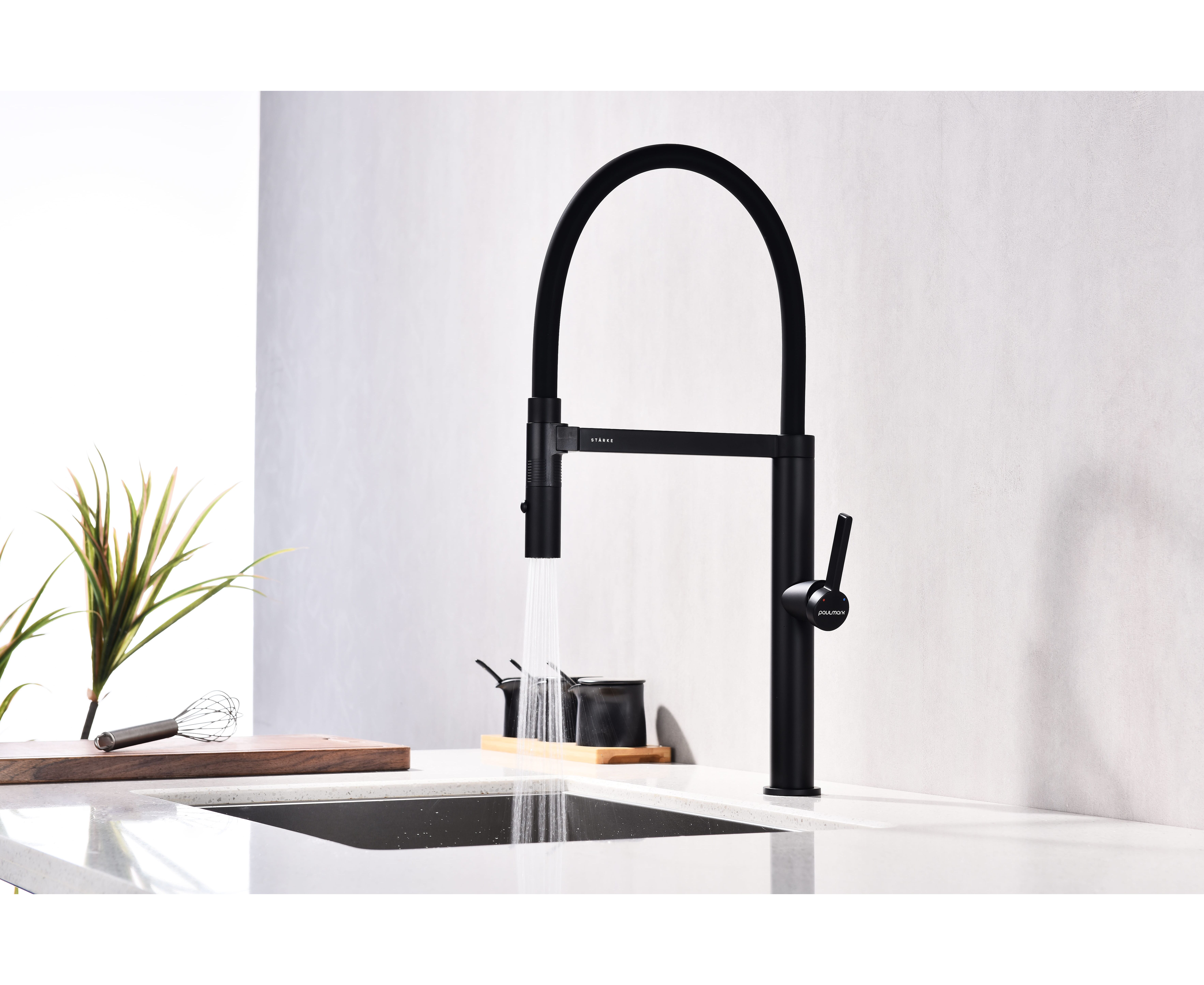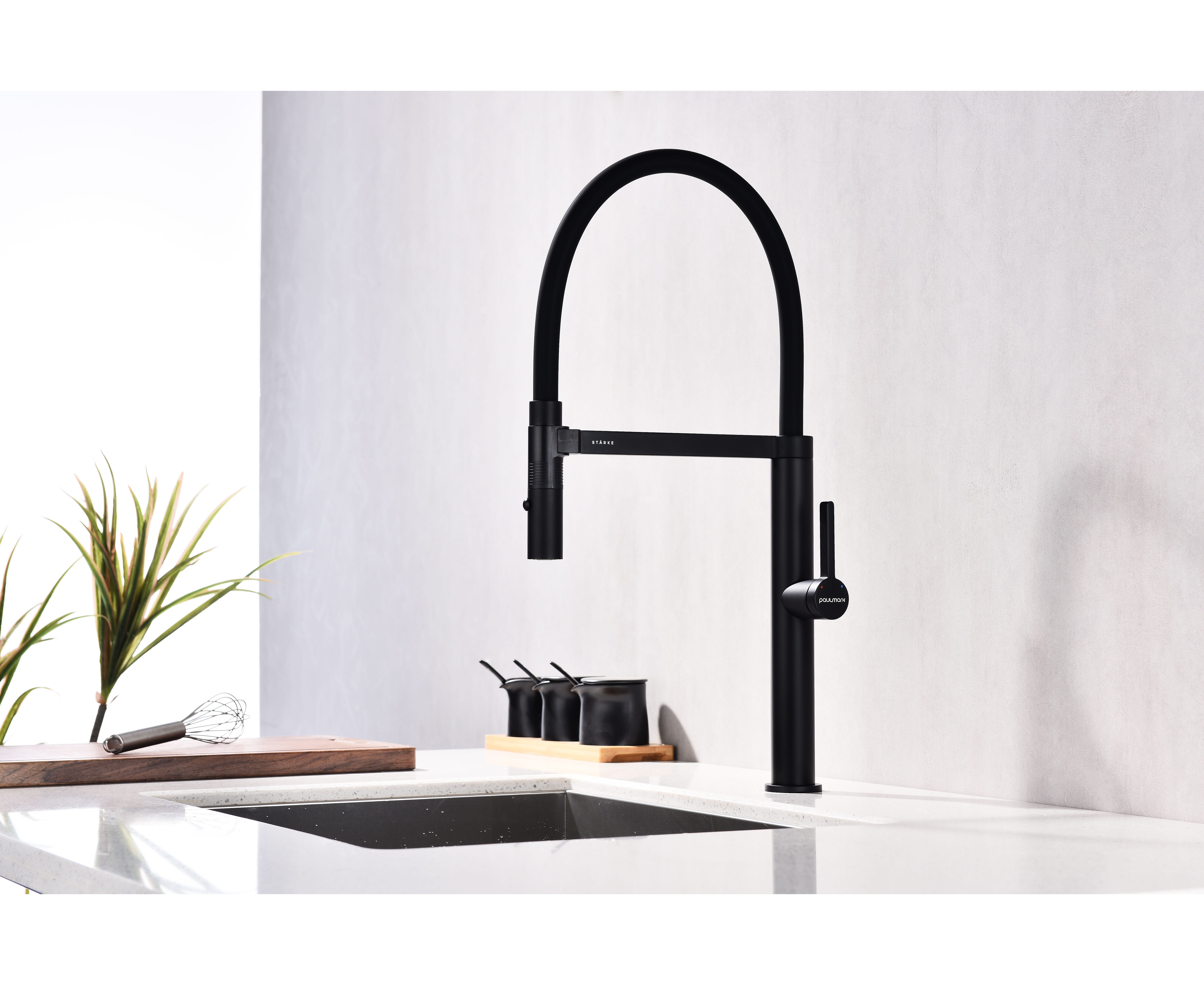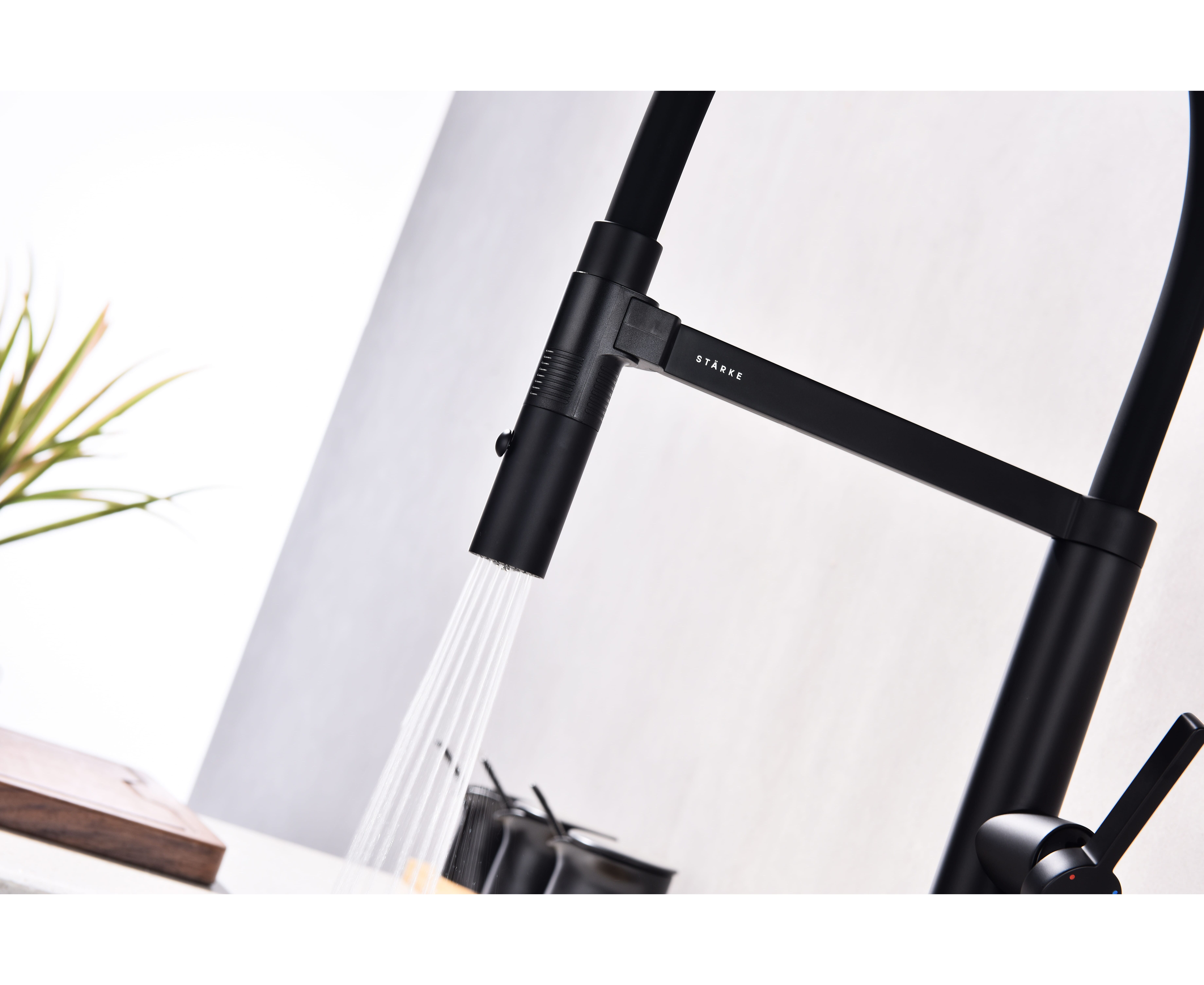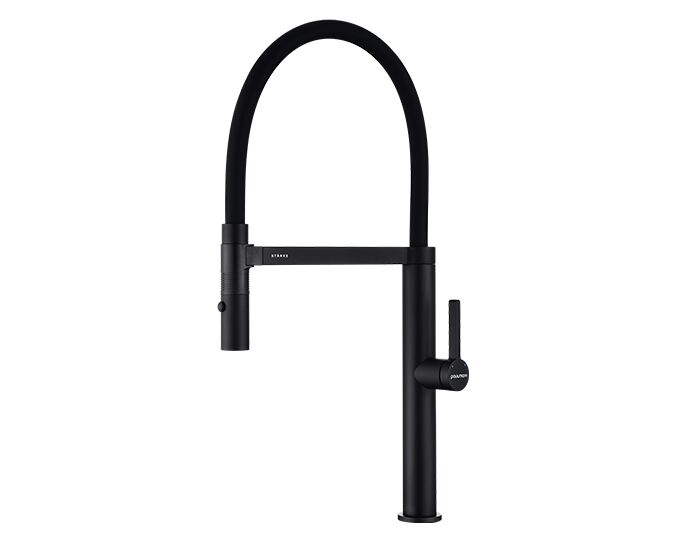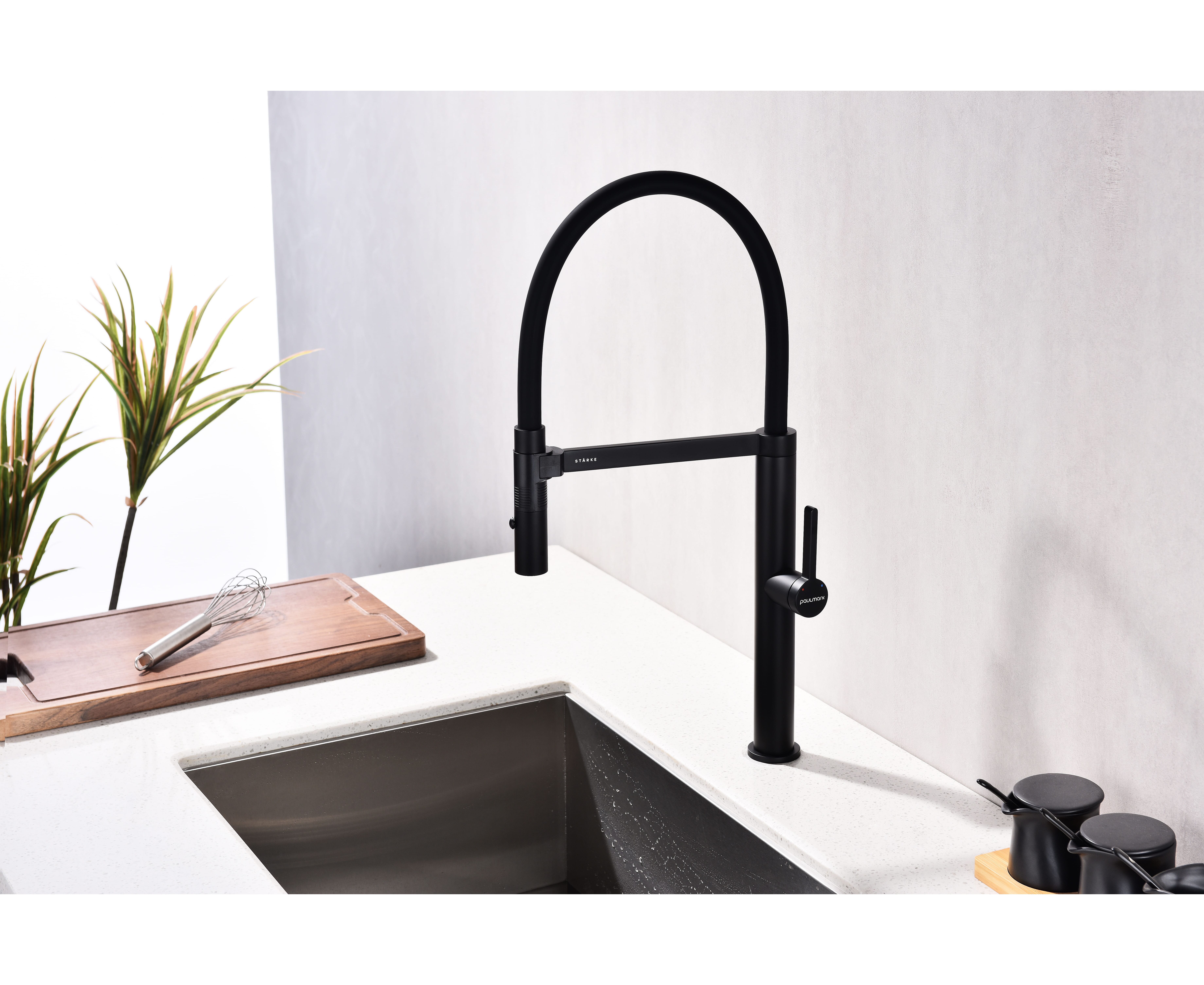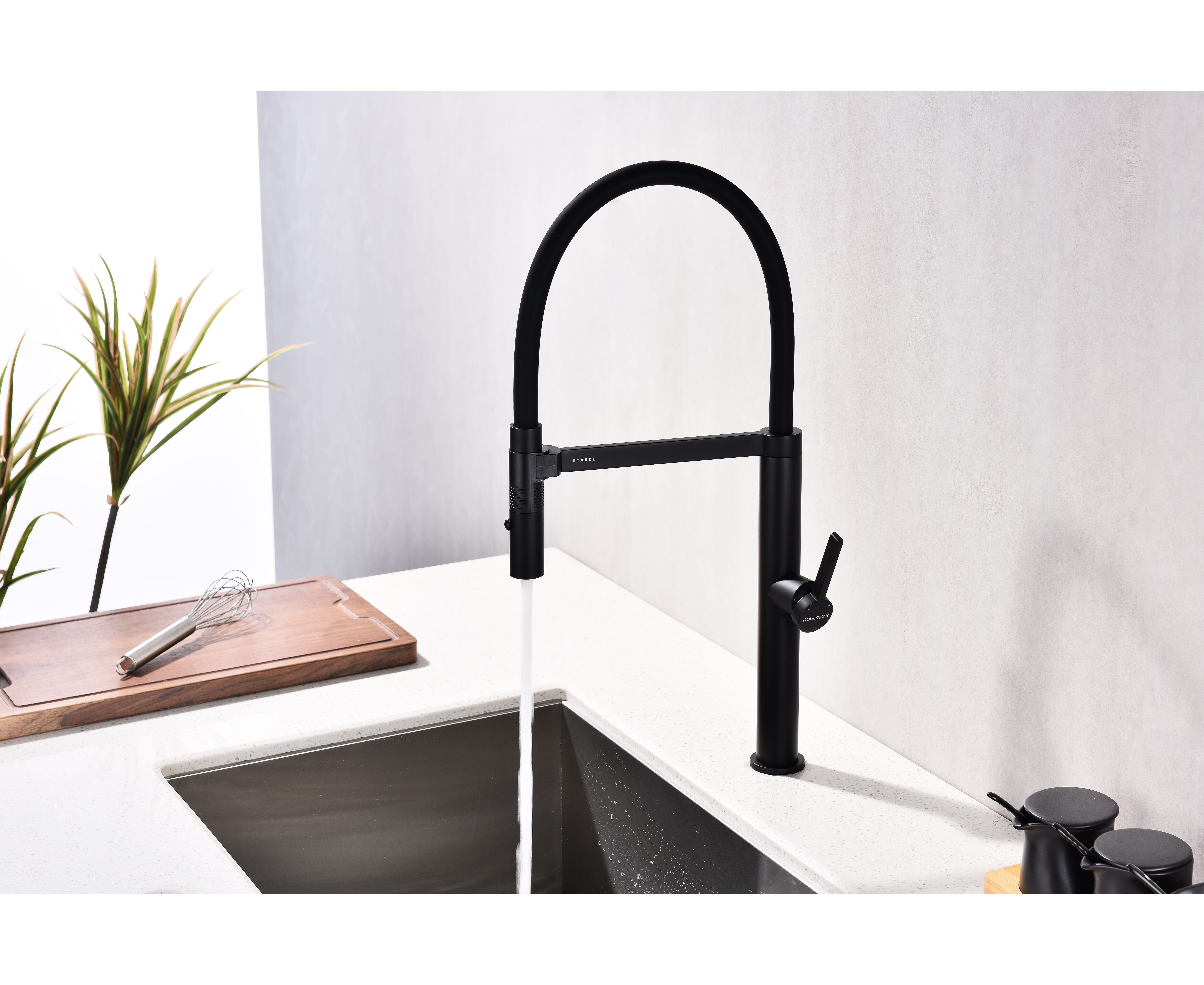 Смеситель с высоким гибким силиконовым изливом, вращающимся на 360°. Магнитный механизм фиксации обеспечивает удобство использования. Два режима подачи воды - мощная струя и экономичный душ - переключаются кнопкой на конце излива.
