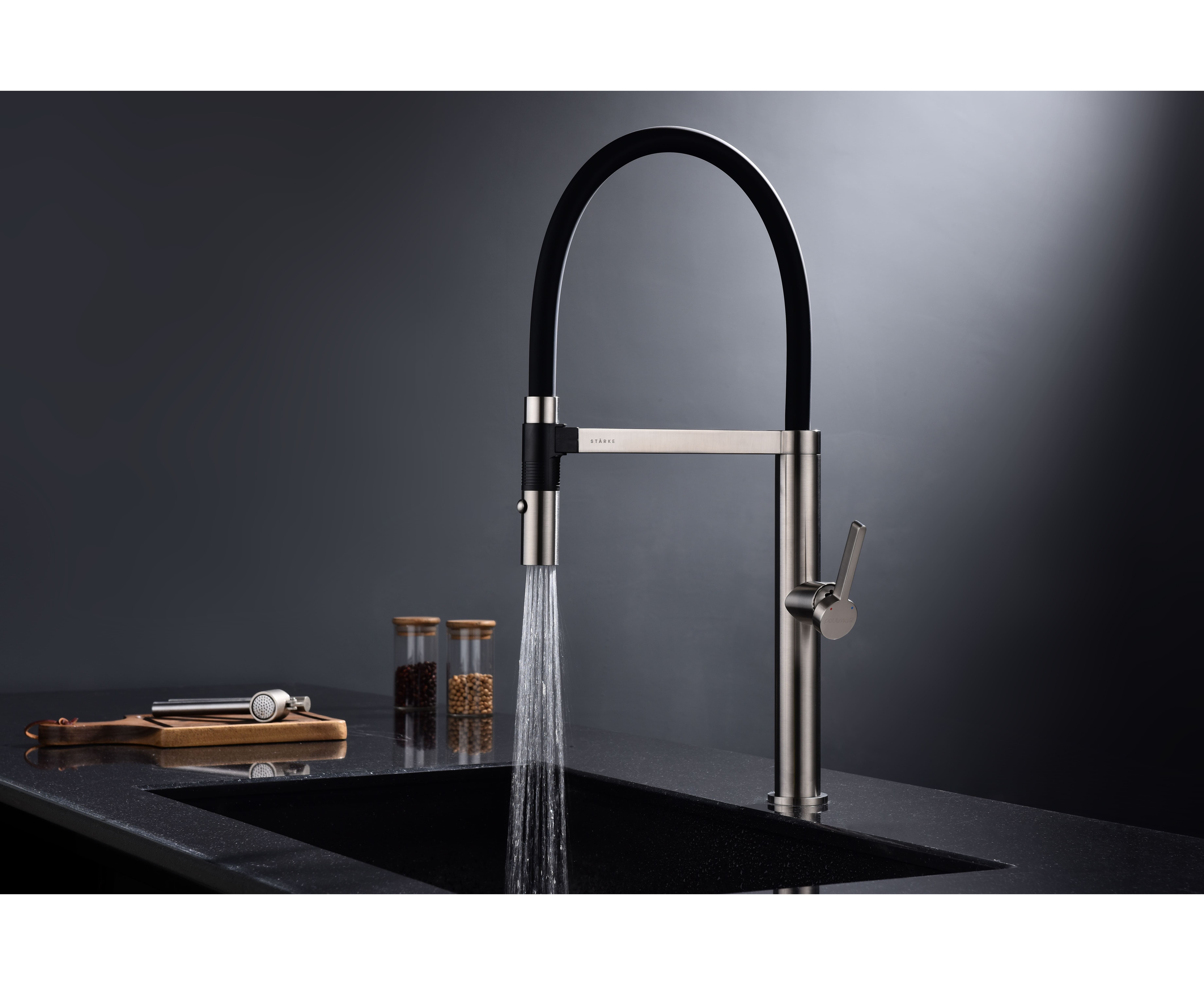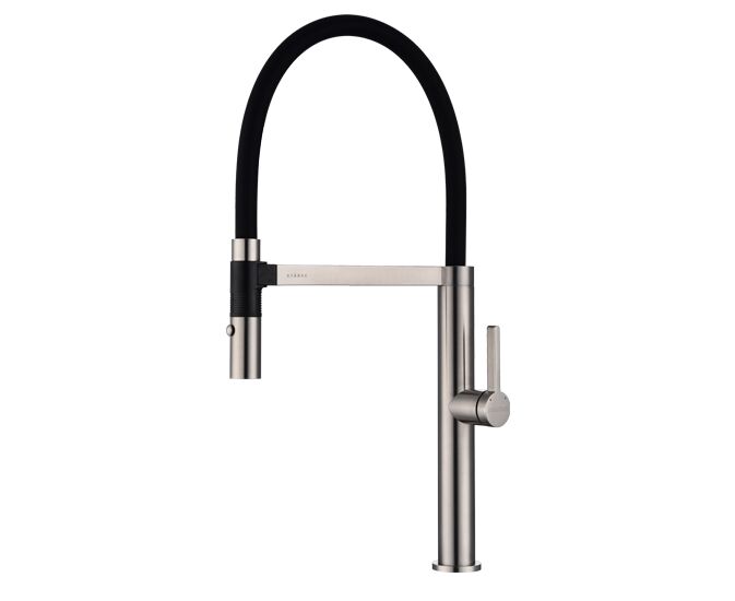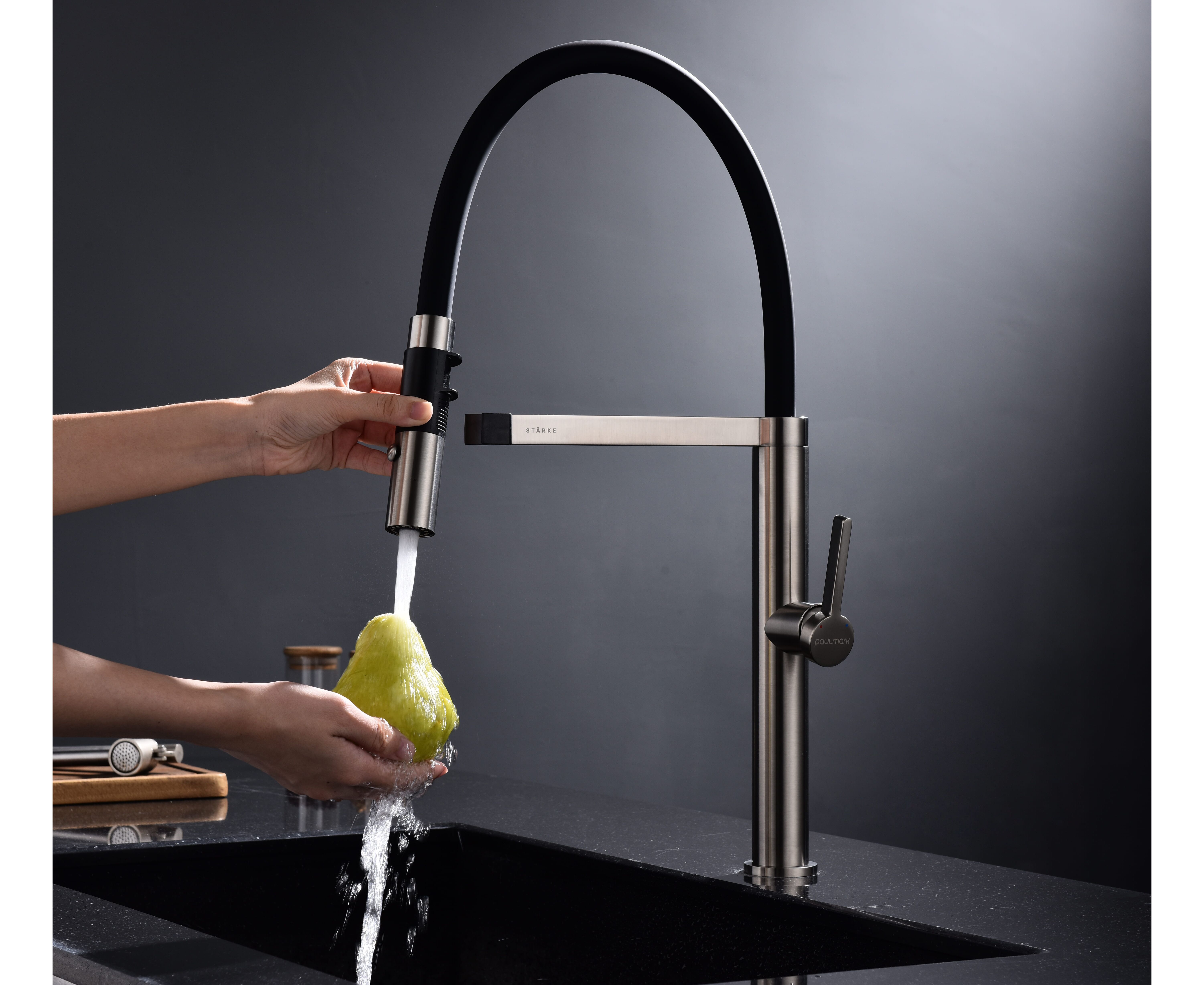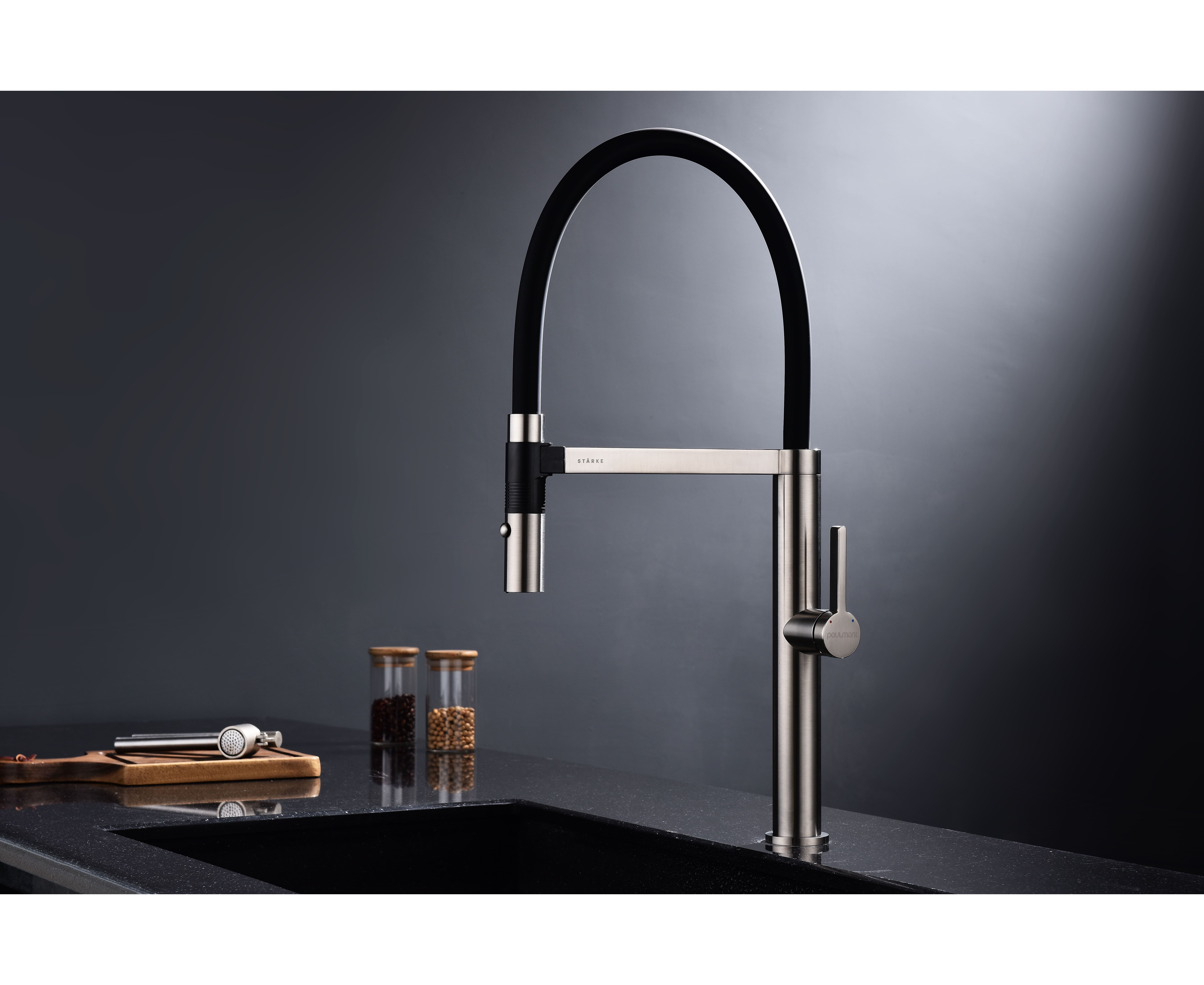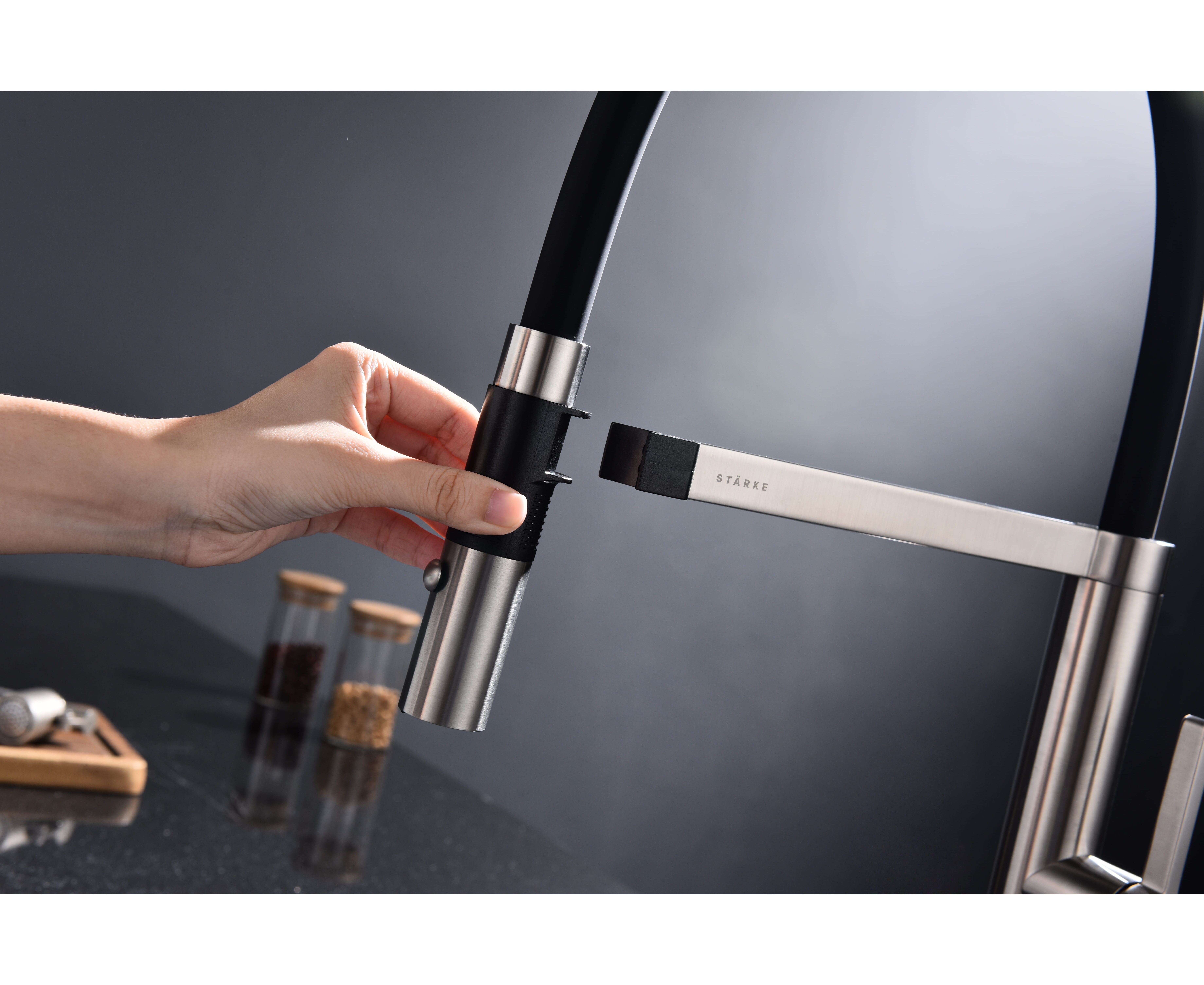 Смеситель с высоким гибким силиконовым изливом, вращающимся на 360°. Магнитный механизм фиксации обеспечивает удобство использования. Два режима подачи воды - мощная струя и экономичный душ - переключаются кнопкой на конце излива.