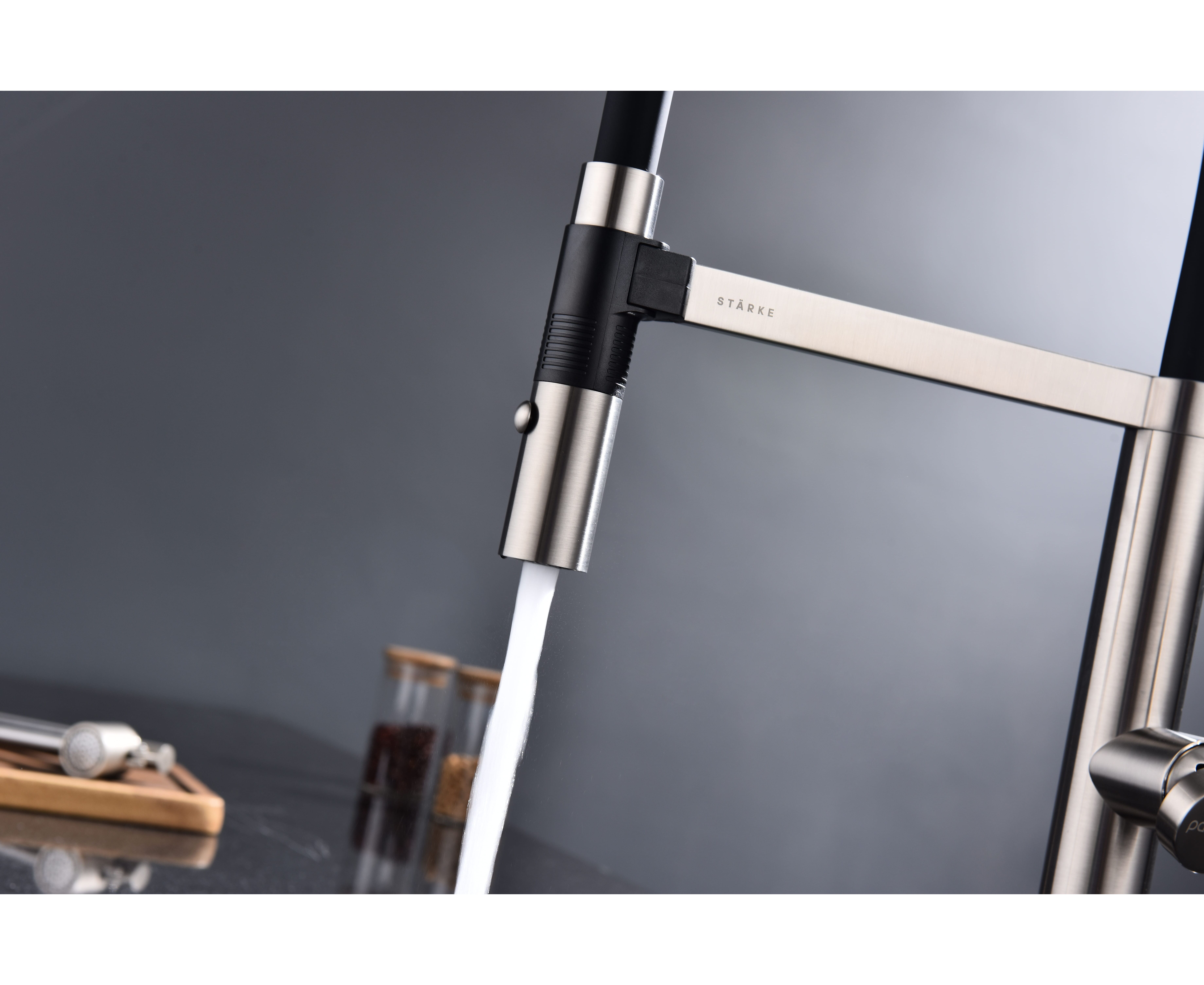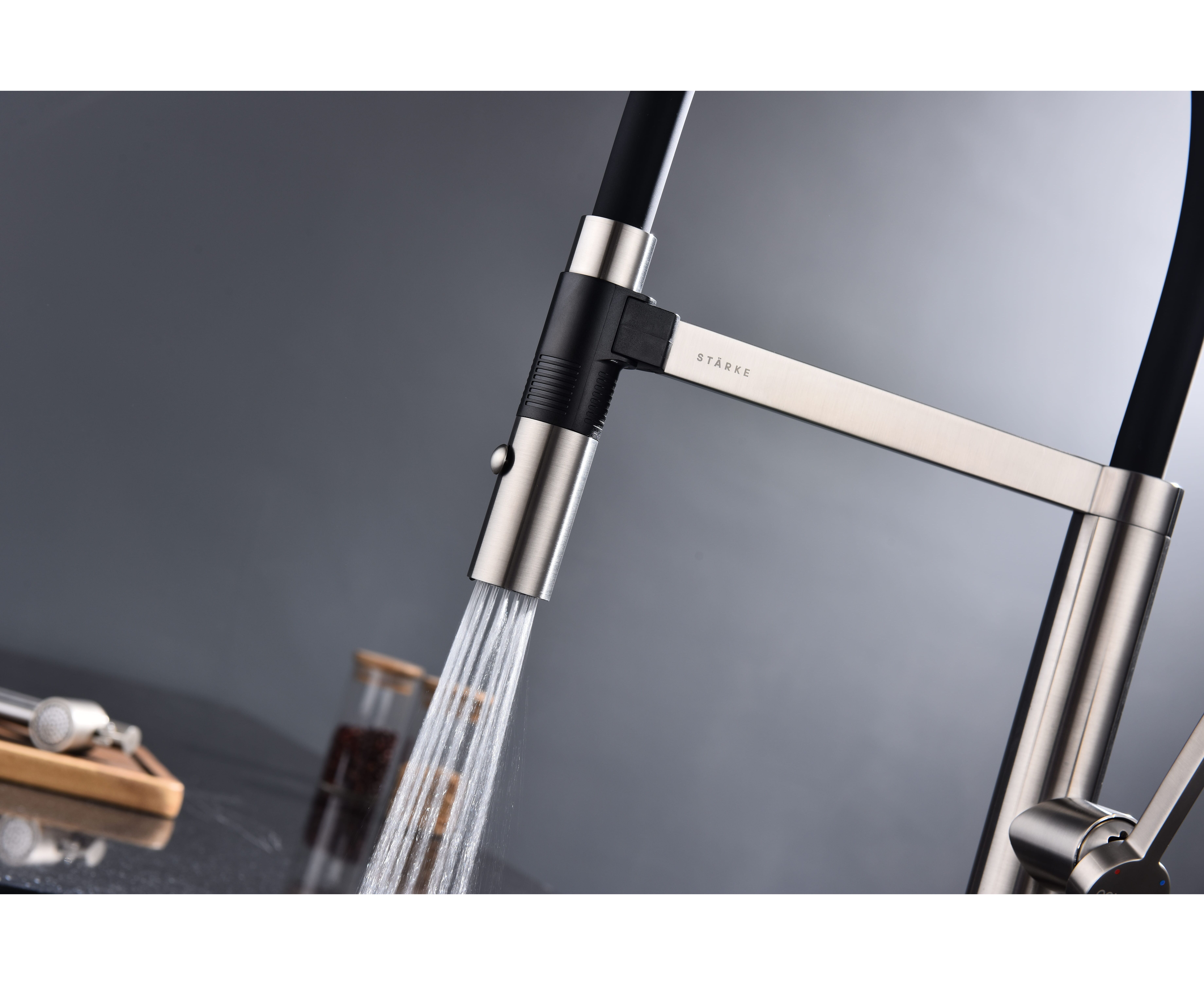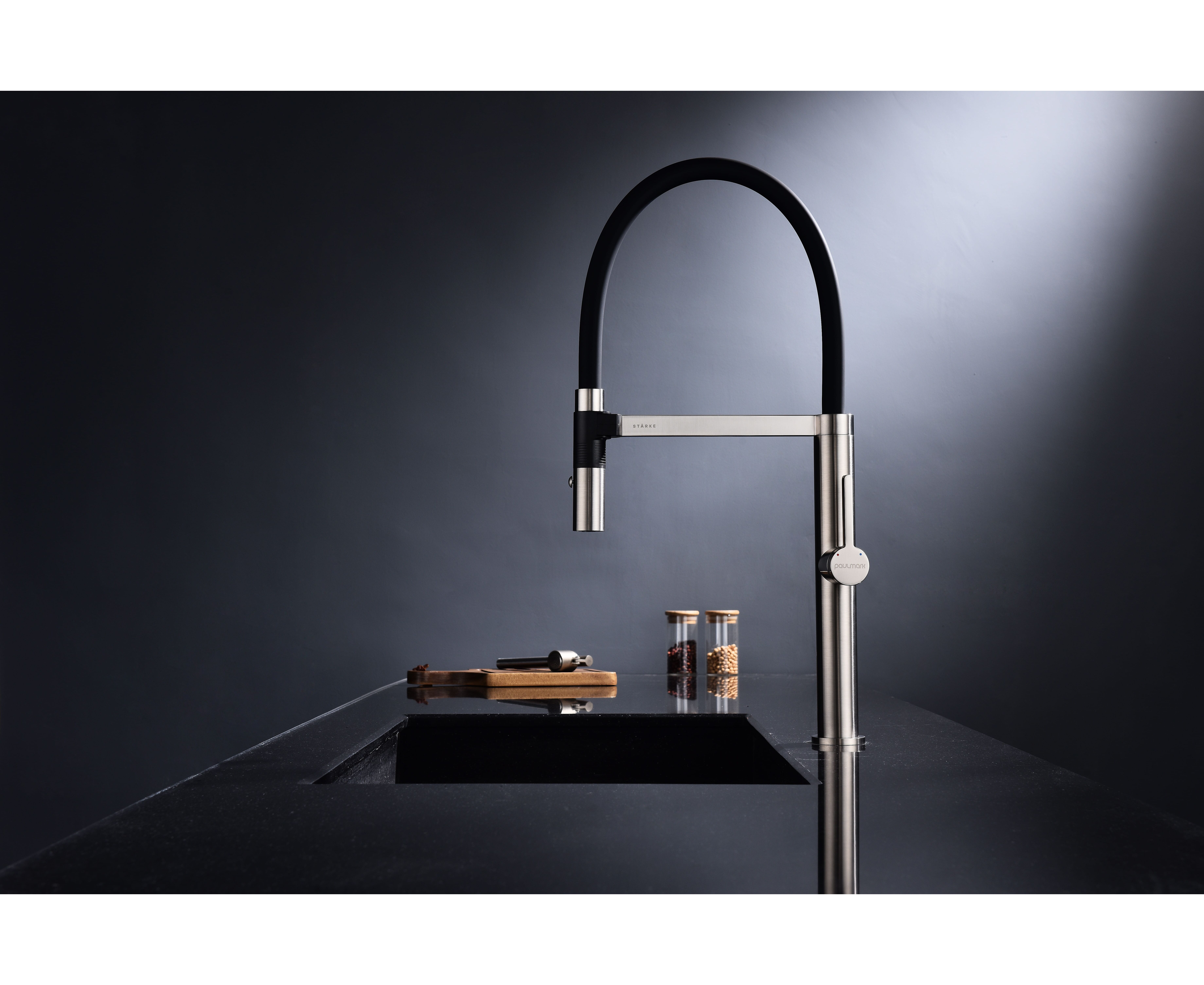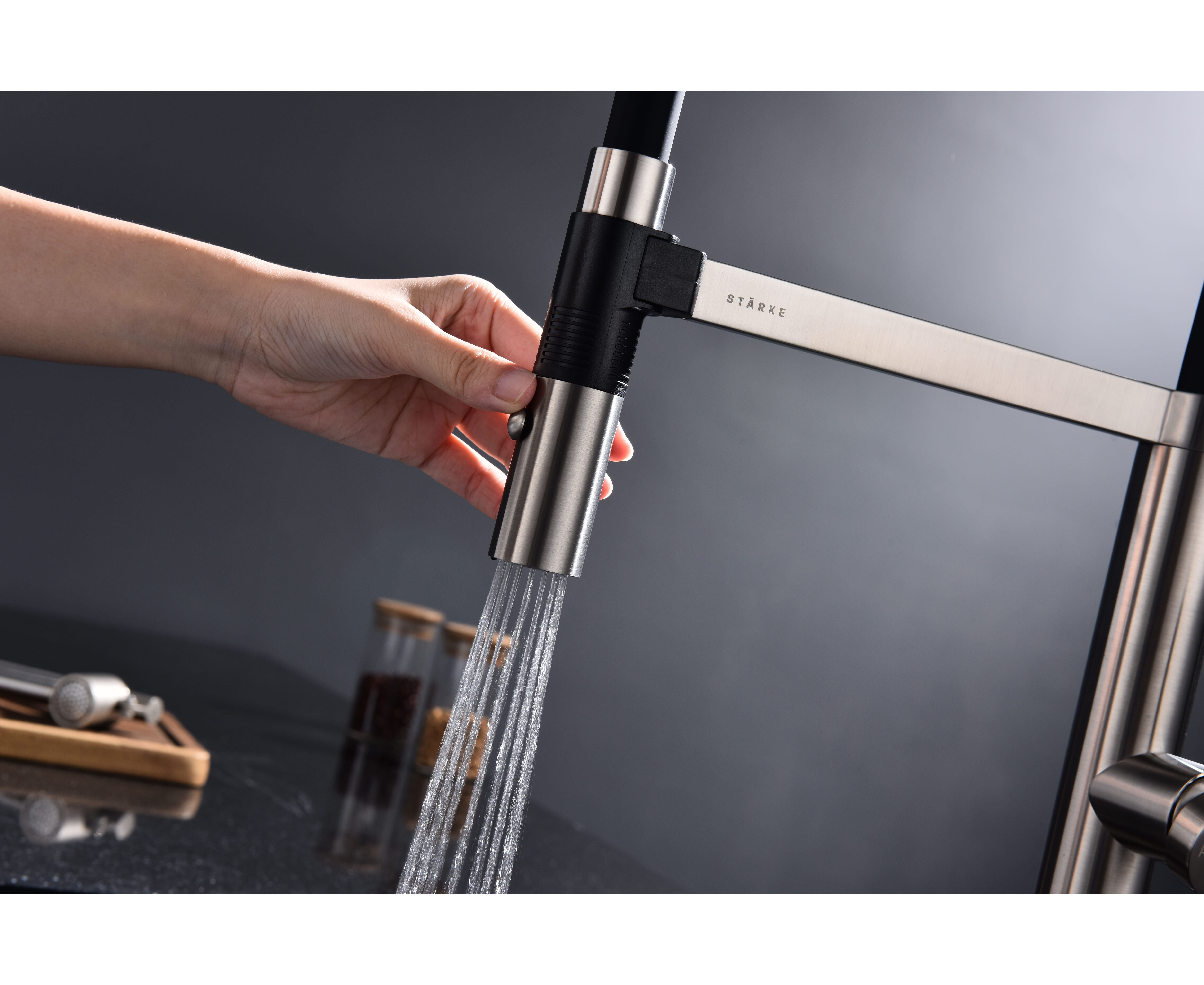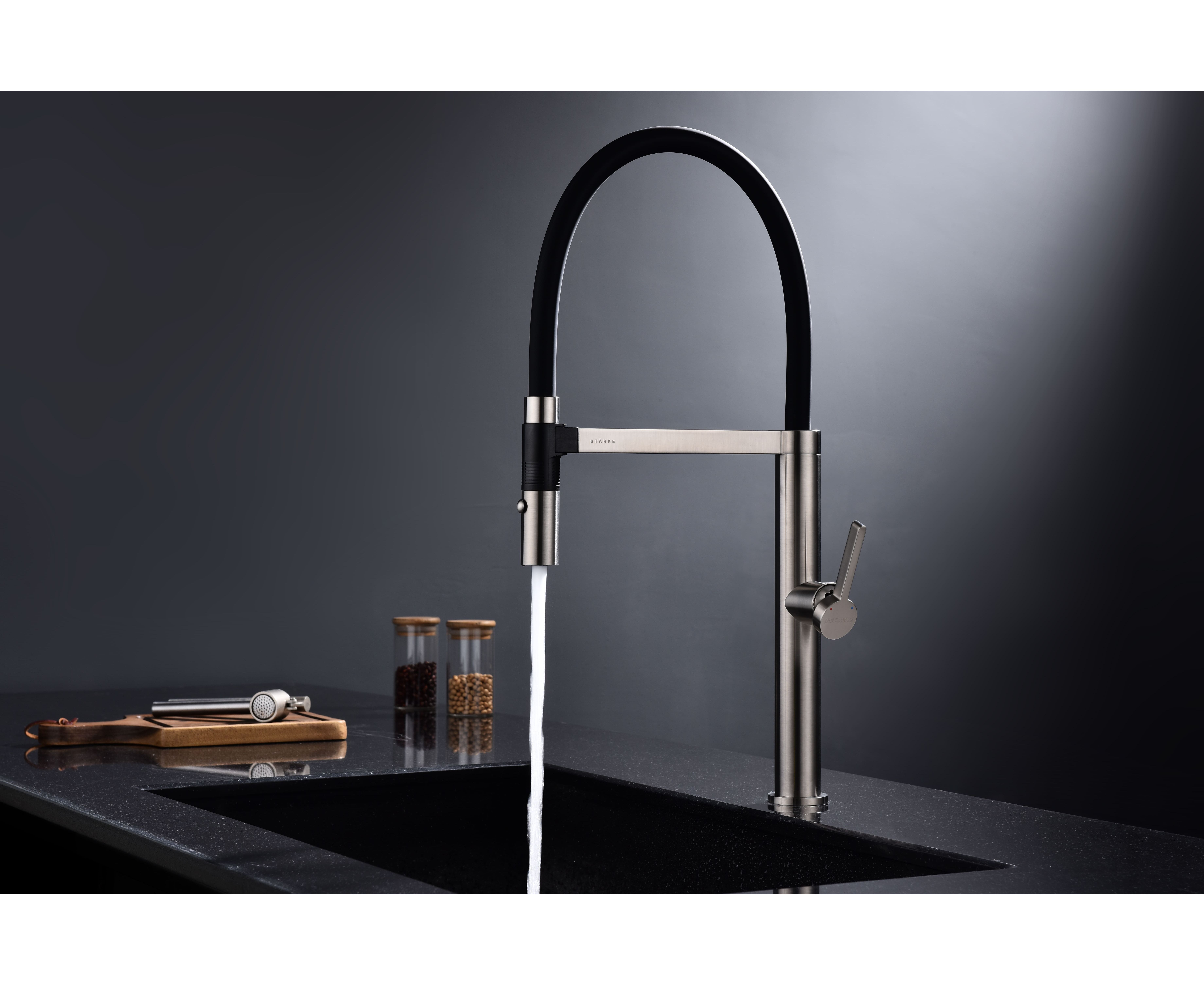 Смеситель с высоким гибким силиконовым изливом, вращающимся на 360°. Магнитный механизм фиксации обеспечивает удобство использования. Два режима подачи воды - мощная струя и экономичный душ - переключаются кнопкой на конце излива.