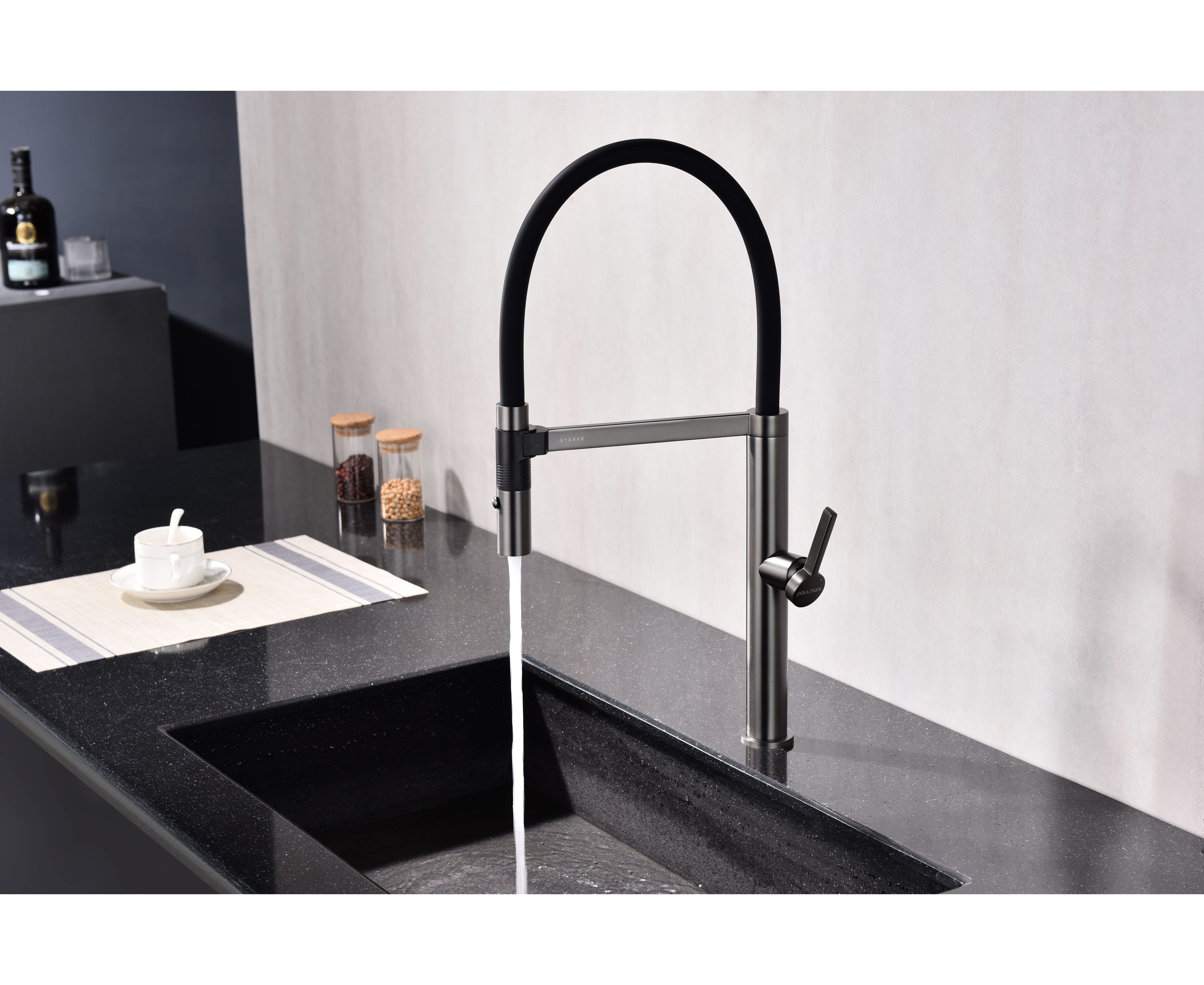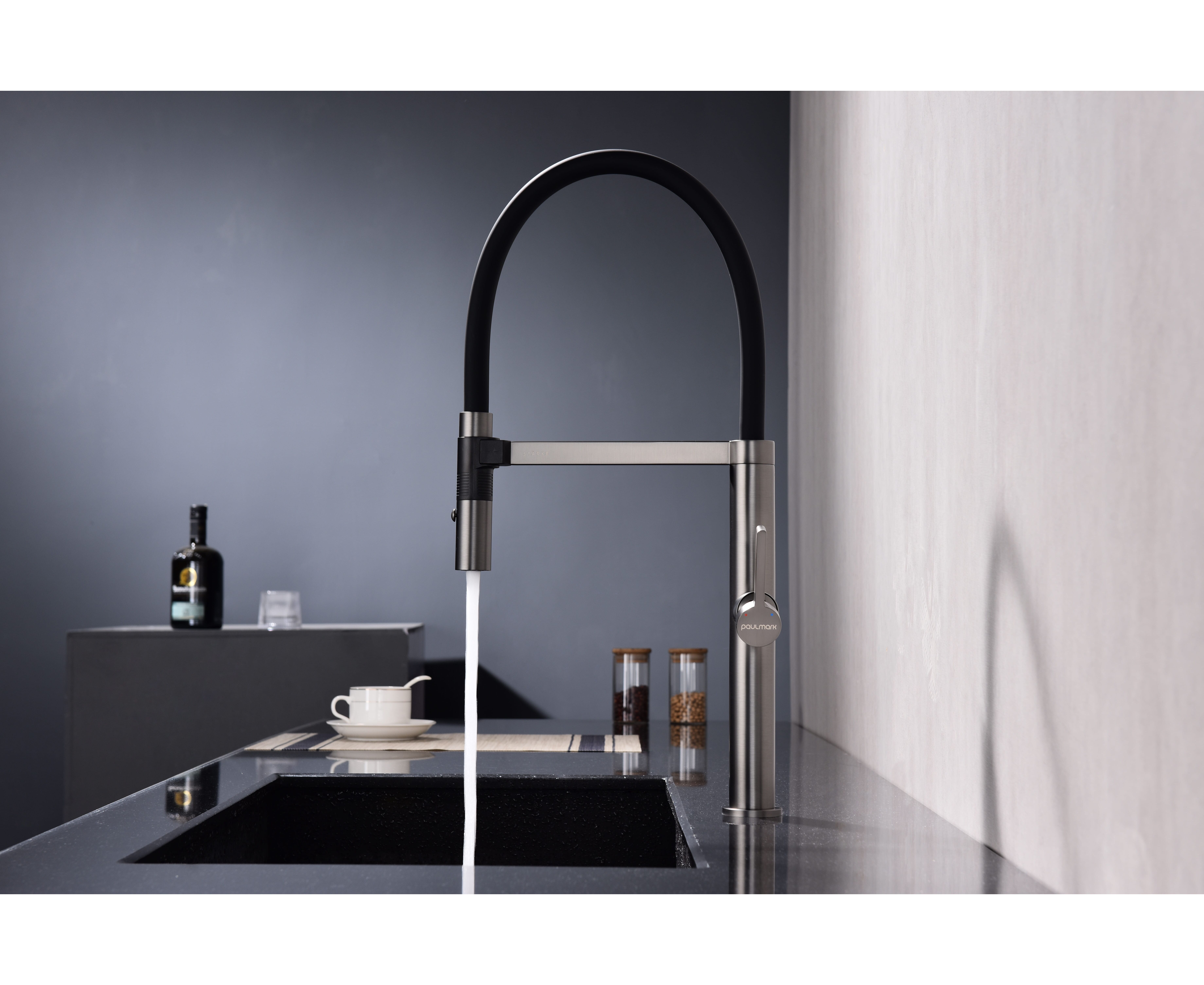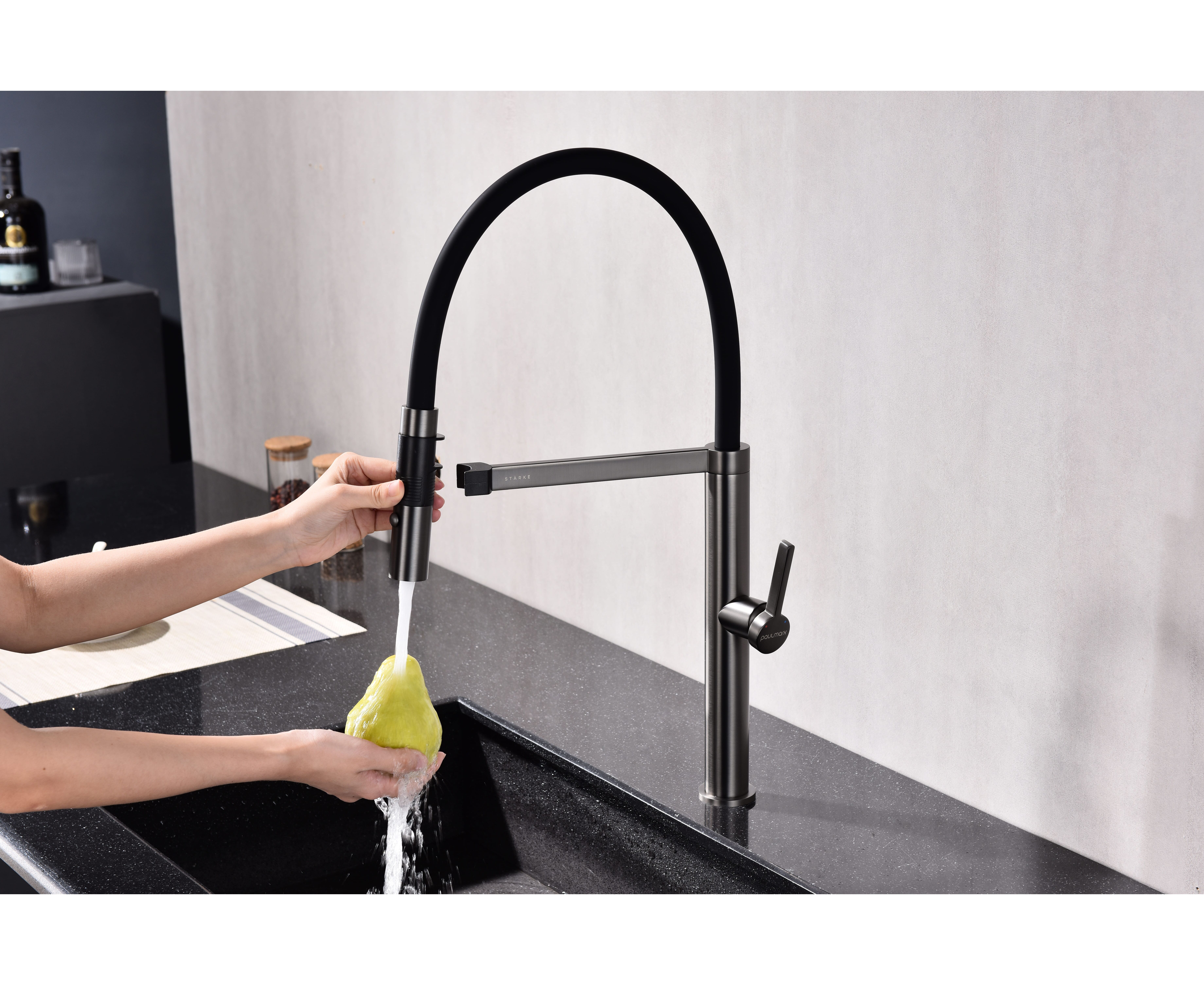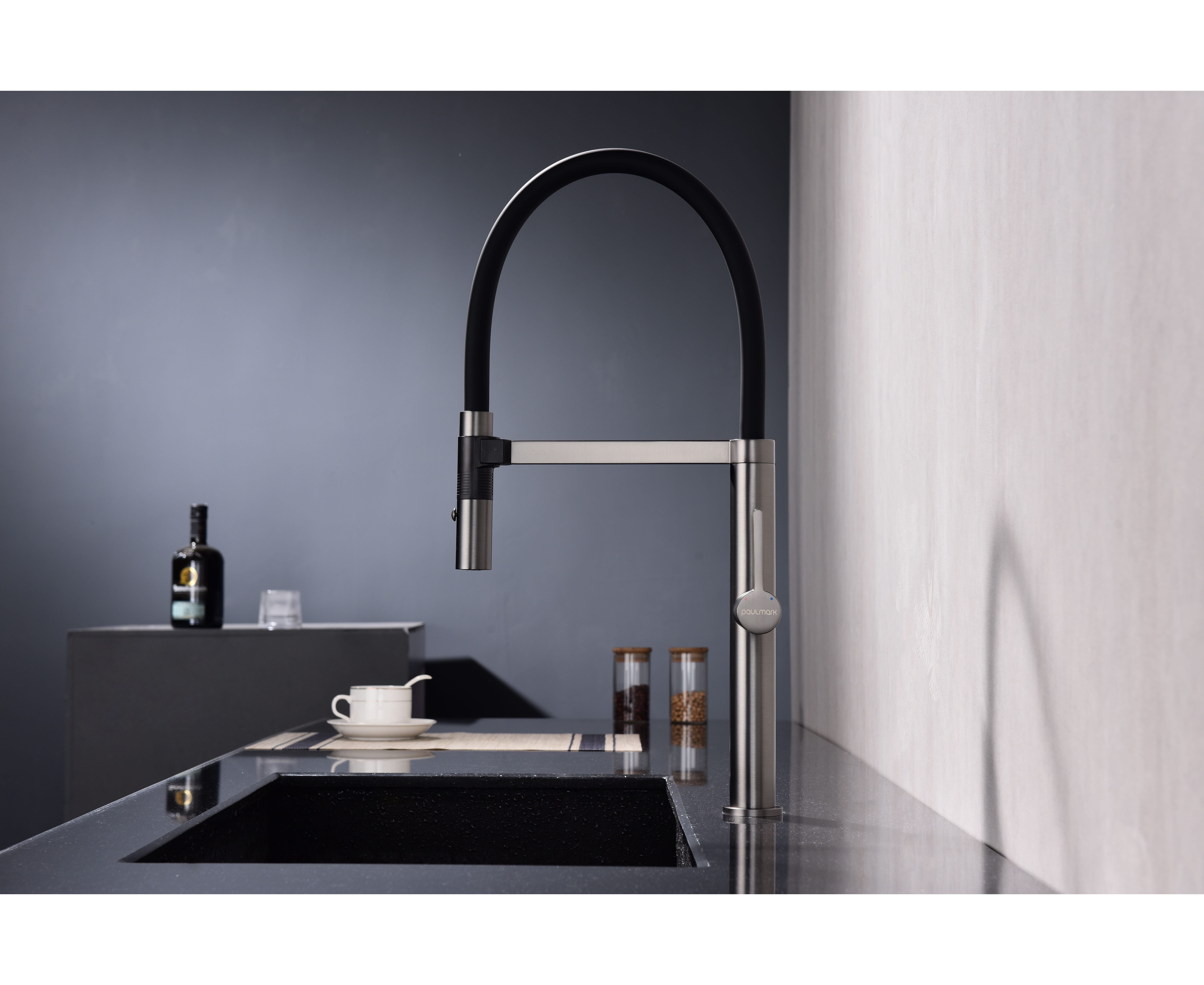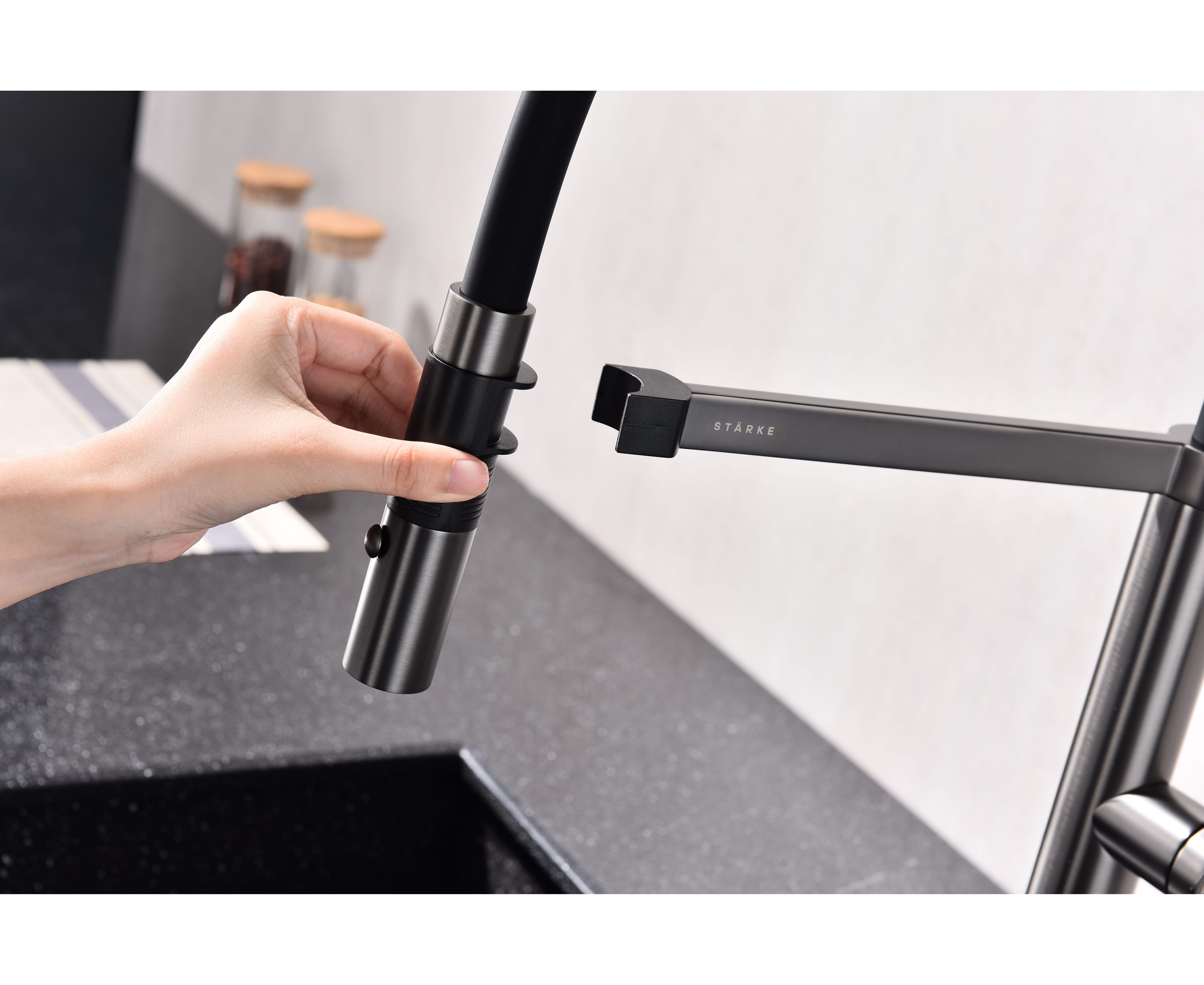 Смеситель с высоким гибким силиконовым изливом, вращающимся на 360°. Магнитный механизм фиксации обеспечивает удобство использования. Два режима подачи воды - мощная струя и экономичный душ - переключаются кнопкой на конце излива.
