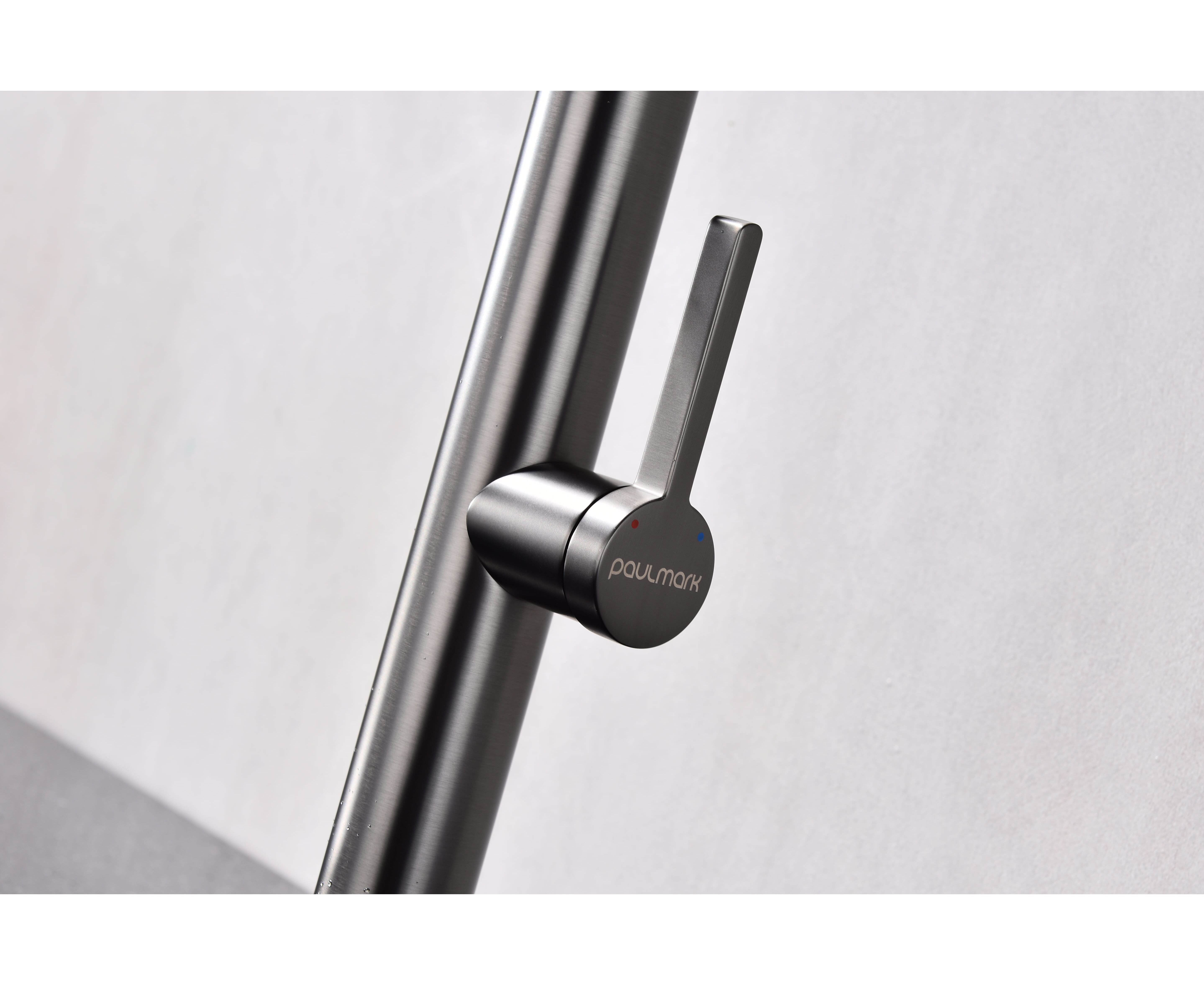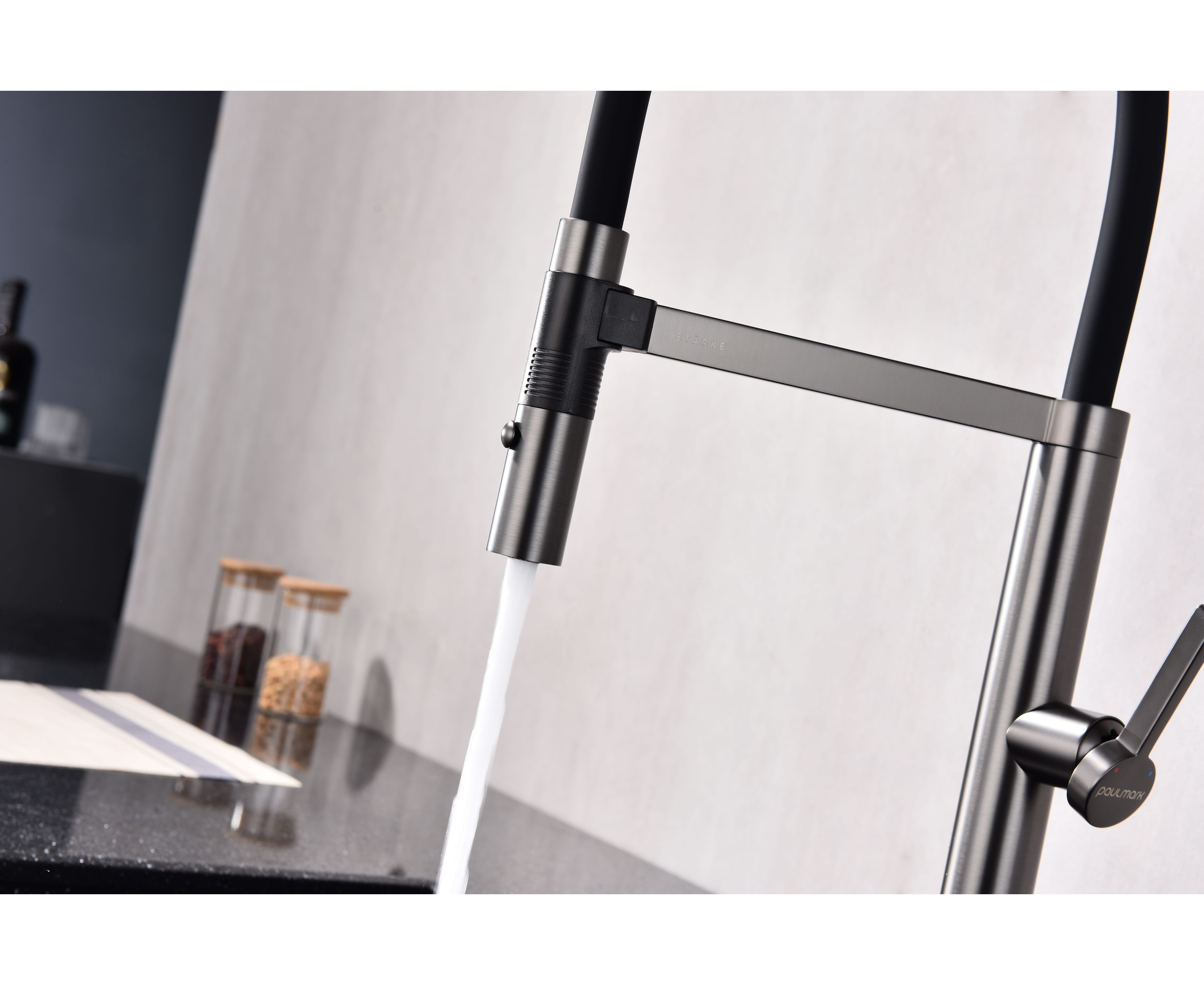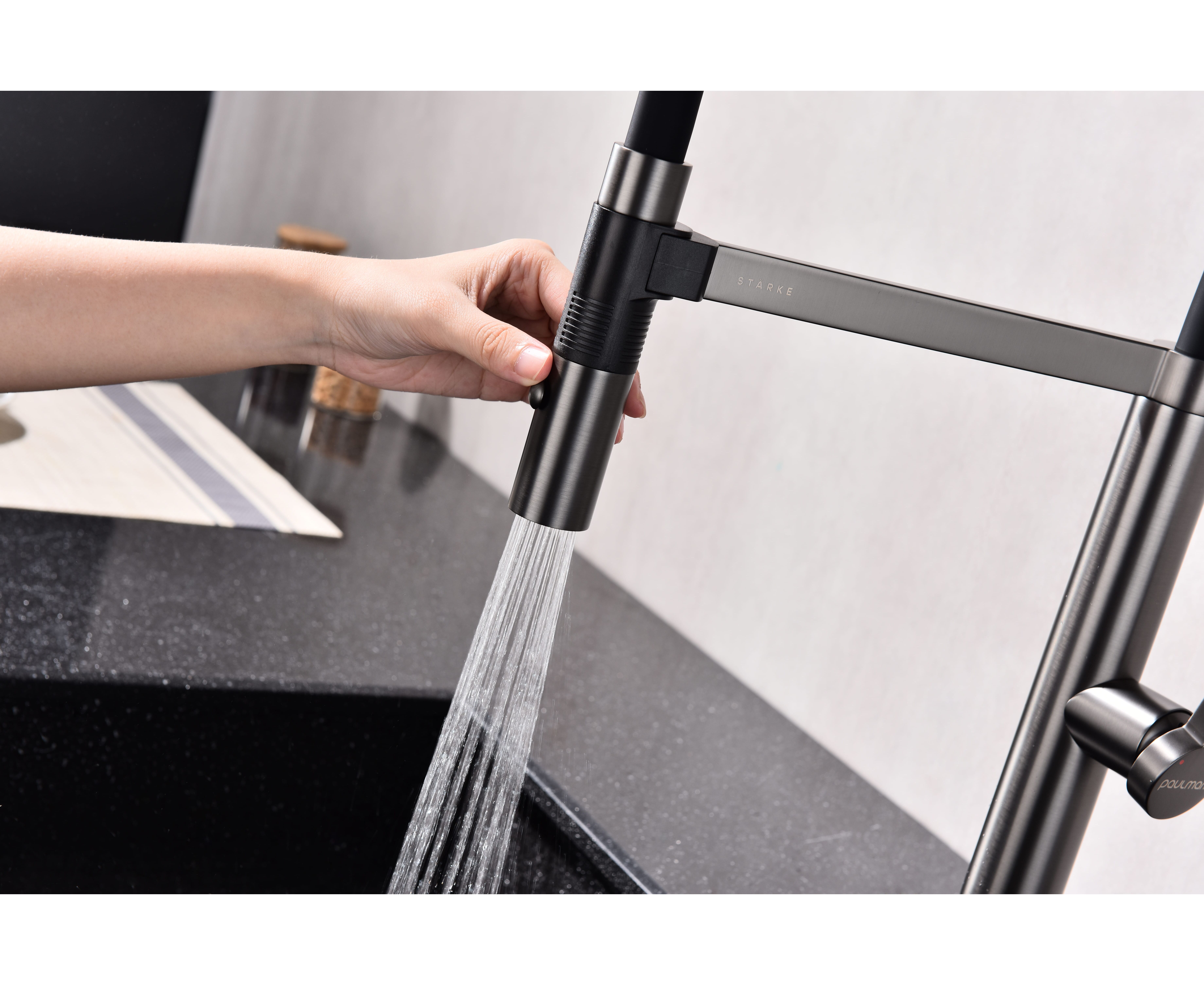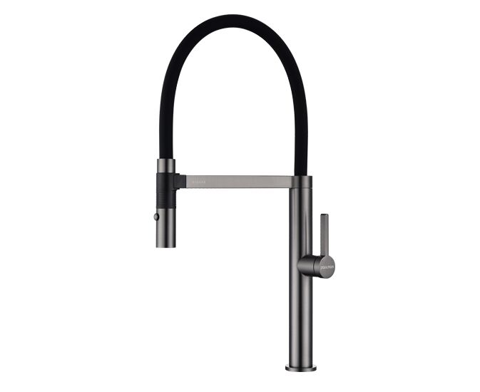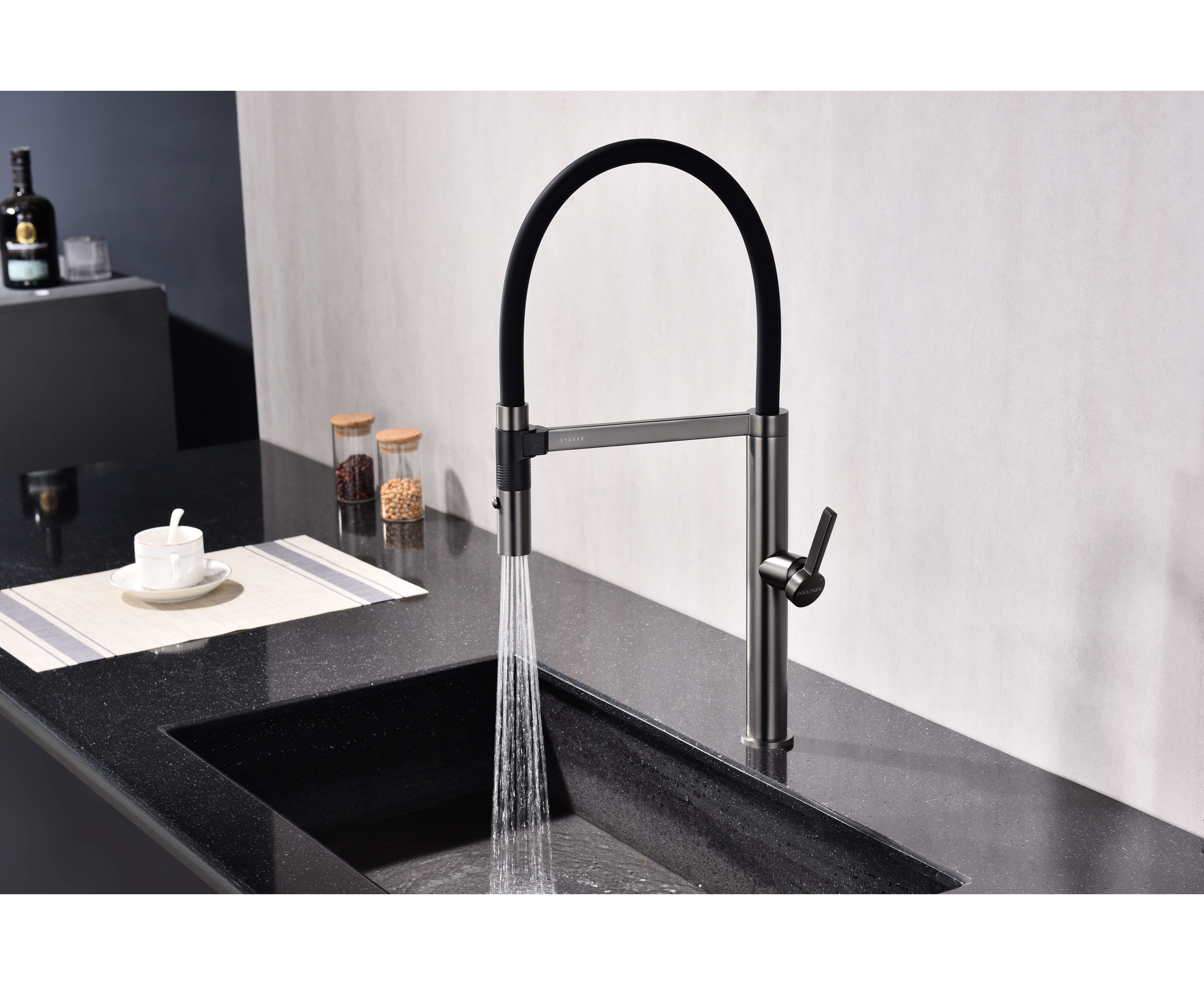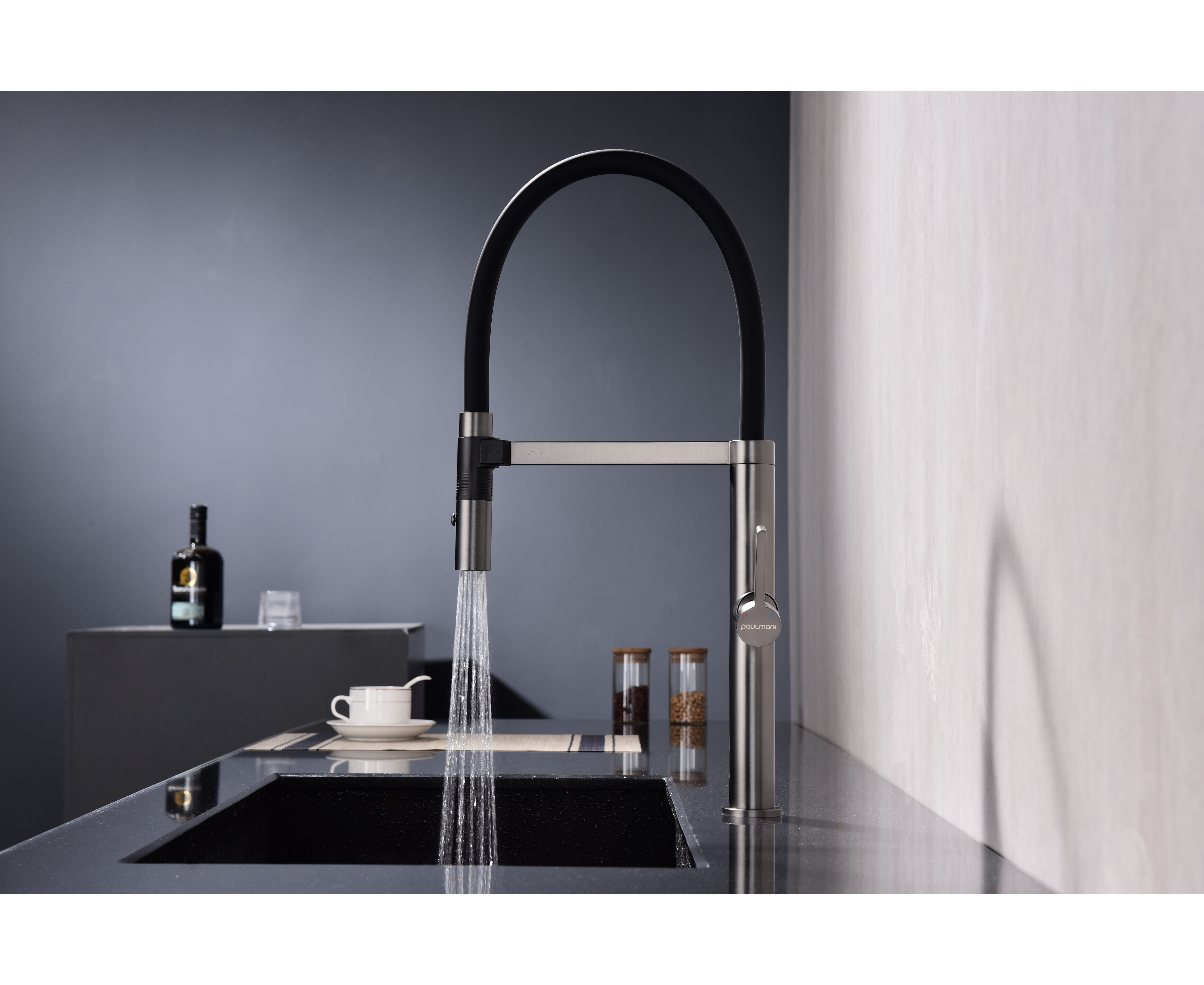 Смеситель с высоким гибким силиконовым изливом, вращающимся на 360°. Магнитный механизм фиксации обеспечивает удобство использования. Два режима подачи воды - мощная струя и экономичный душ - переключаются кнопкой на конце излива.