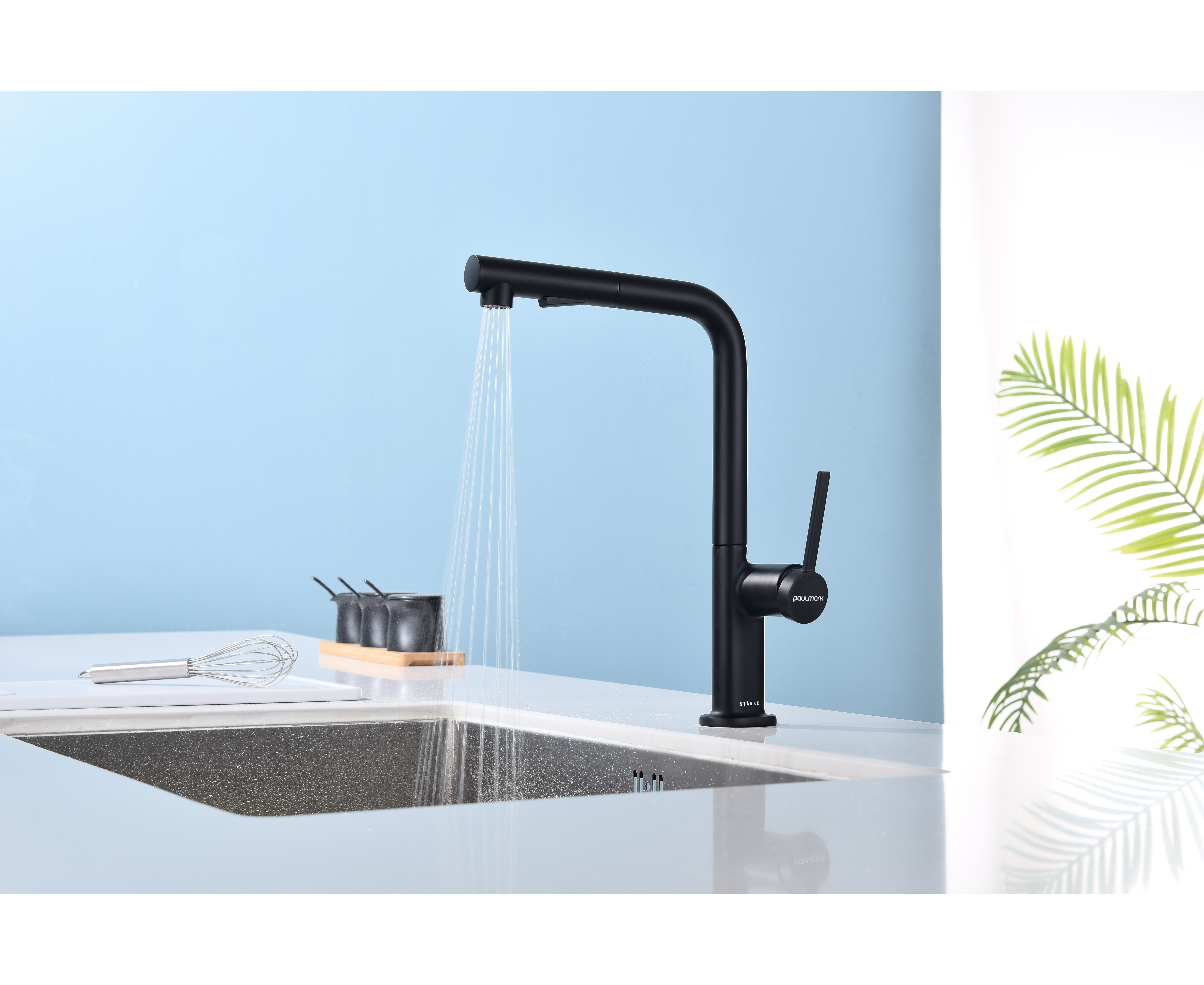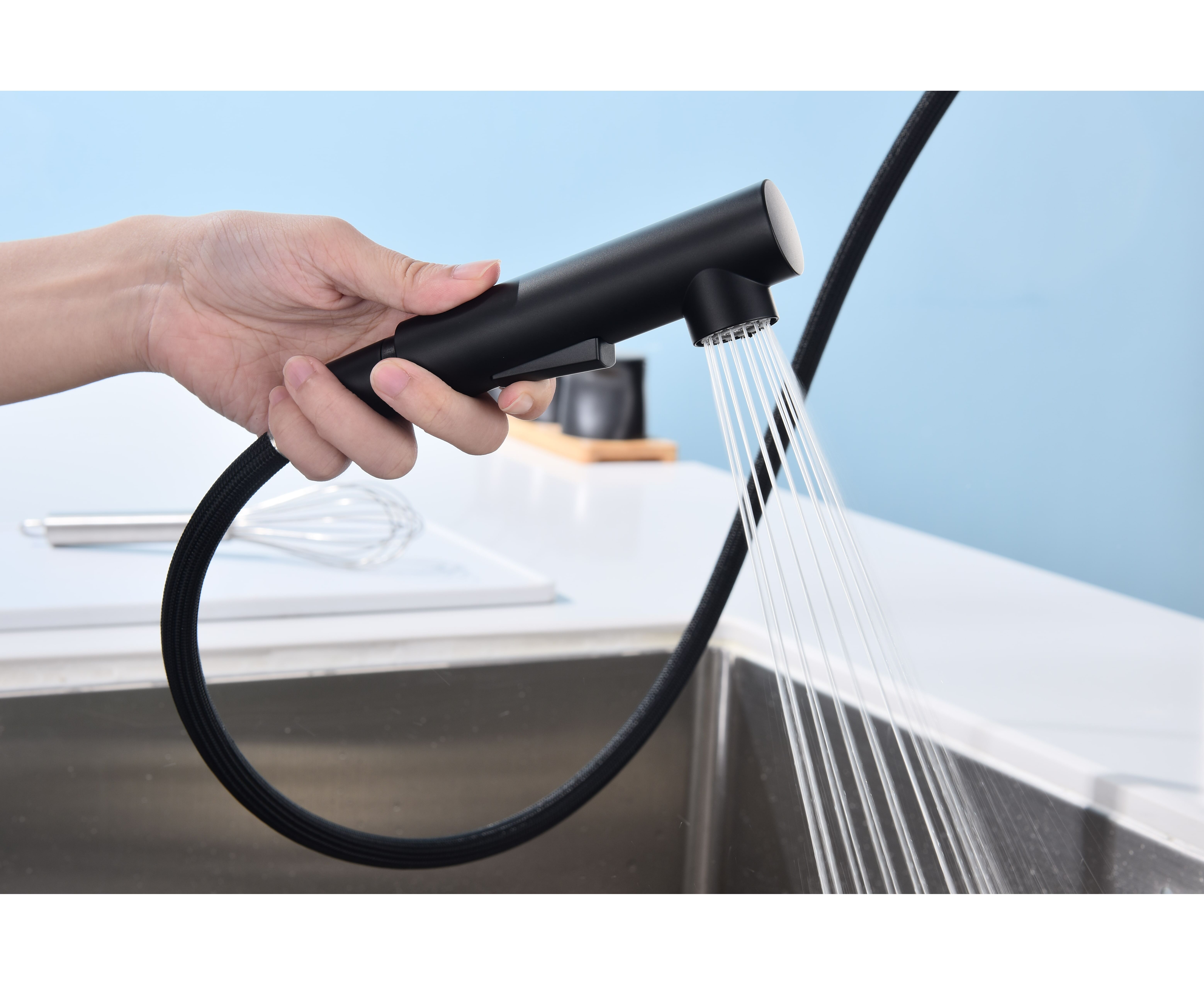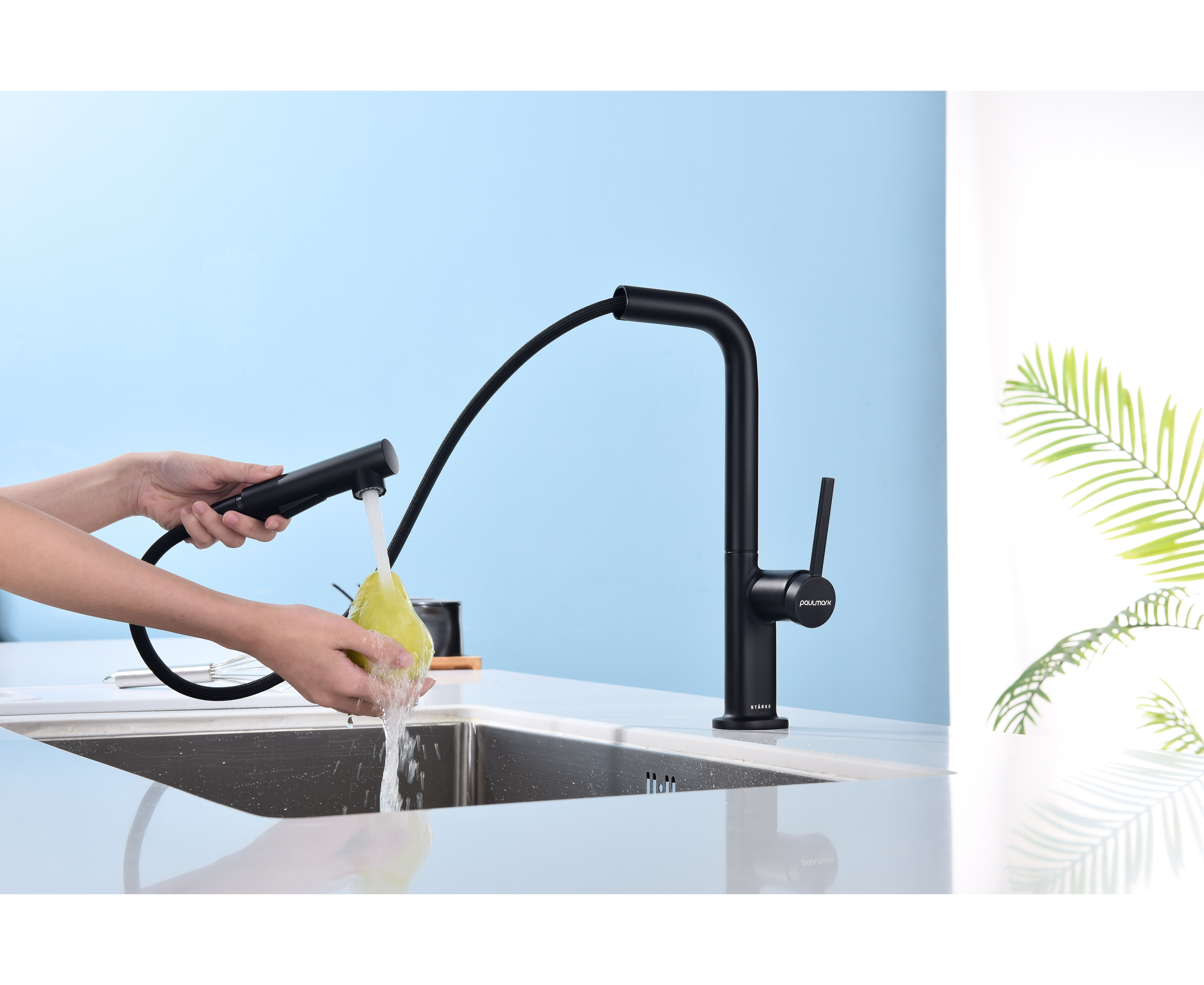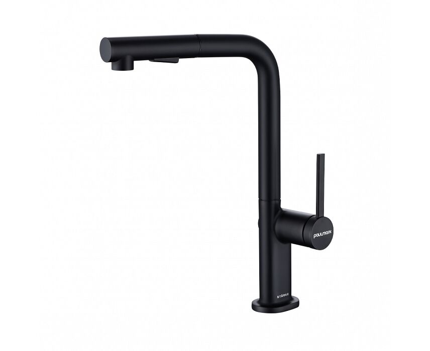 Смеситель латунный с Г-образным поворотным изливом, вращающимся на 180°, и выдвижной лейкой с двумя режимами подачи воды. Переключение между мощной струей и деликатным душем осуществляется эргономичной кнопкой. Функционал смесителя обеспечивает комфорт при мытье посуды, продуктов и уходе за мойкой.