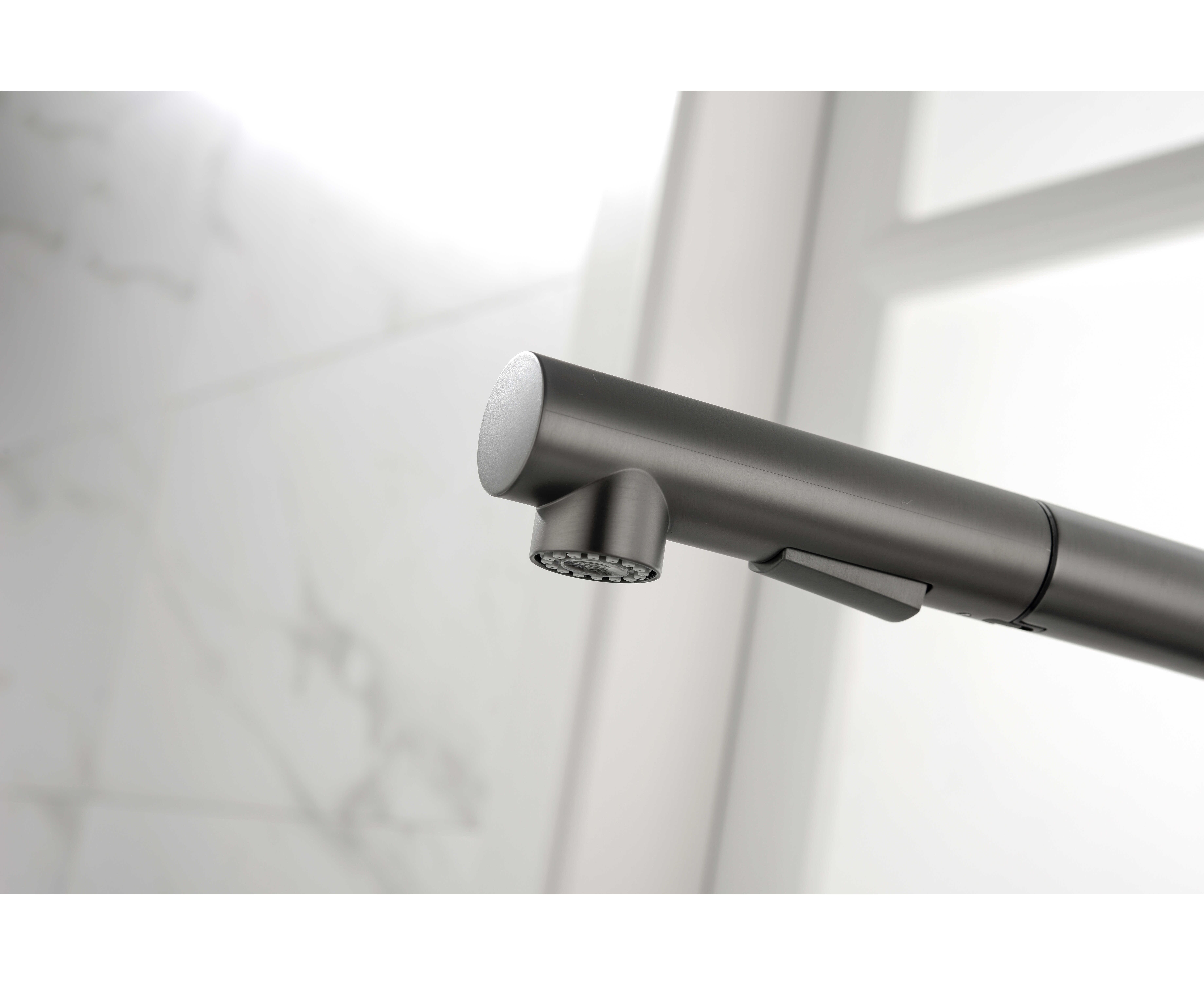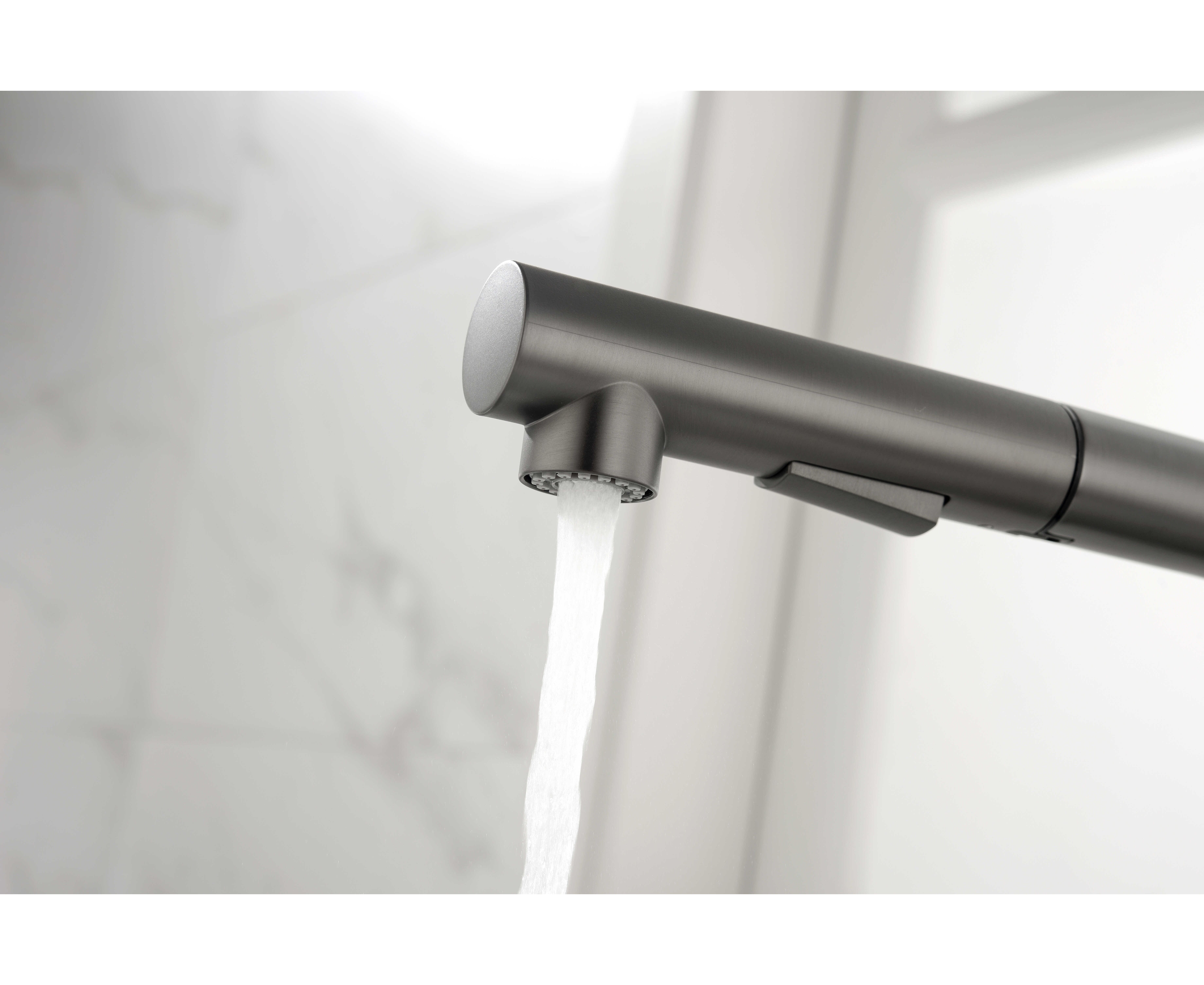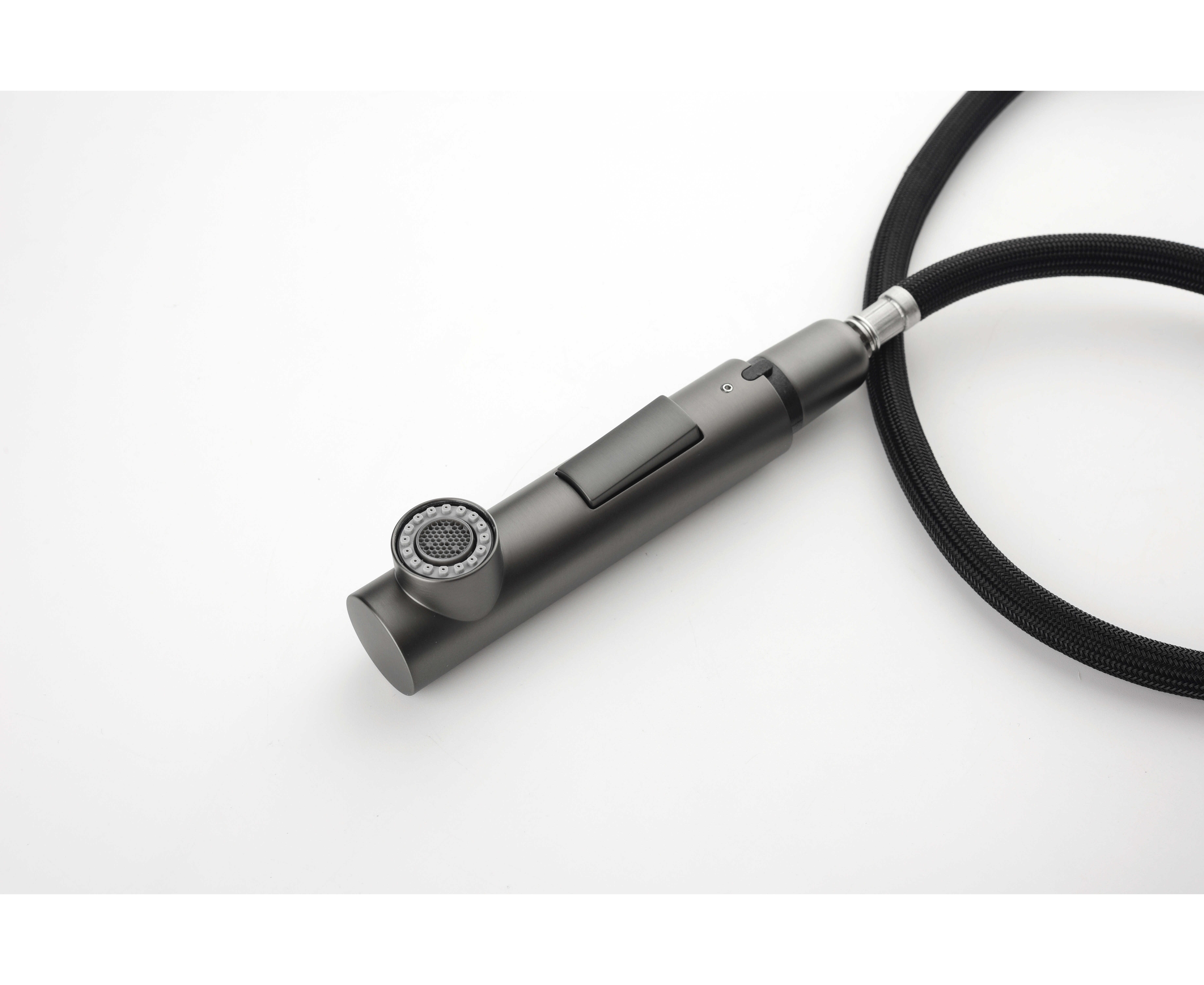 Смеситель латунный с Г-образным поворотным изливом, вращающимся на 180°, и выдвижной лейкой с двумя режимами подачи воды. Переключение между мощной струей и деликатным душем осуществляется эргономичной кнопкой. Функционал смесителя обеспечивает комфорт при мытье посуды, продуктов и уходе за мойкой.