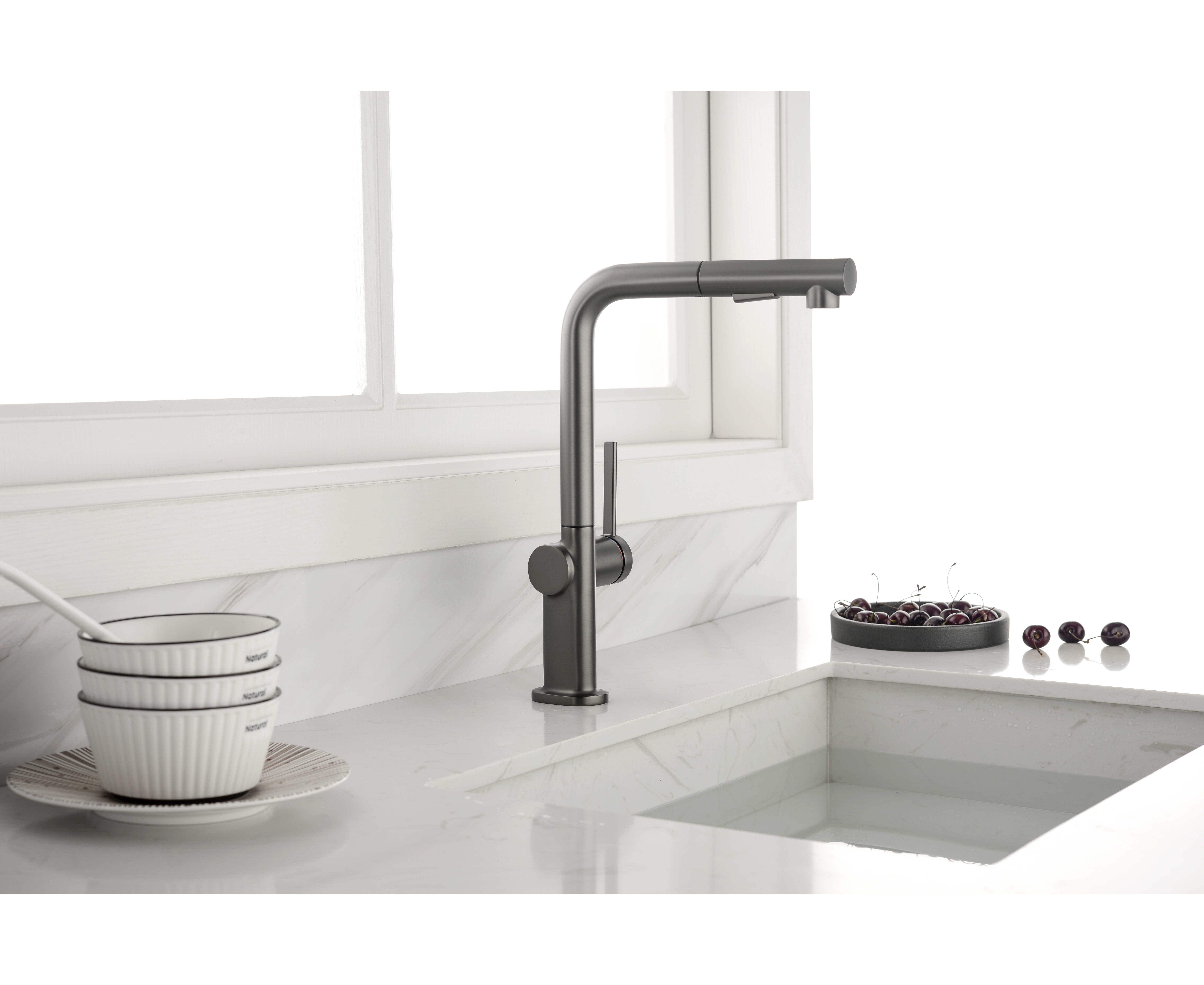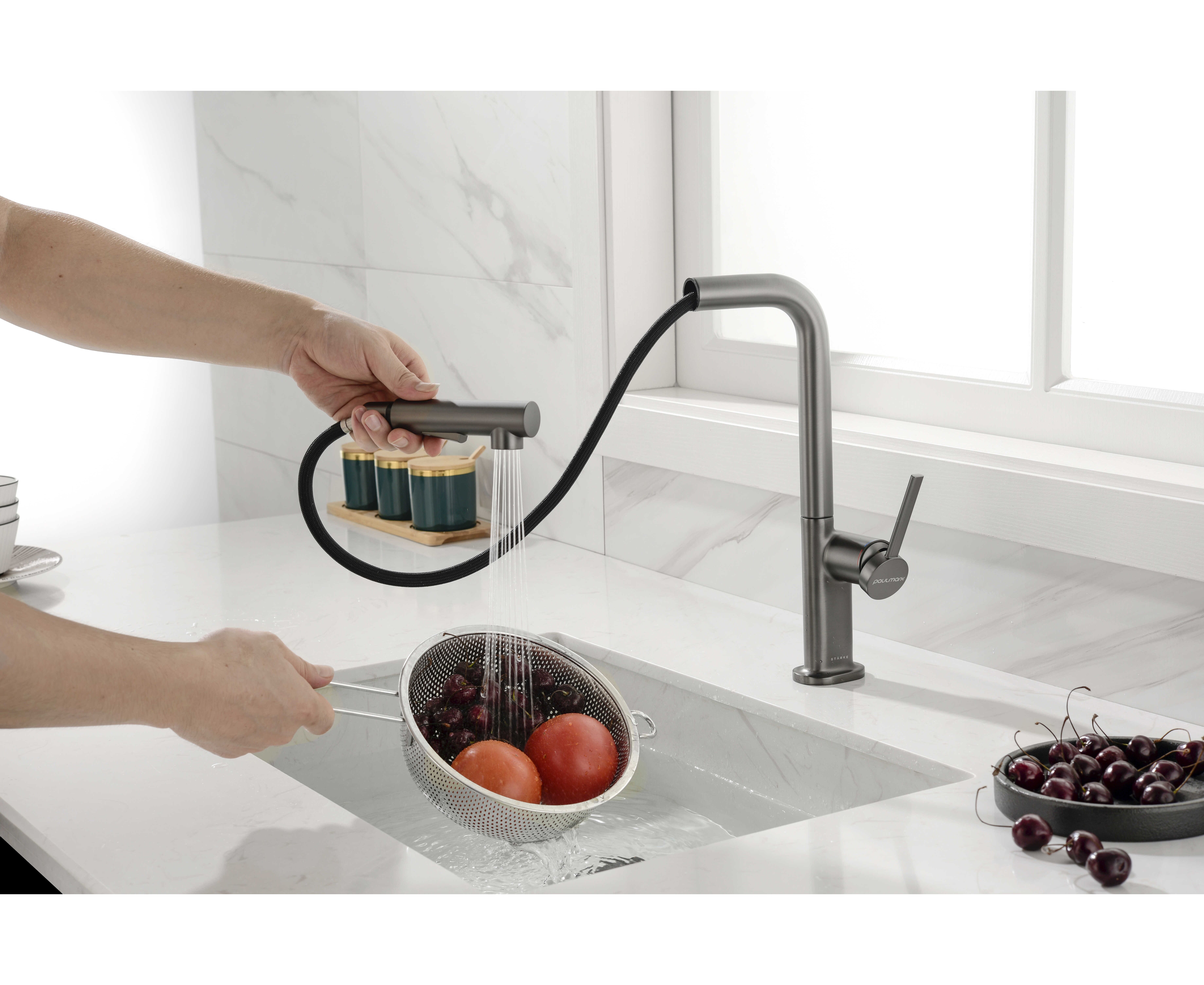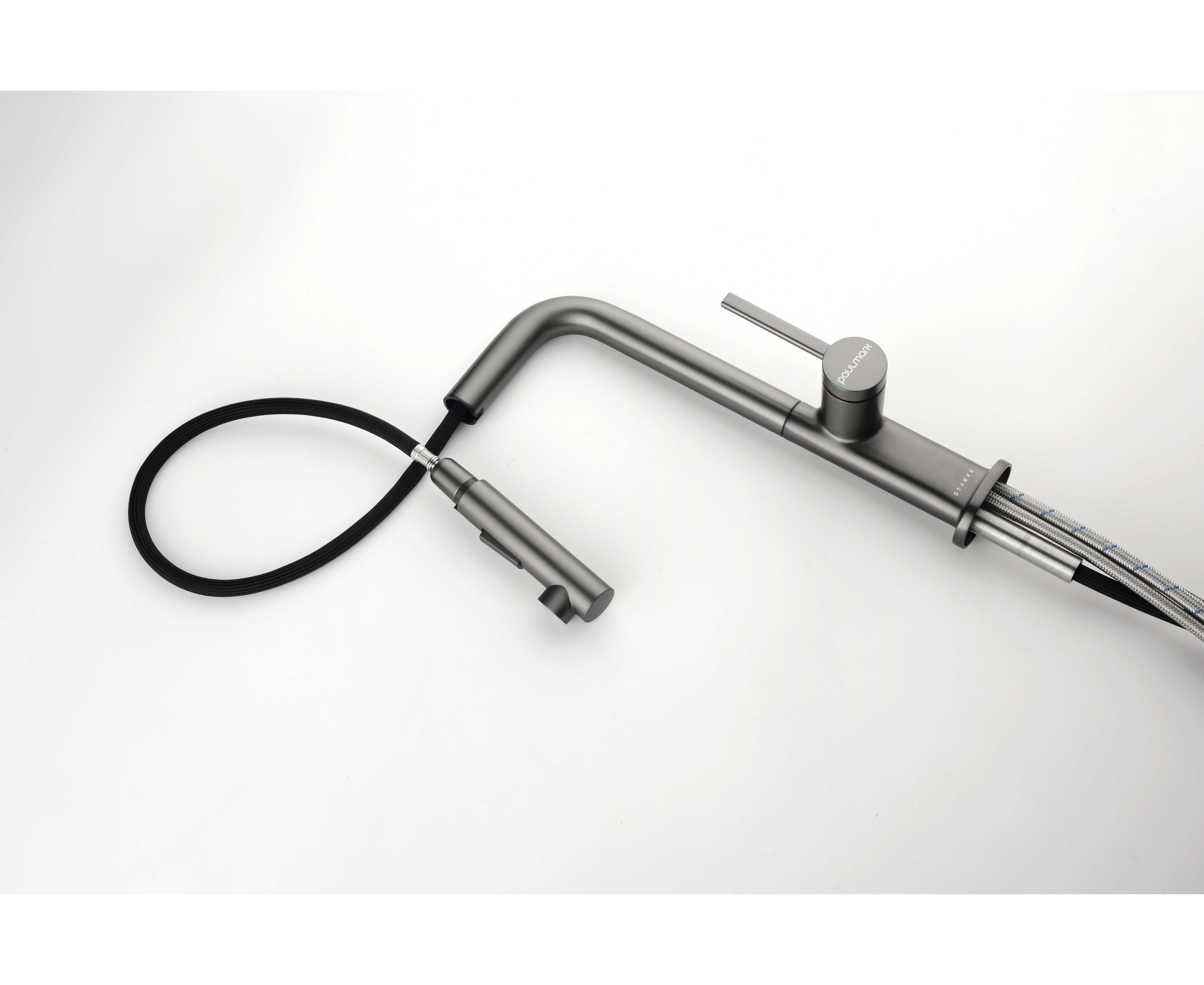 Смеситель латунный с Г-образным поворотным изливом, вращающимся на 180°, и выдвижной лейкой с двумя режимами подачи воды. Переключение между мощной струей и деликатным душем осуществляется эргономичной кнопкой. Функционал смесителя обеспечивает комфорт при мытье посуды, продуктов и уходе за мойкой.