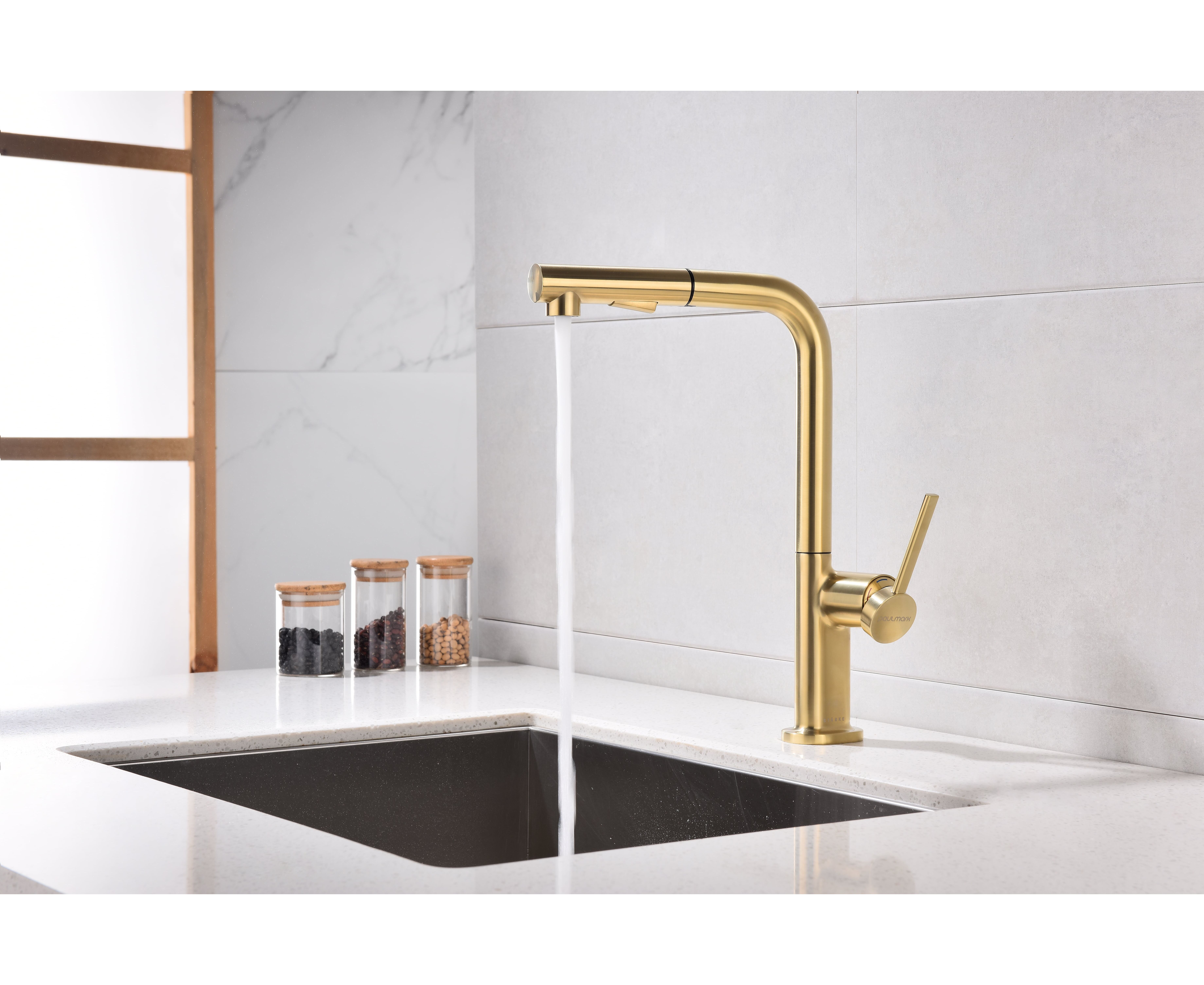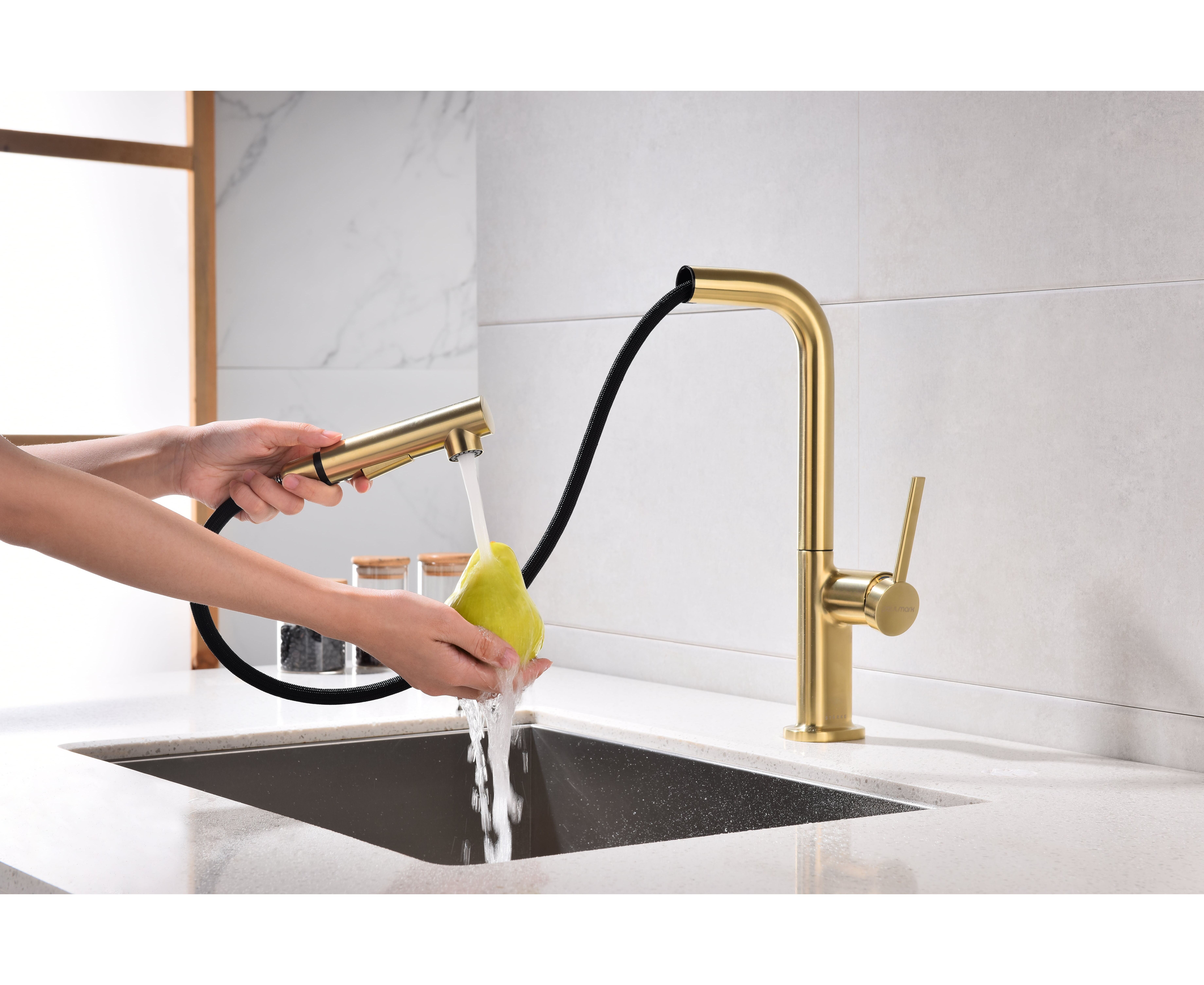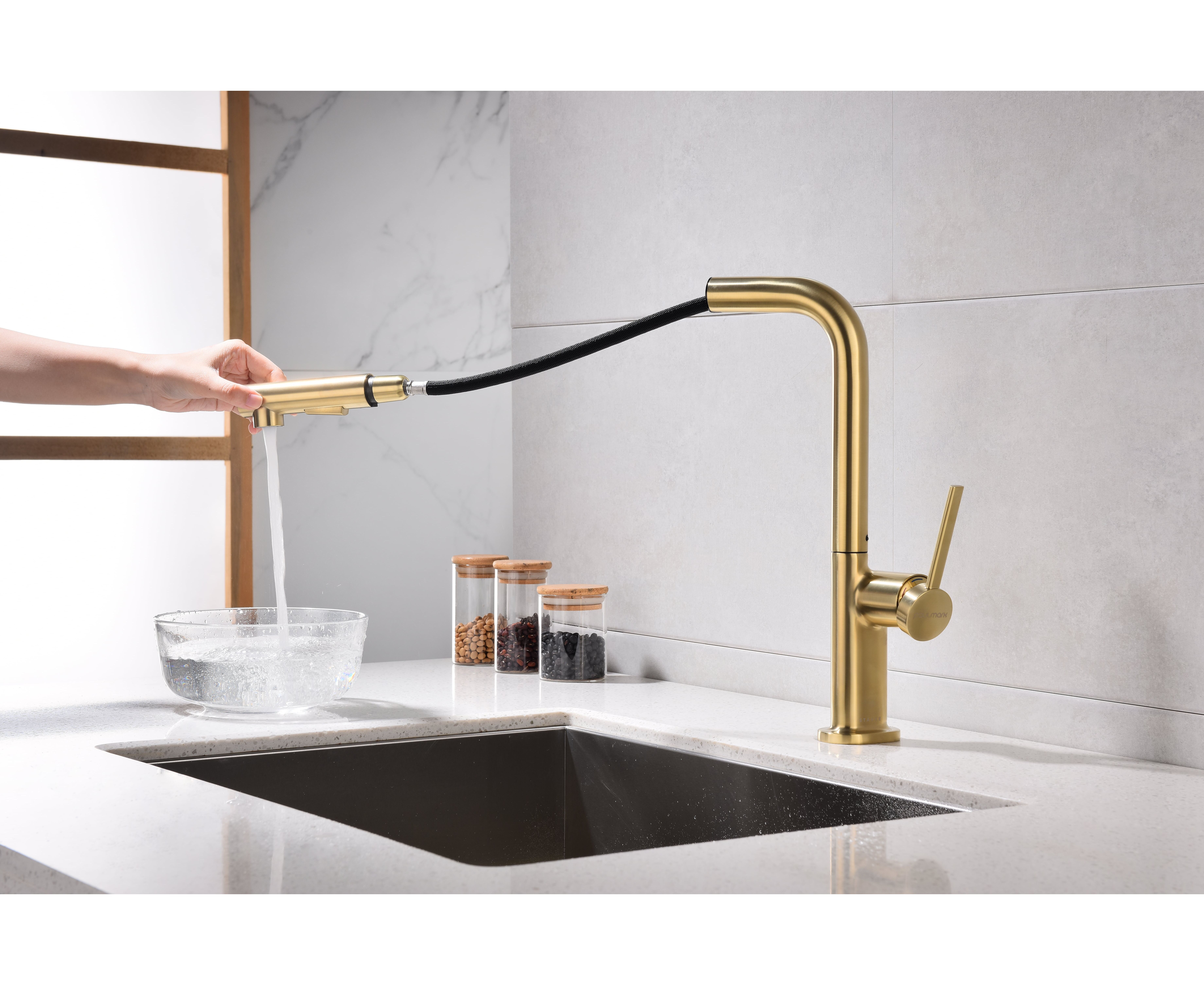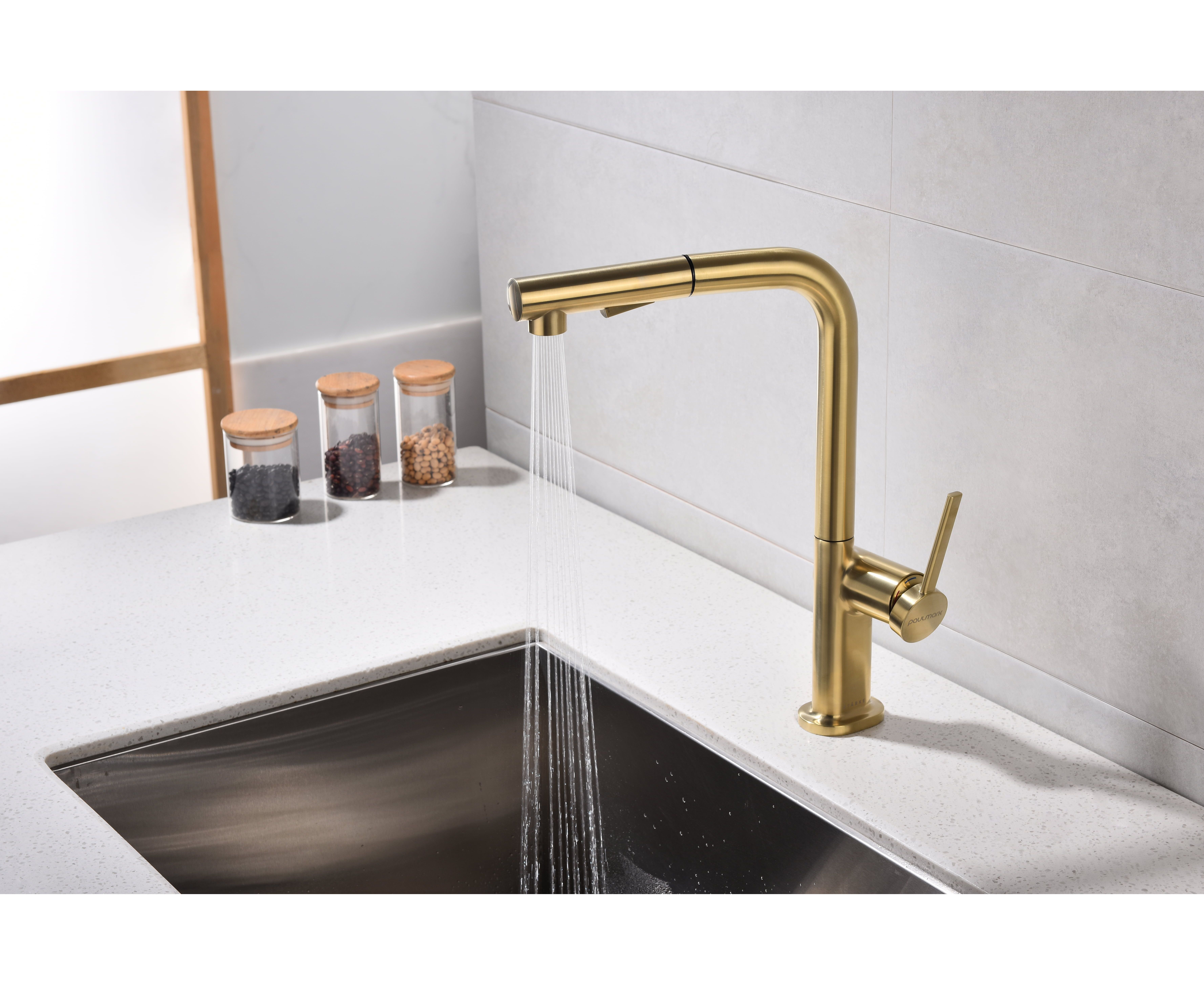Смеситель латунный с Г-образным поворотным изливом, вращающимся на 180°, и выдвижной лейкой с двумя режимами подачи воды. Переключение между мощной струей и деликатным душем осуществляется эргономичной кнопкой. Функционал смесителя обеспечивает комфорт при мытье посуды, продуктов и уходе за мойкой.