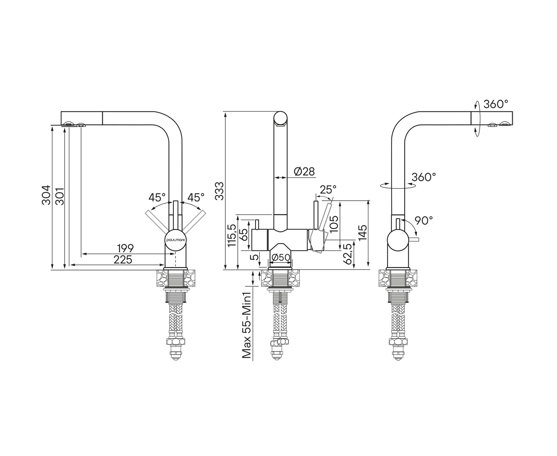 Смеситель из нержавеющей стали AISI 304 с Г-образным изливом. Излив поворотный на 360°. Модель оснащена технологией Trinkwasser, обеспечивающей раздельную подачу водопроводной и фильтрованной питьевой воды. Потоки не смешиваются благодаря отдельным каналам и аэраторам.