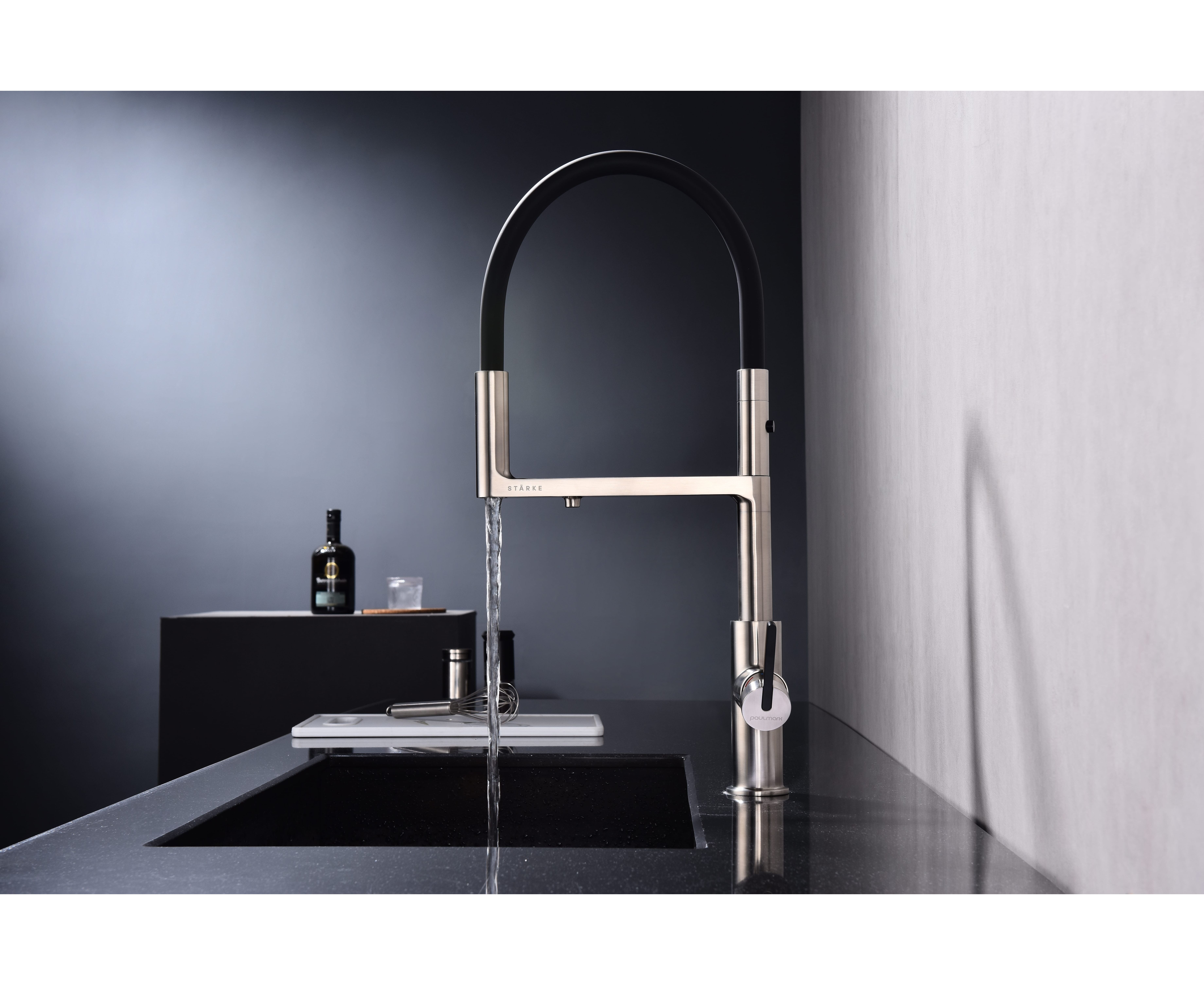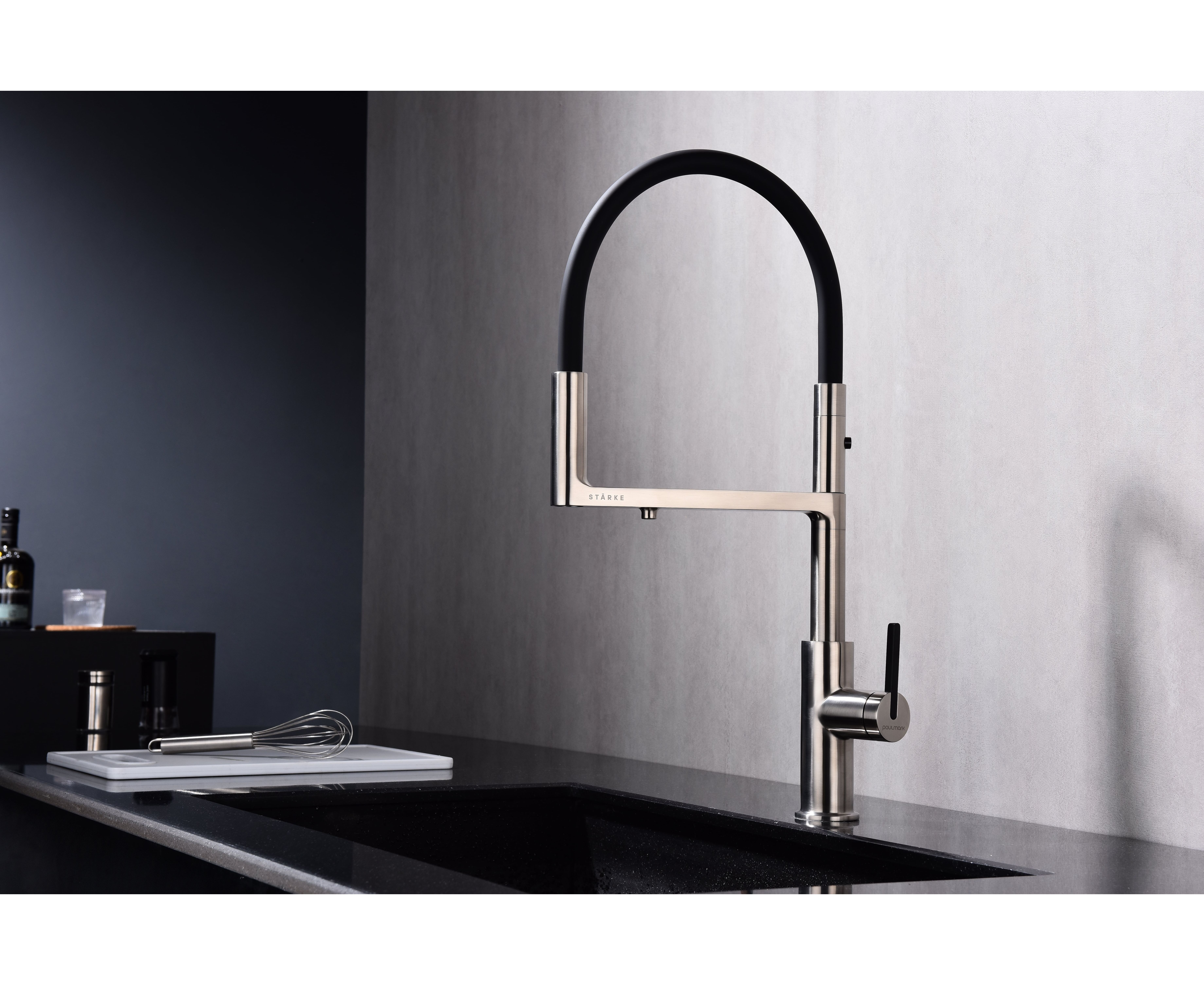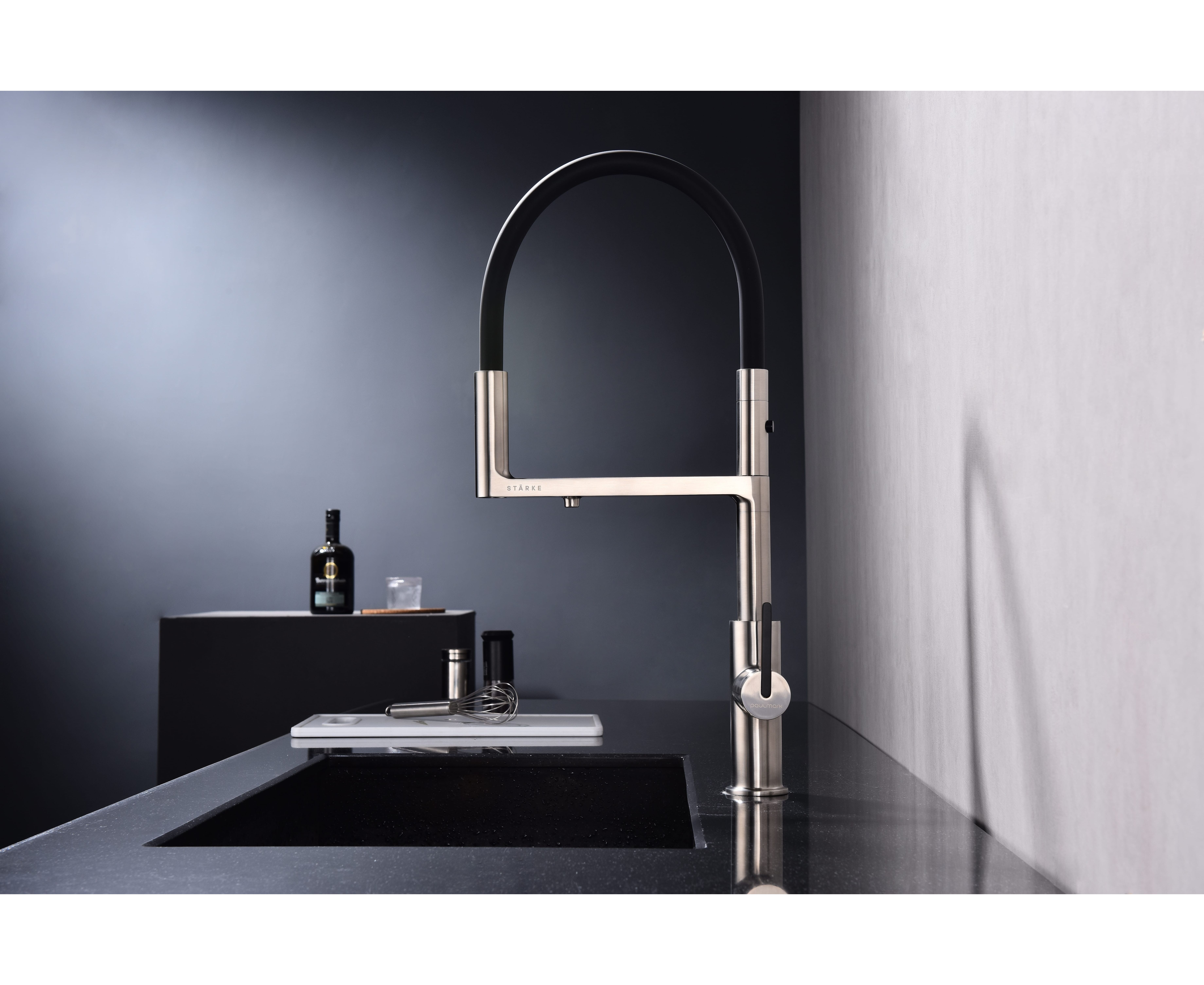 Смеситель с высоким гибким силиконовым изливом, вращающимся на 360°. Магнитный механизм фиксации обеспечивает удобство использования. Два режима подачи воды - мощная струя и экономичный душ - переключаются кнопкой на конце излива. Необычная конструкция излива с фиксацией на основании корпуса смесителя создает большую рабочую зону.