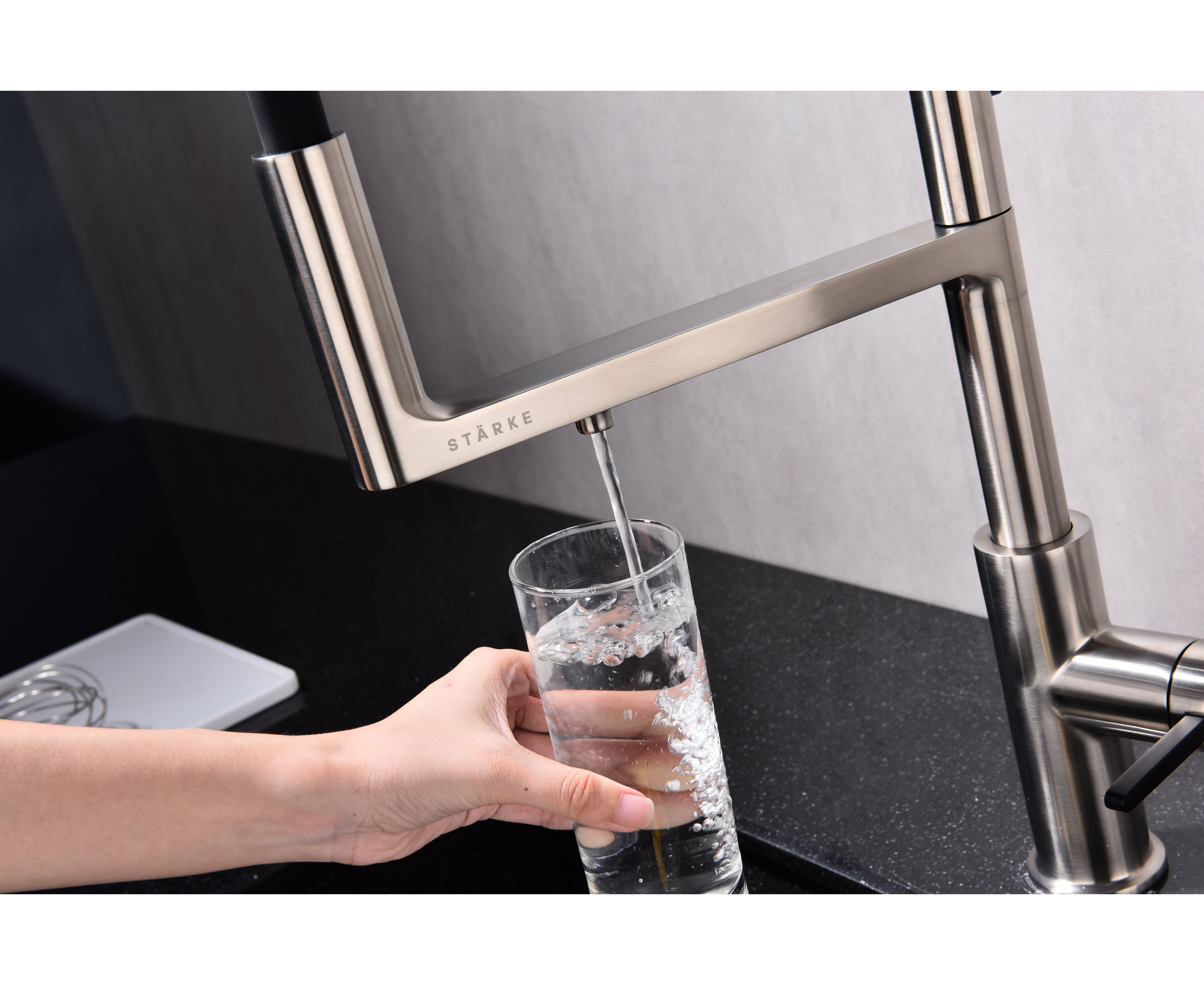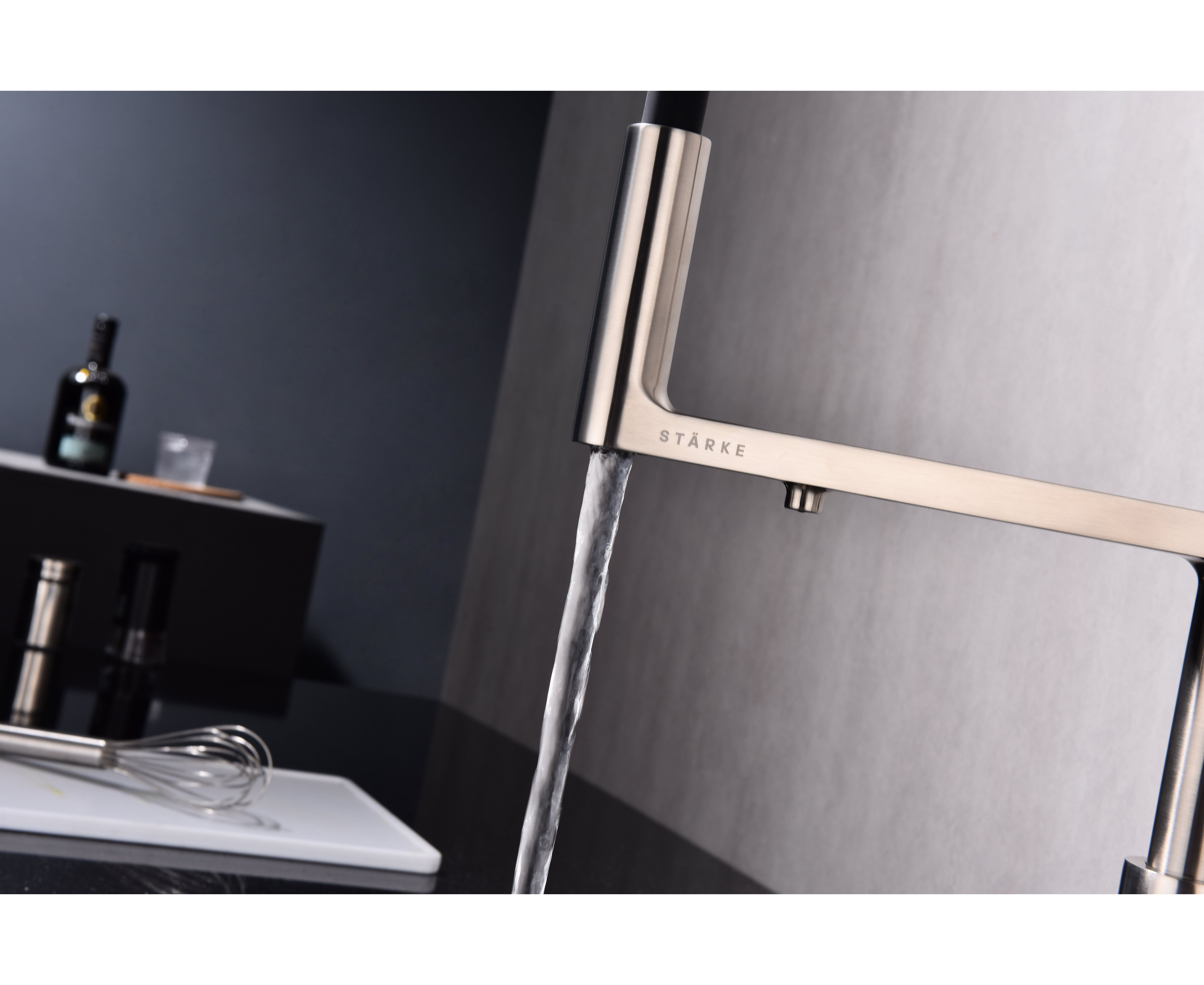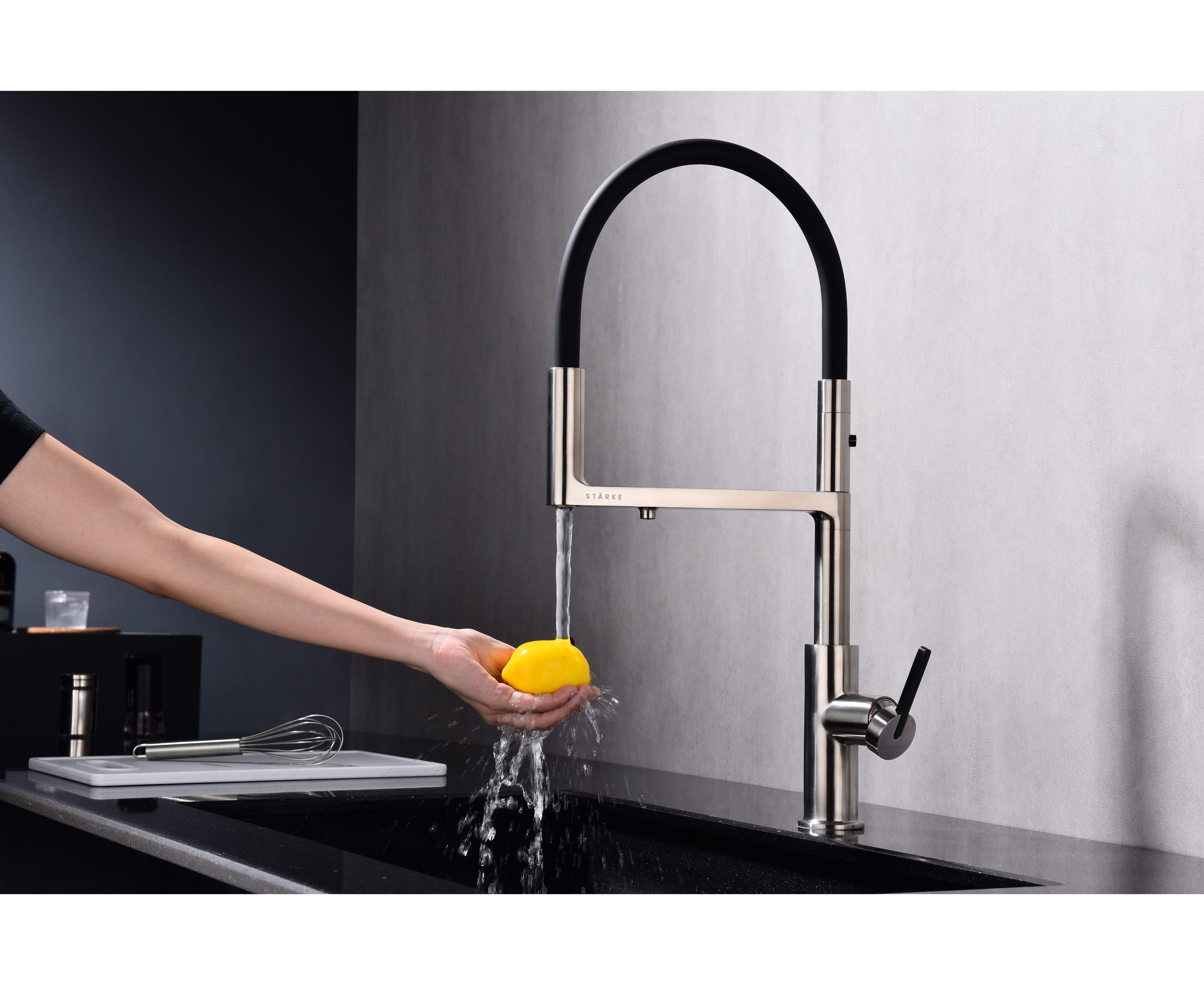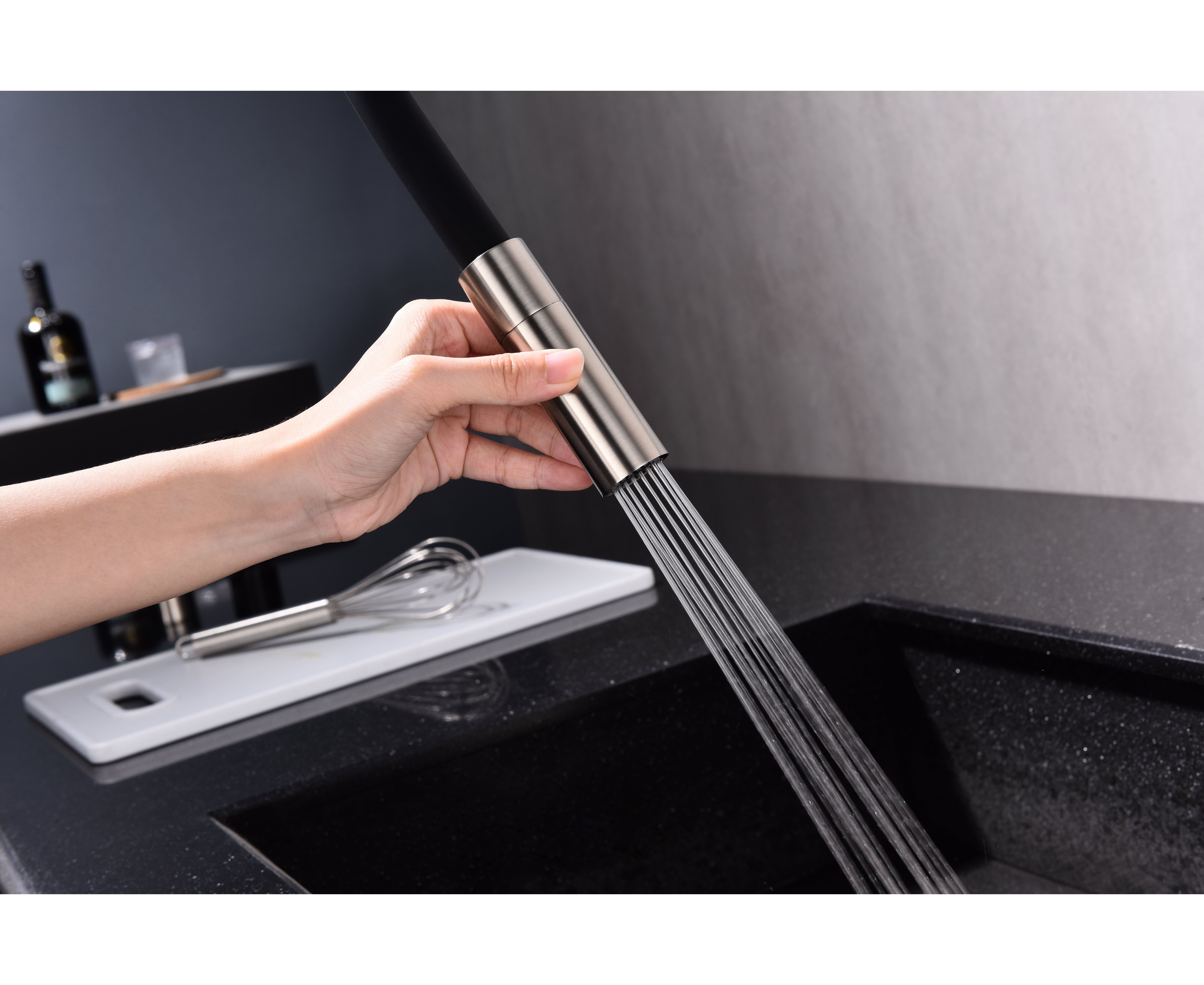 Смеситель с высоким гибким силиконовым изливом, вращающимся на 360°. Магнитный механизм фиксации обеспечивает удобство использования. Два режима подачи воды - мощная струя и экономичный душ - переключаются кнопкой на конце излива. Необычная конструкция излива с фиксацией на основании корпуса смесителя создает большую рабочую зону.