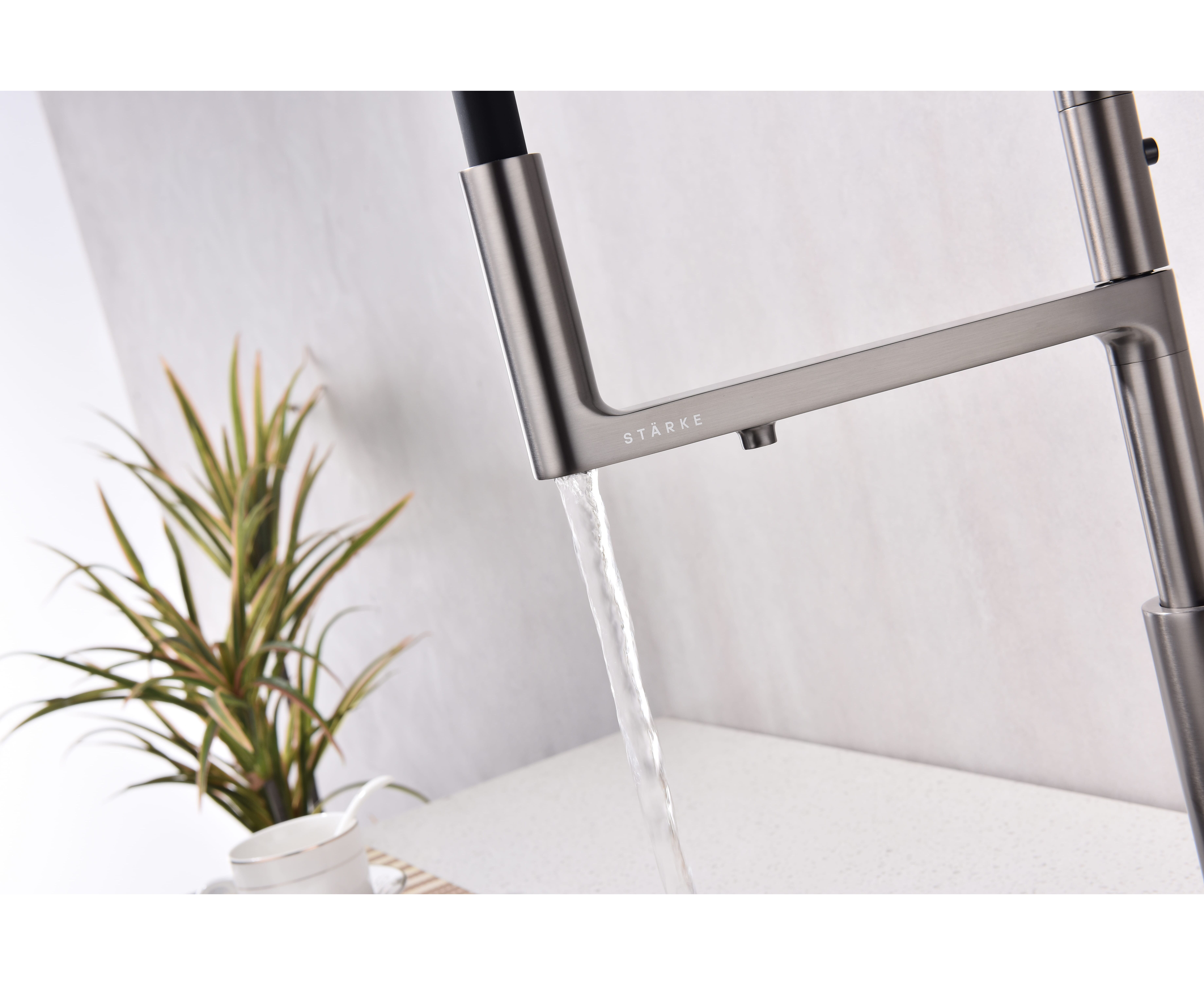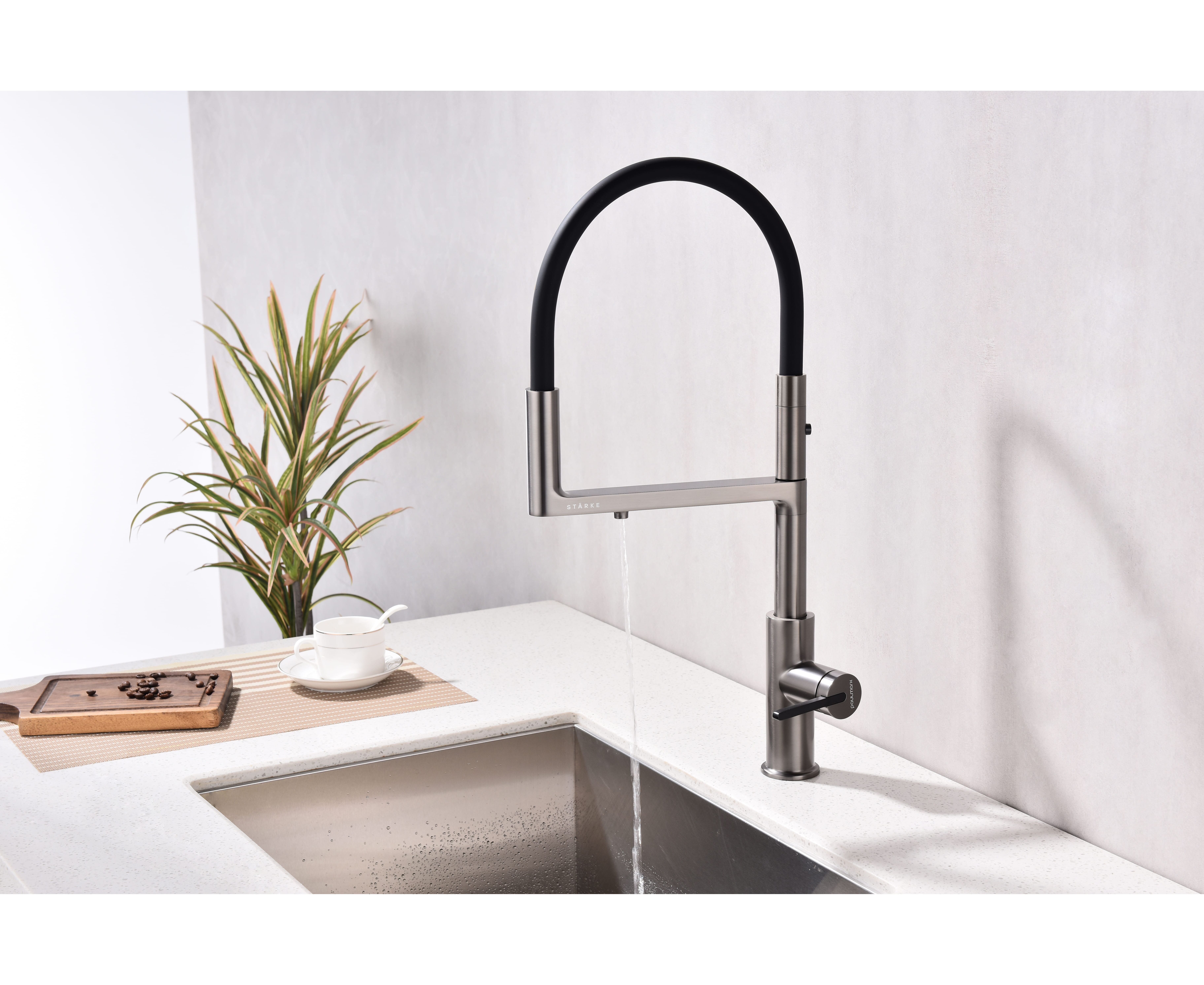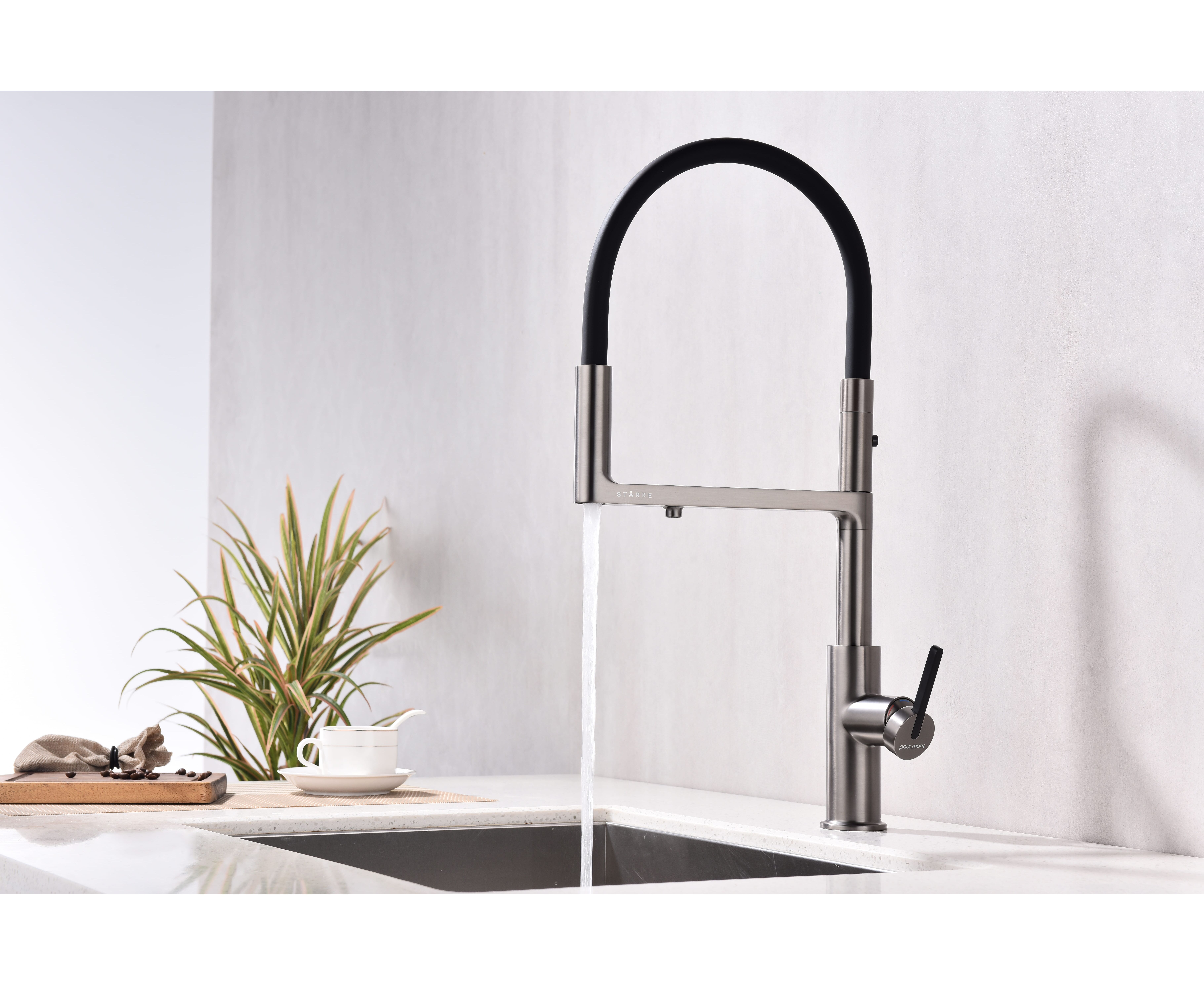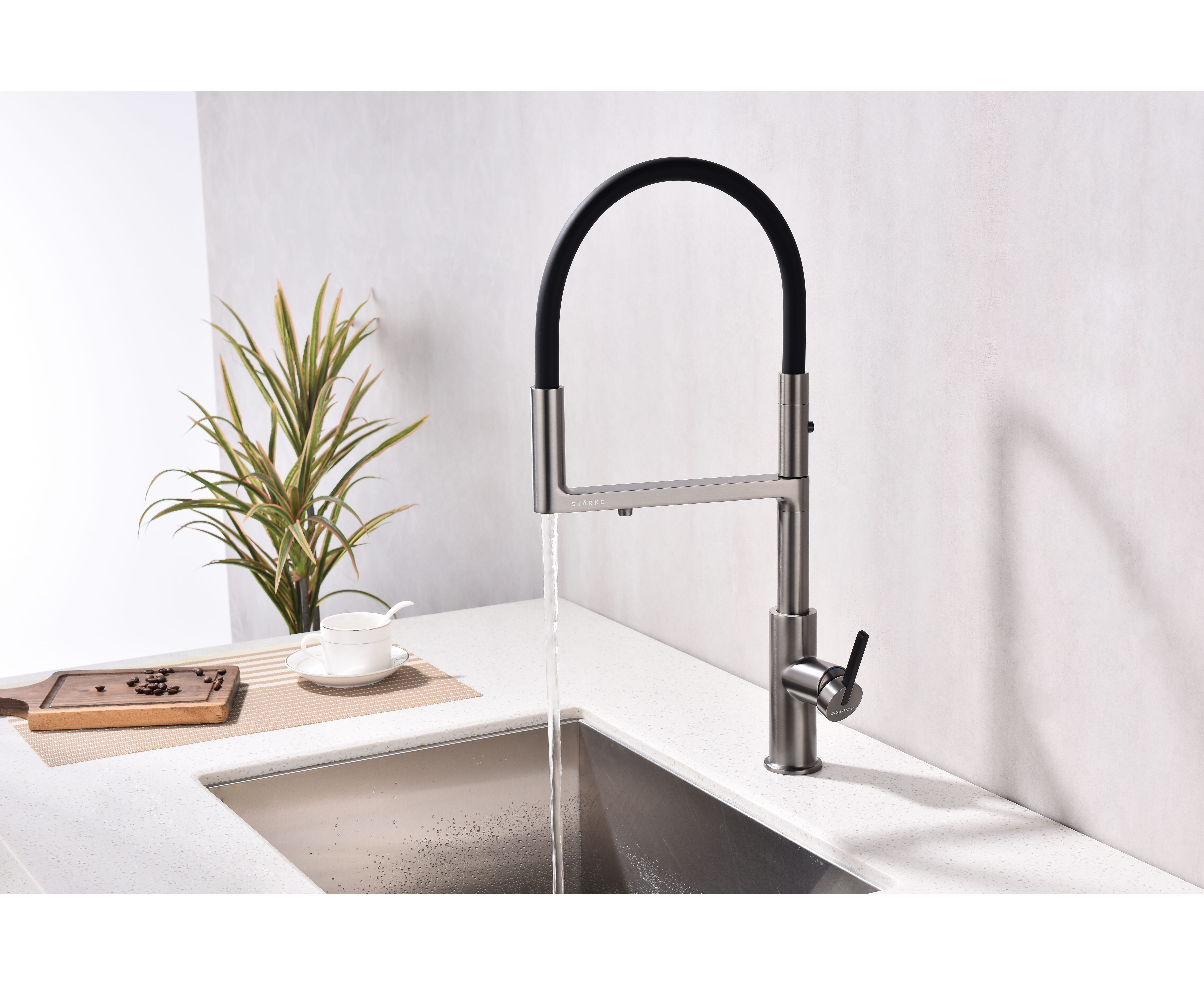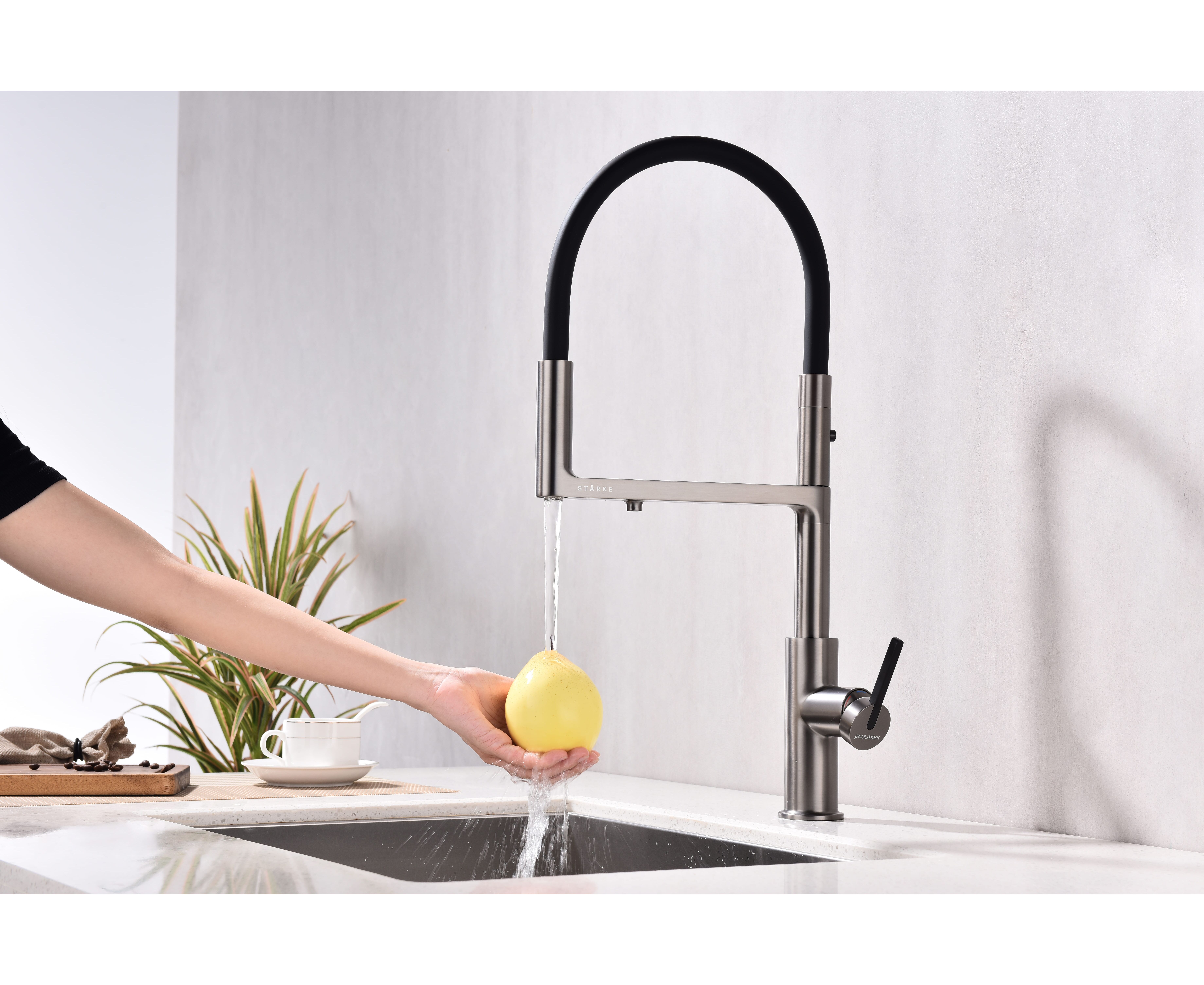 Смеситель с высоким гибким силиконовым изливом, вращающимся на 360°. Магнитный механизм фиксации обеспечивает удобство использования. Два режима подачи воды - мощная струя и экономичный душ - переключаются кнопкой на конце излива. Необычная конструкция излива с фиксацией на основании корпуса смесителя создает большую рабочую зону.