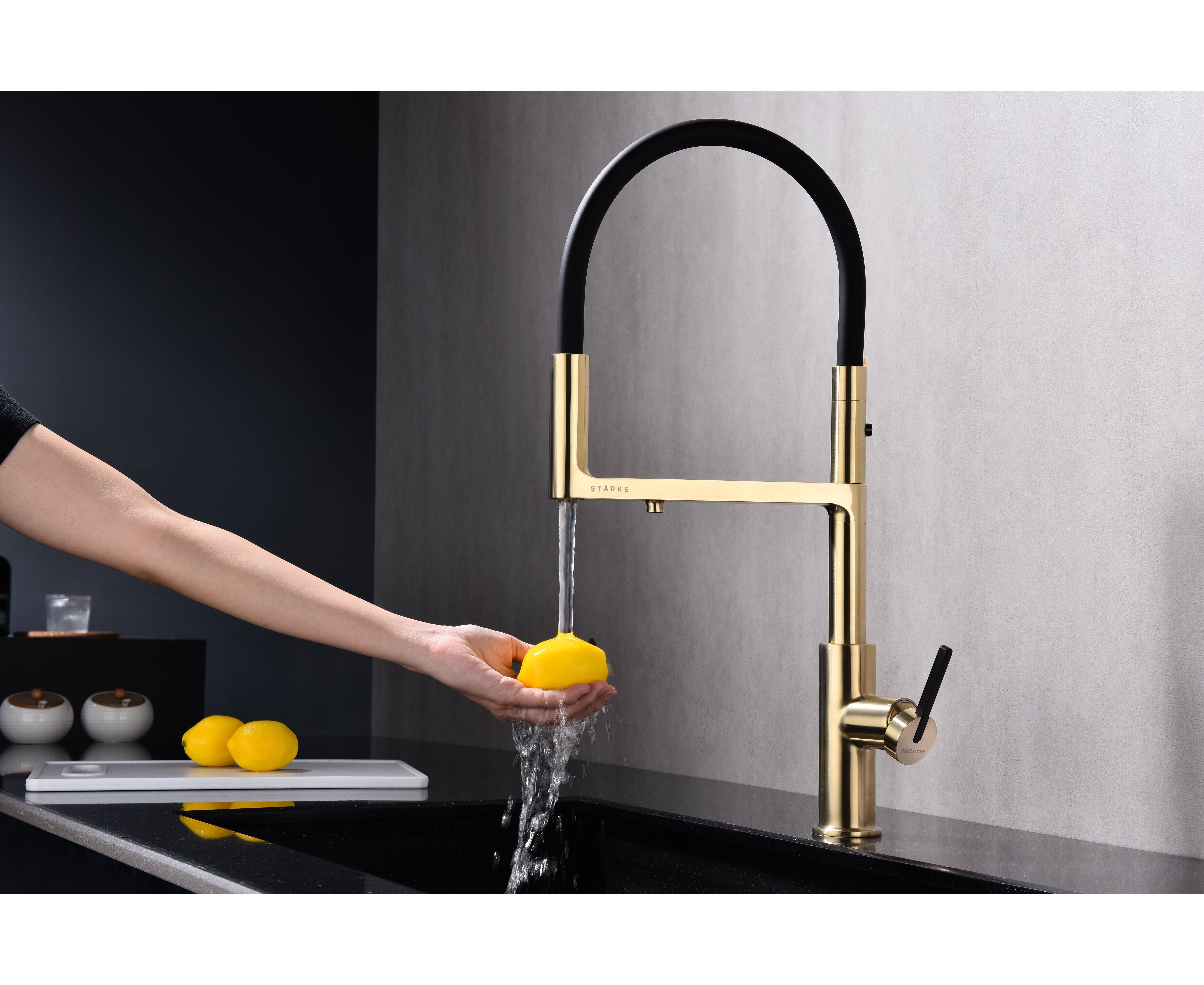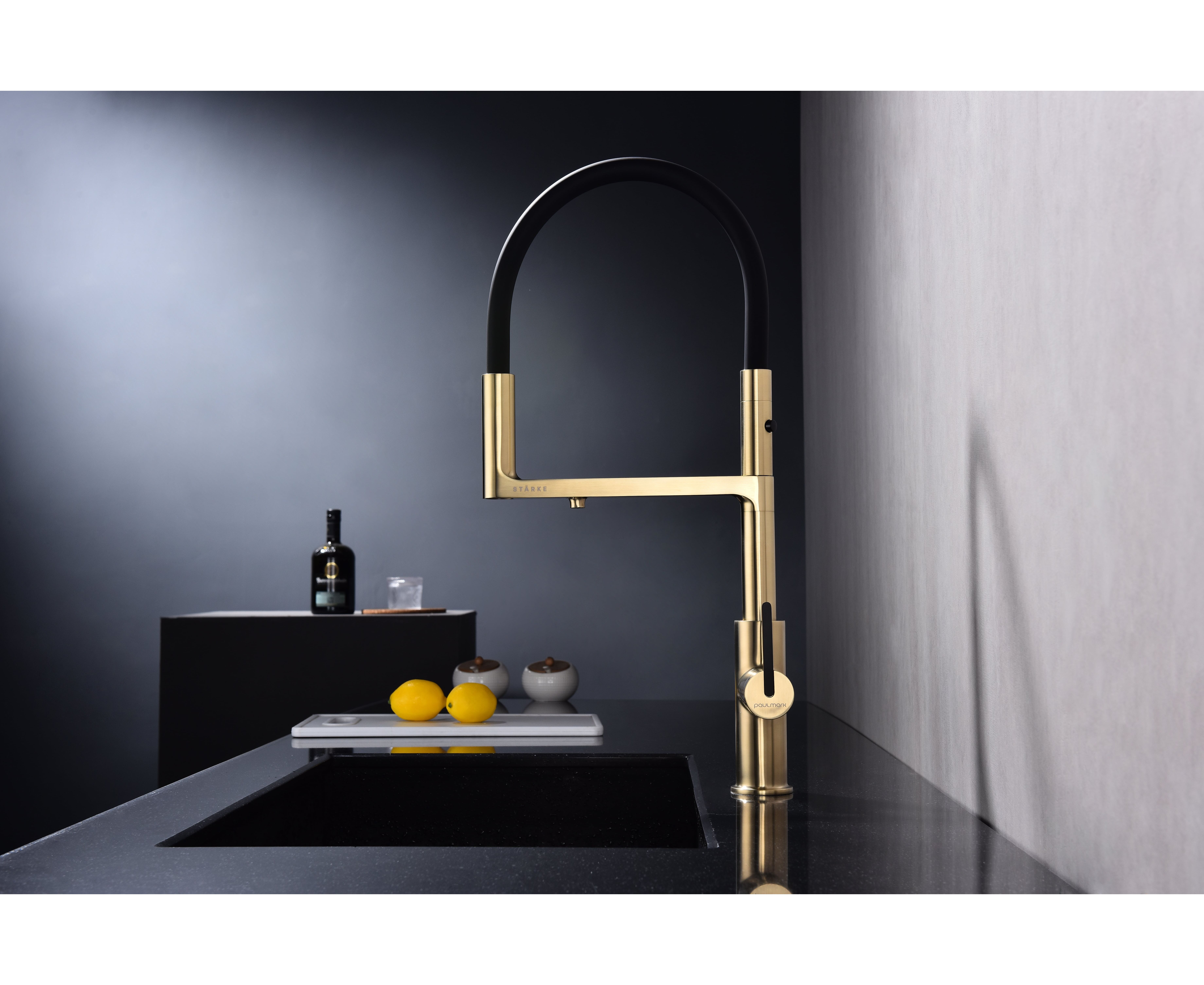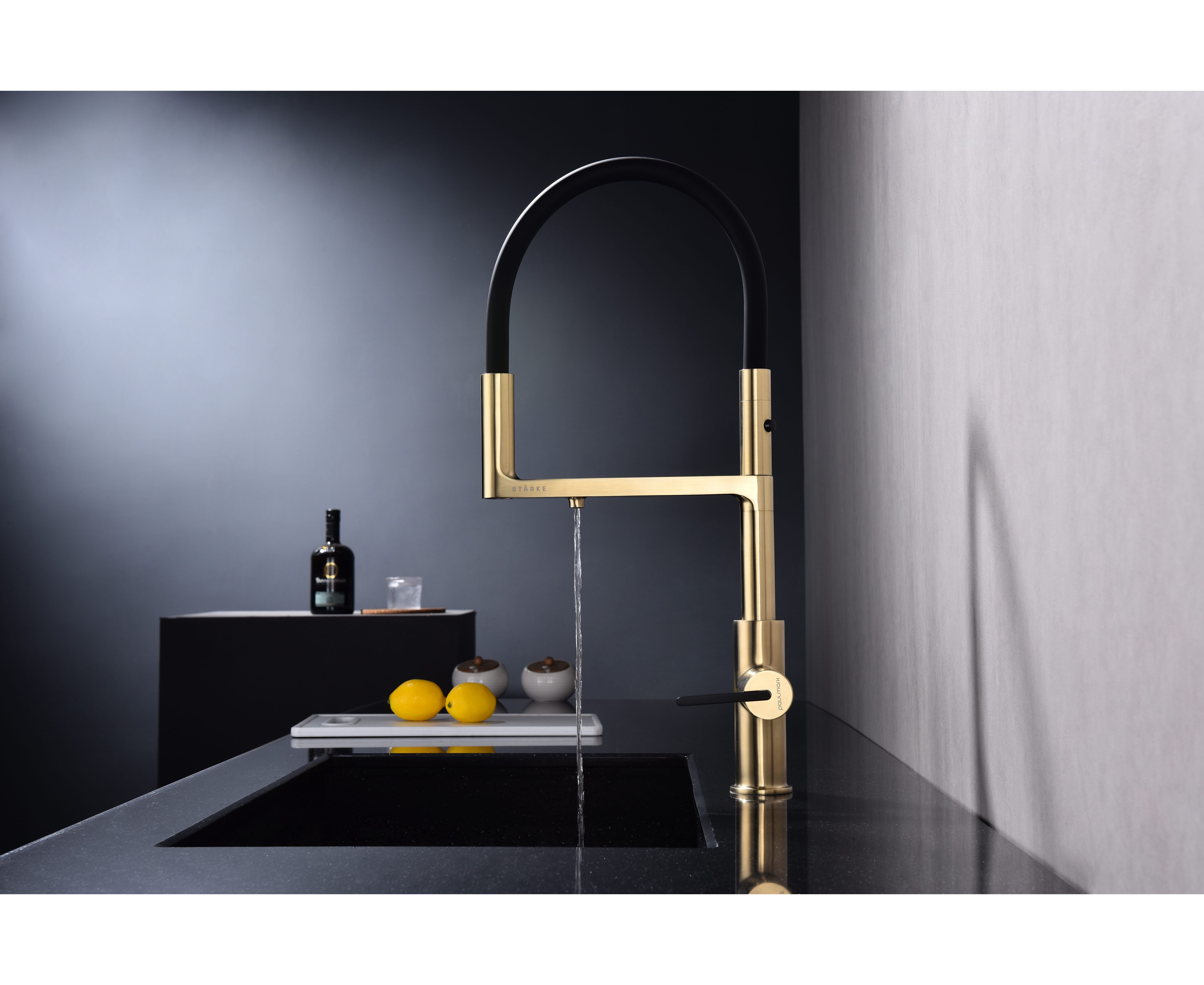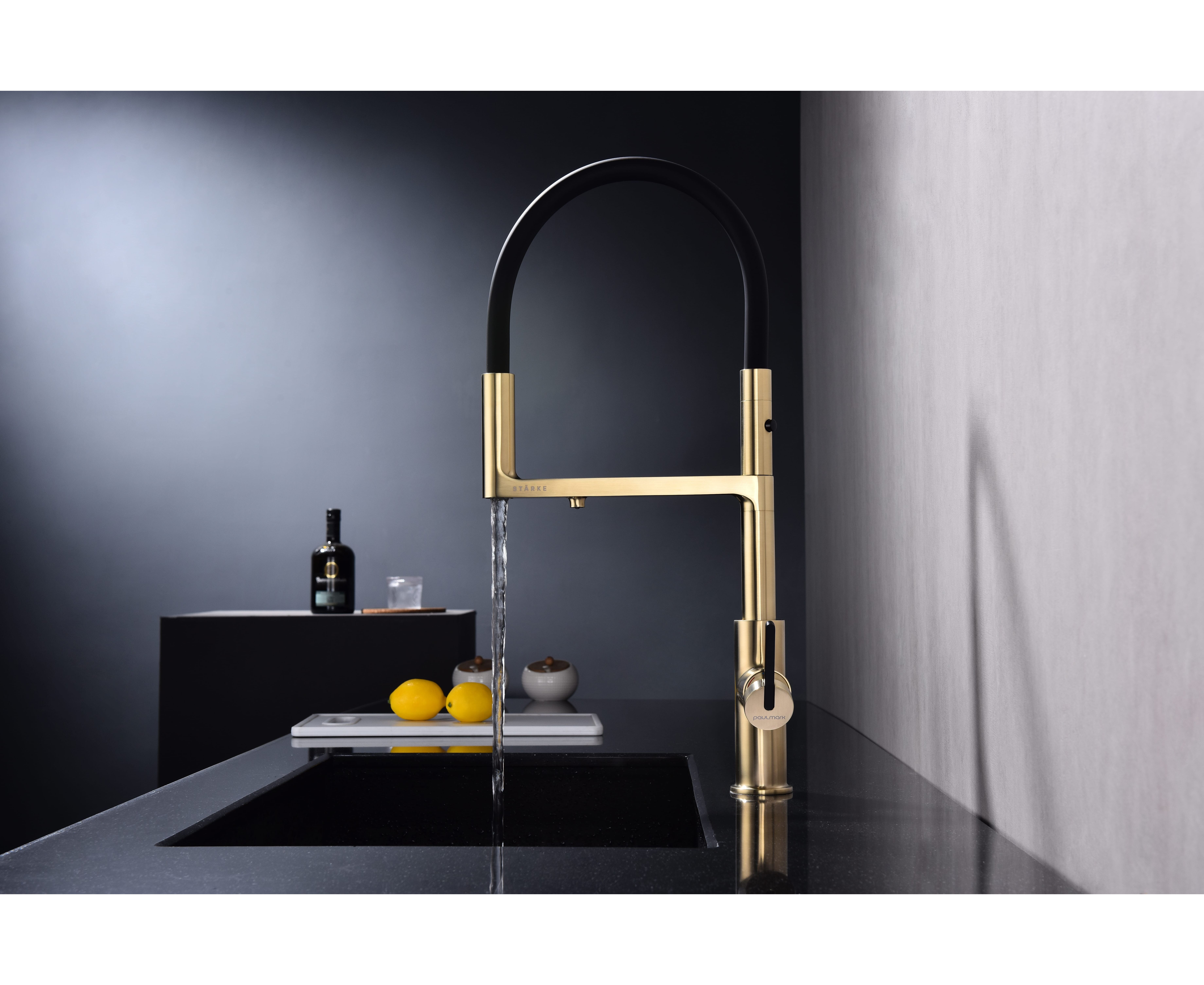 Смеситель с высоким гибким силиконовым изливом, вращающимся на 360°. Магнитный механизм фиксации обеспечивает удобство использования. Два режима подачи воды - мощная струя и экономичный душ - переключаются кнопкой на конце излива. Необычная конструкция излива с фиксацией на основании корпуса смесителя создает большую рабочую зону.