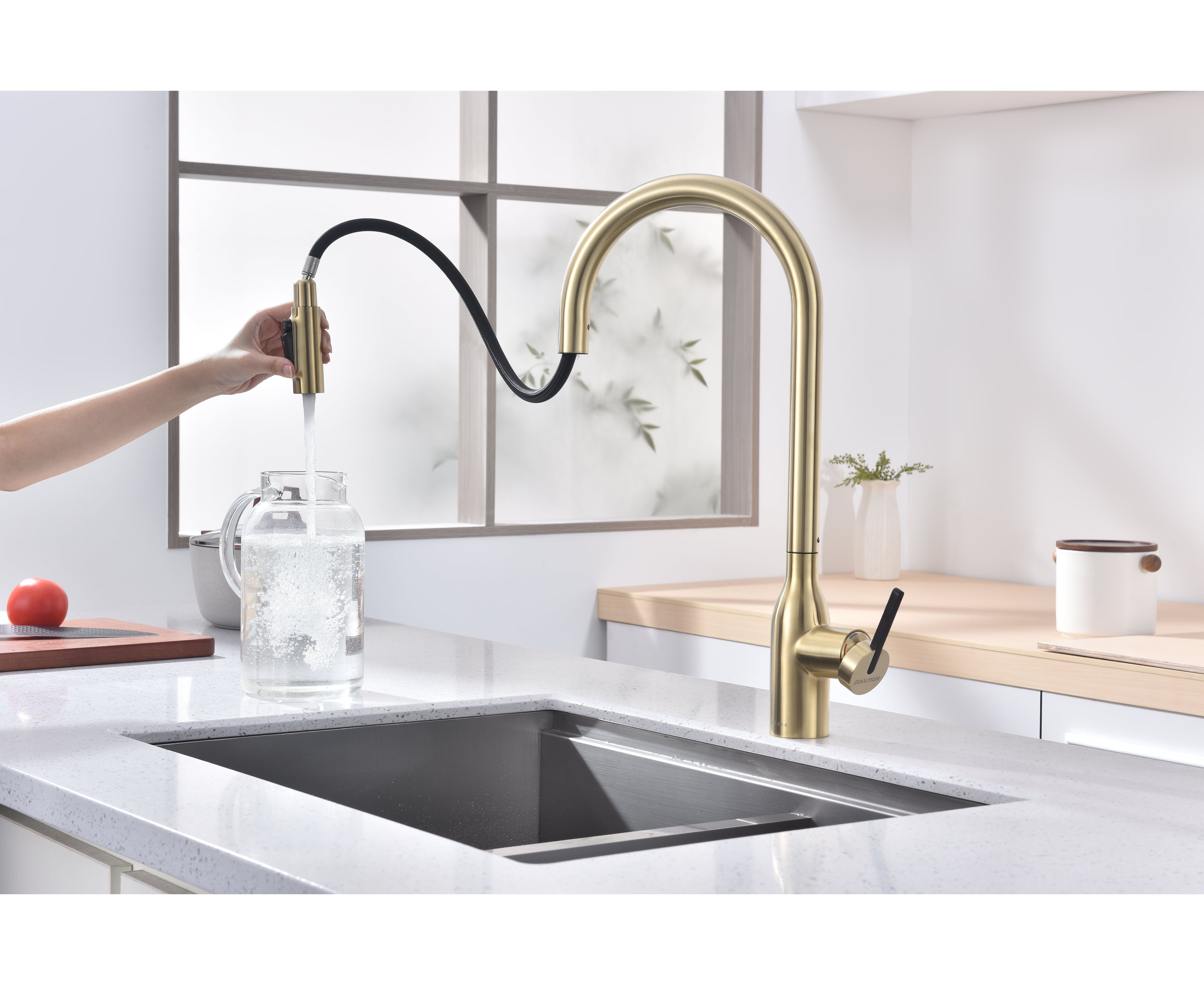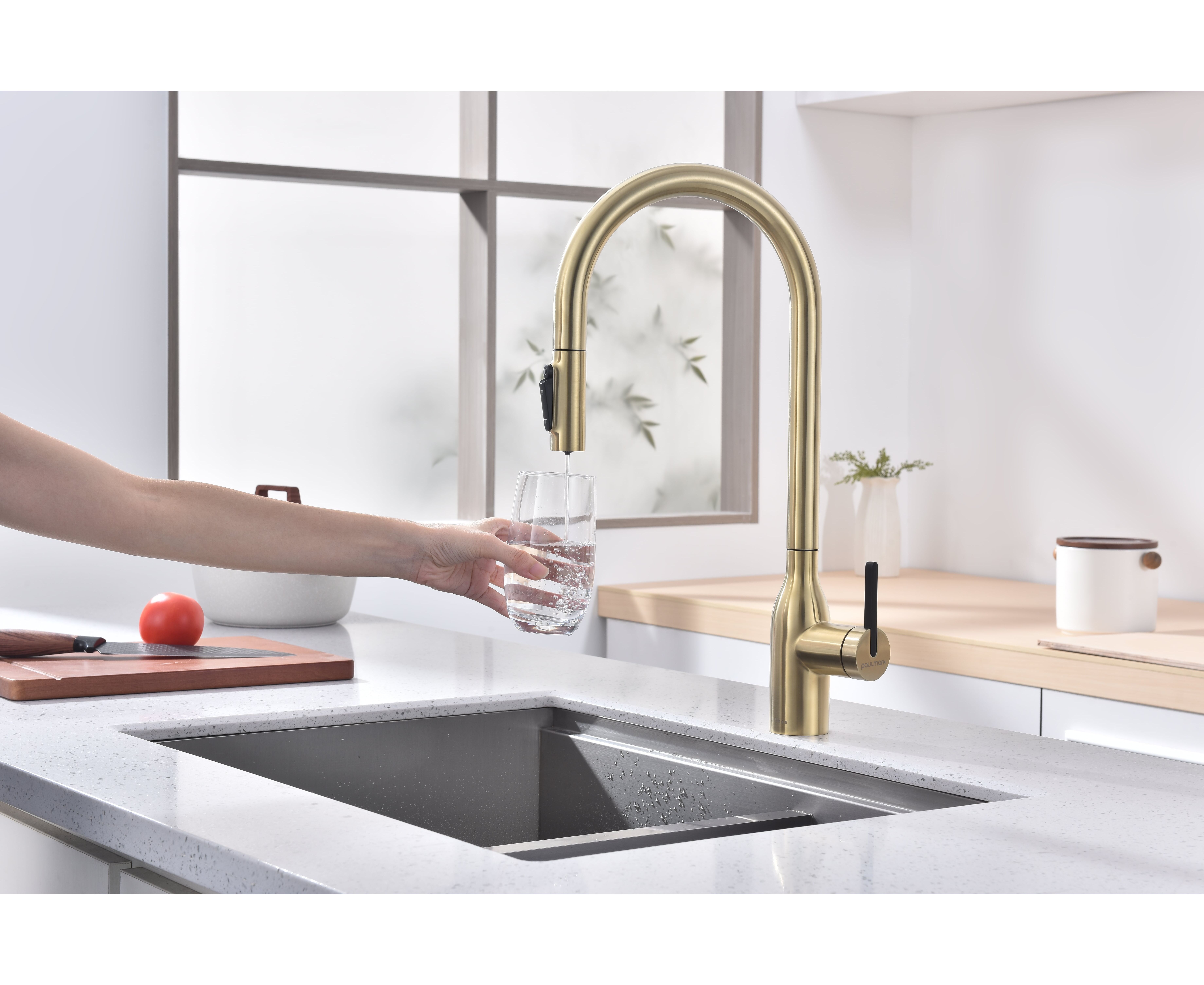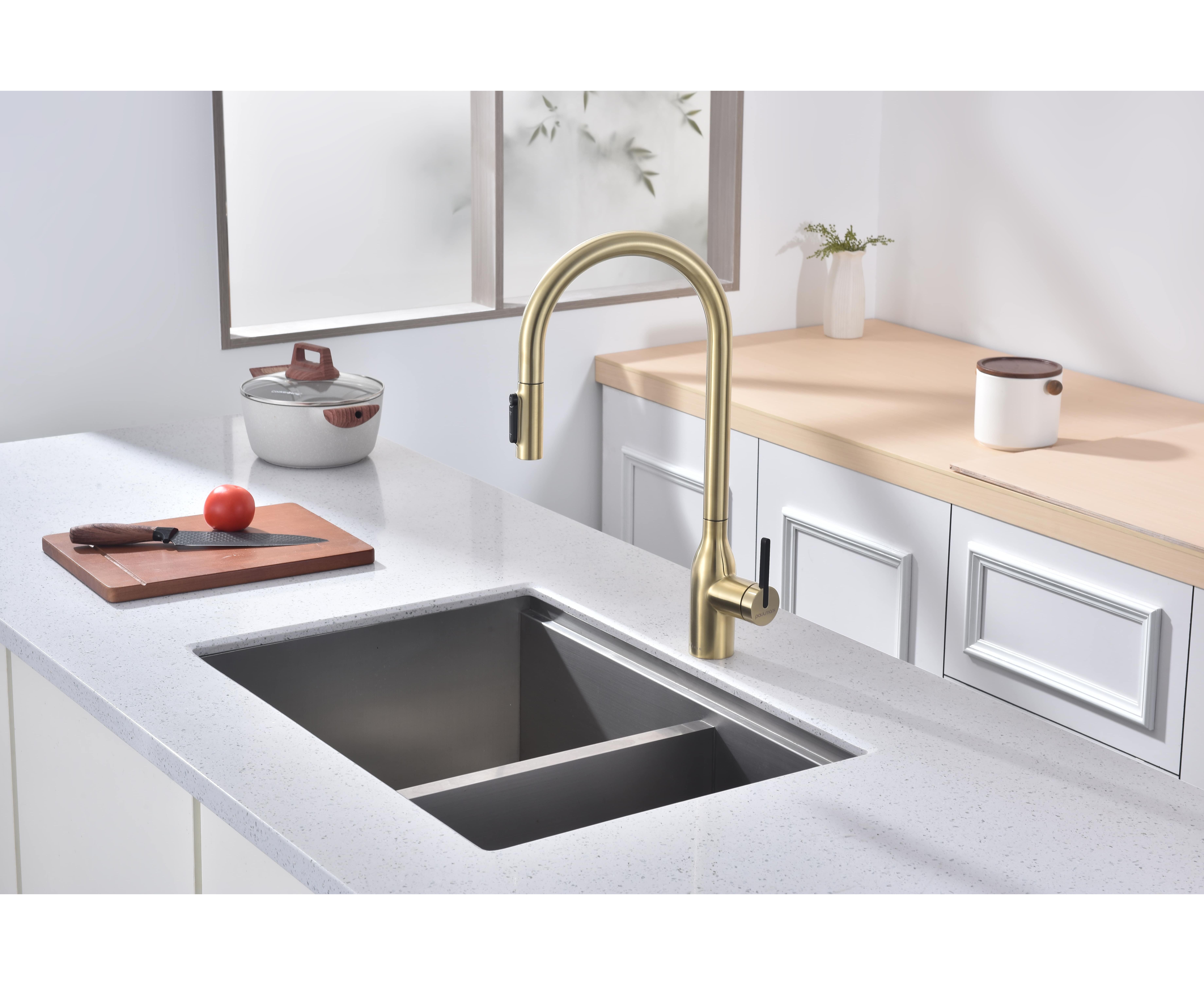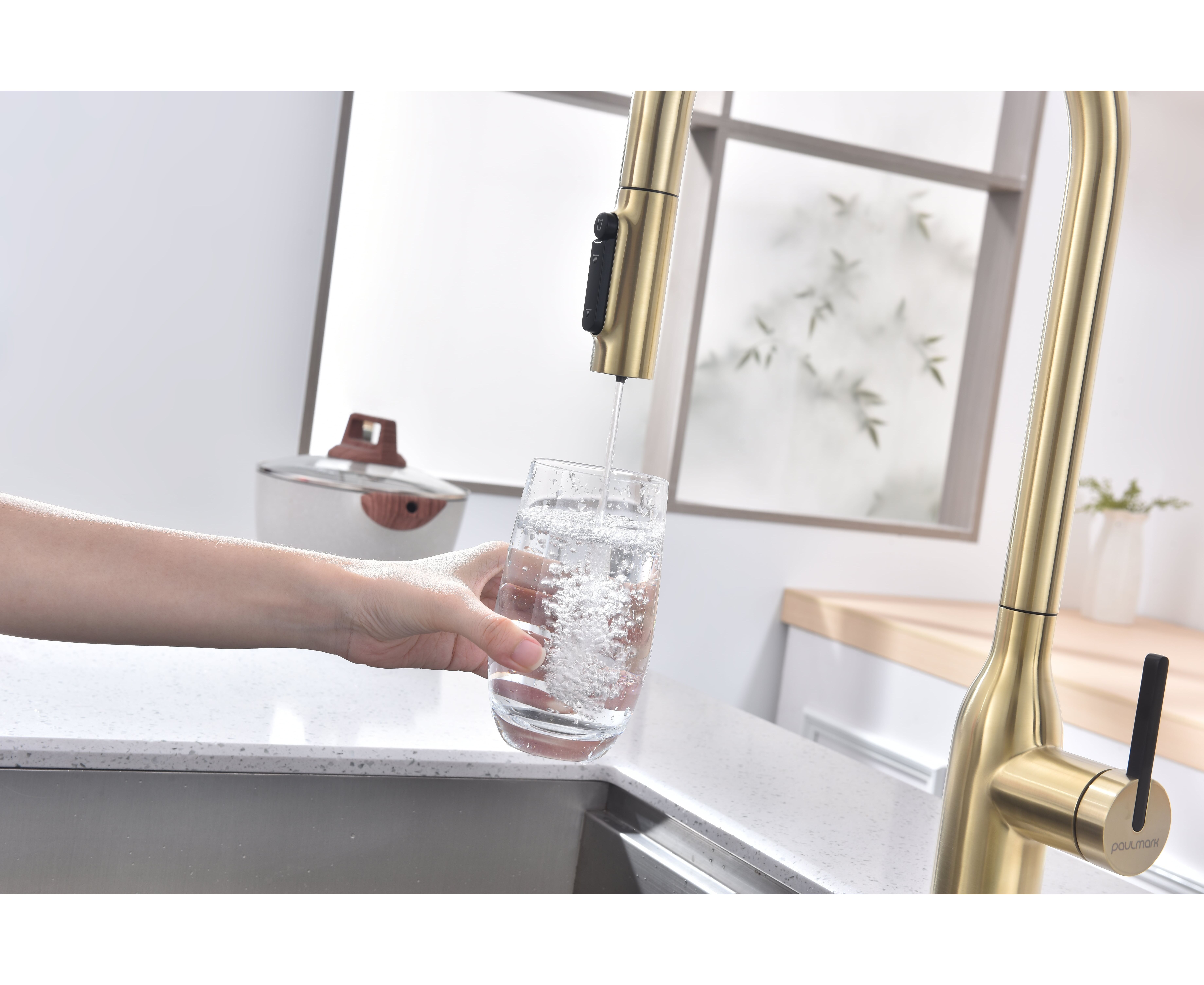 Высокий смеситель премиум-серии с вытяжным изливом и возможностью подключения системы фильтрации питьевой воды. Модель оснащена отдельным каналом для питьевой воды — водопроводная и питьевая вода не смешиваются. Кнопками на конце излива осуществляется управление всеми режимами: подача питьевой воды и переключение режимов струя или душ для водопроводной воды.