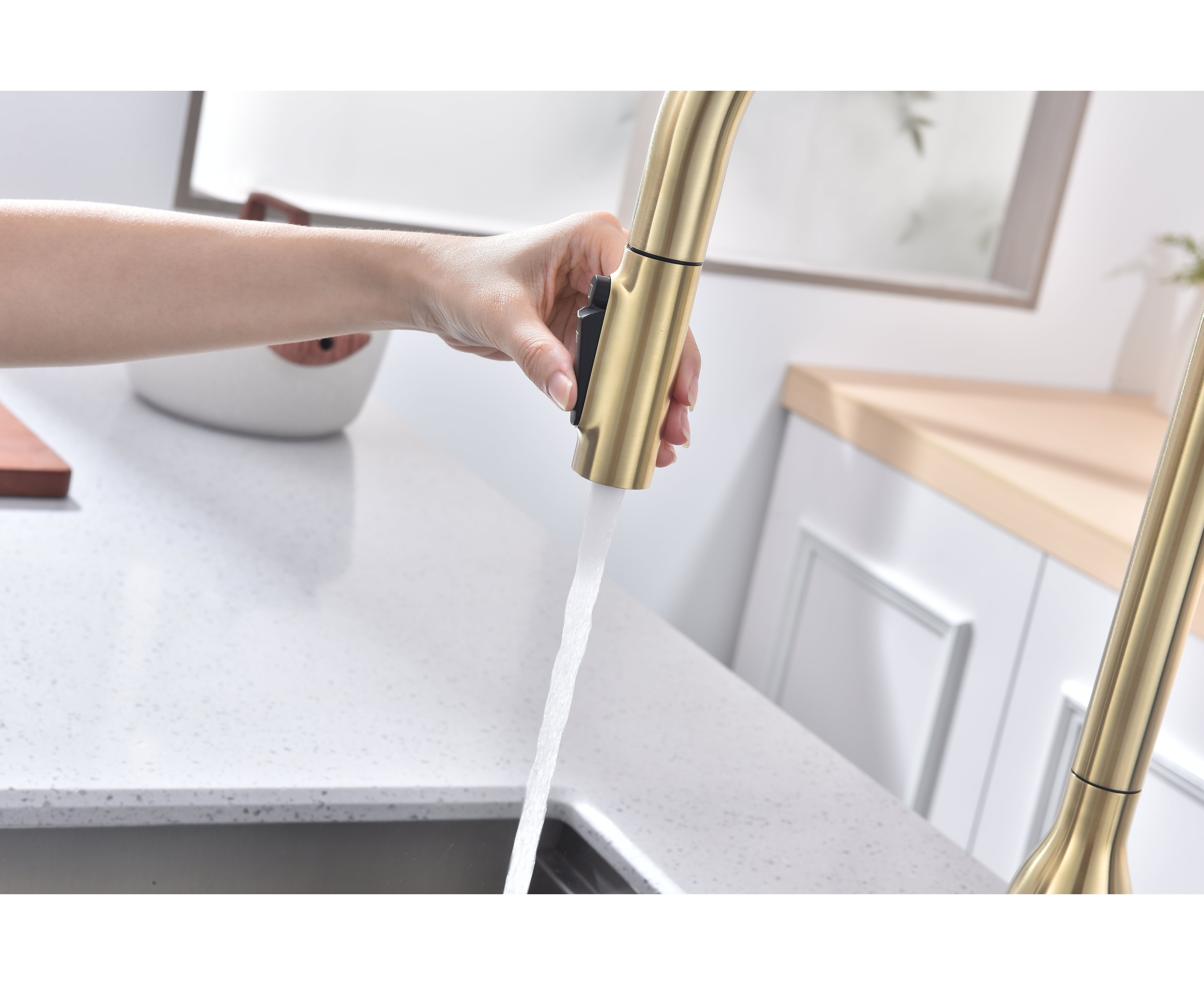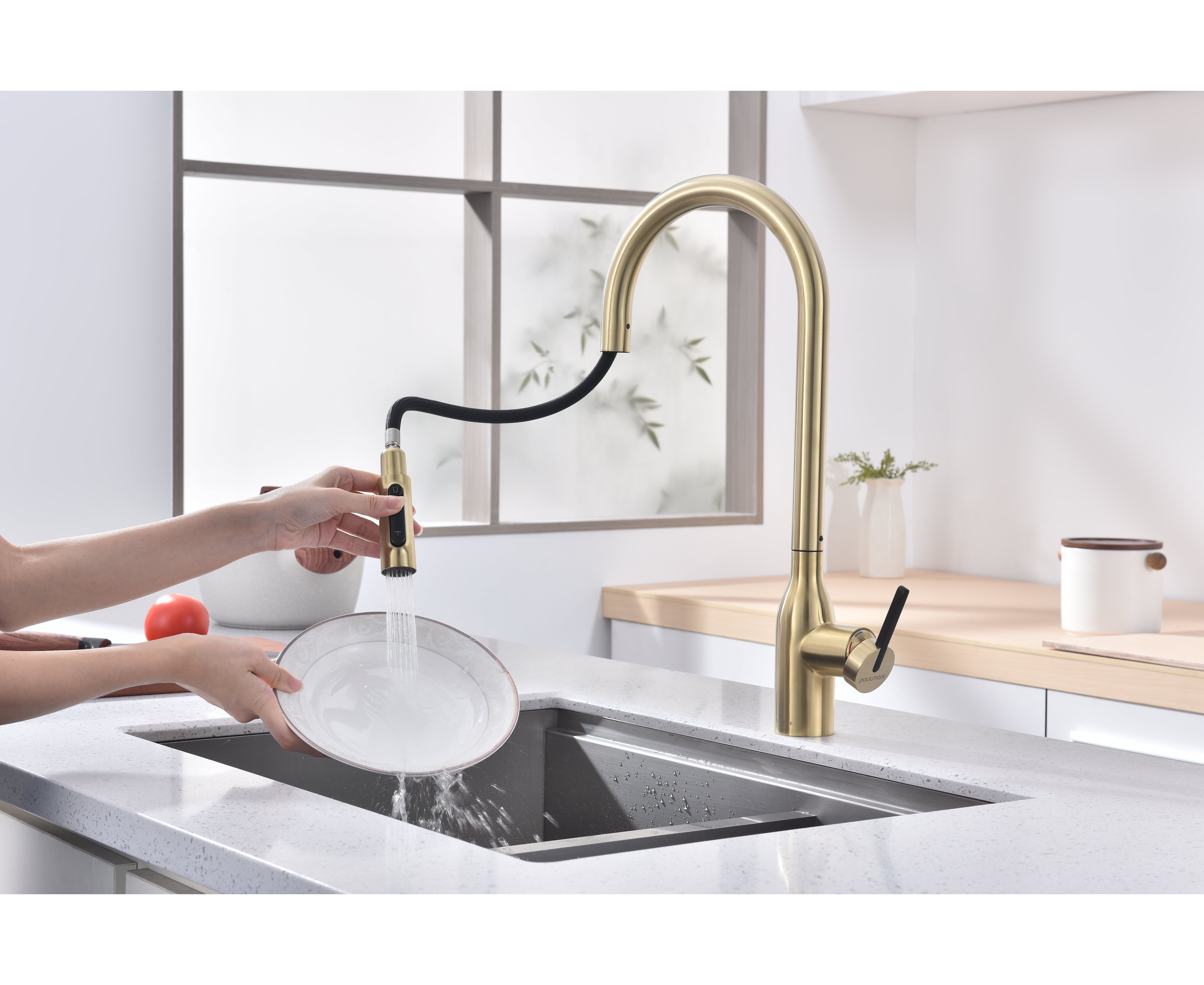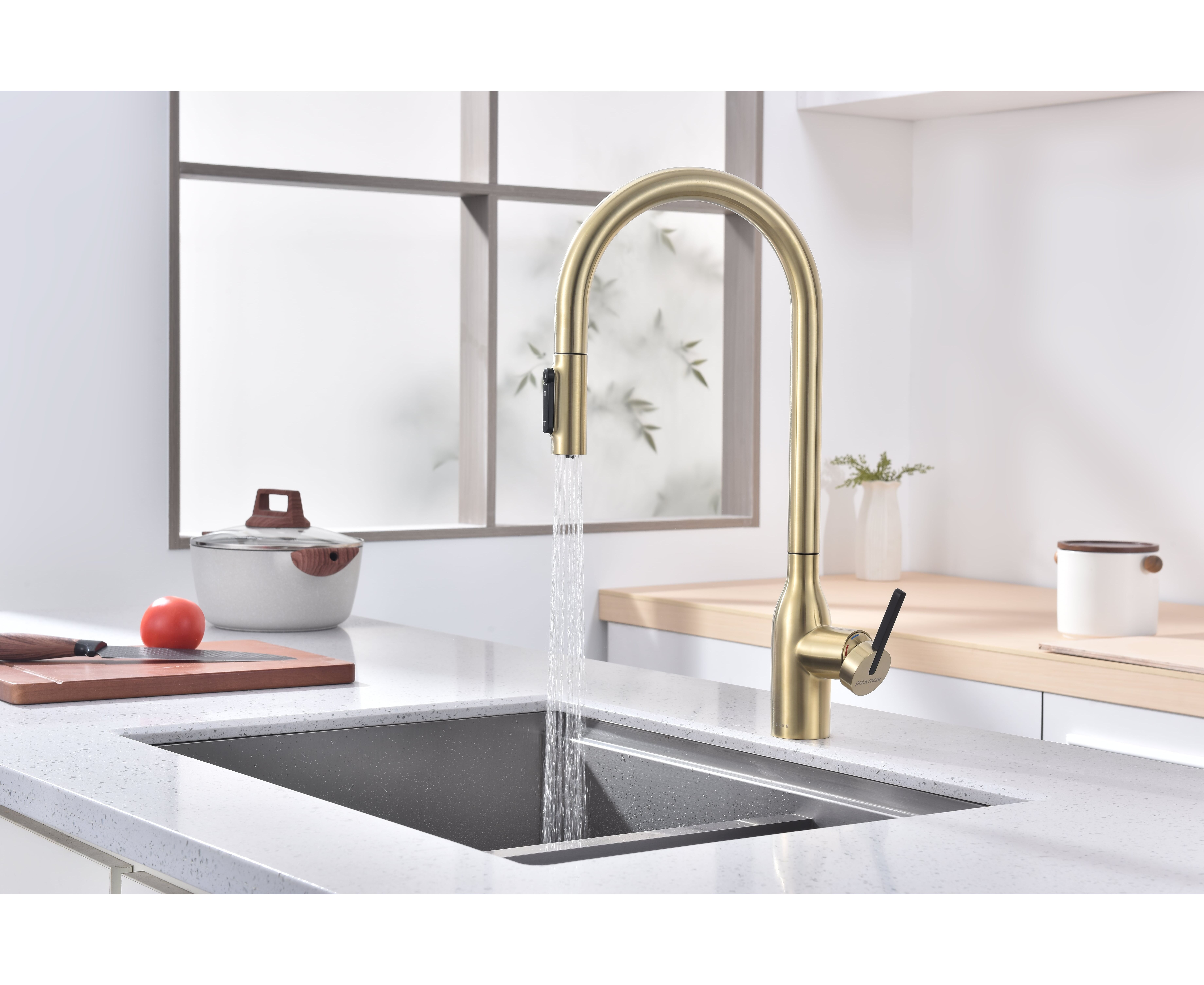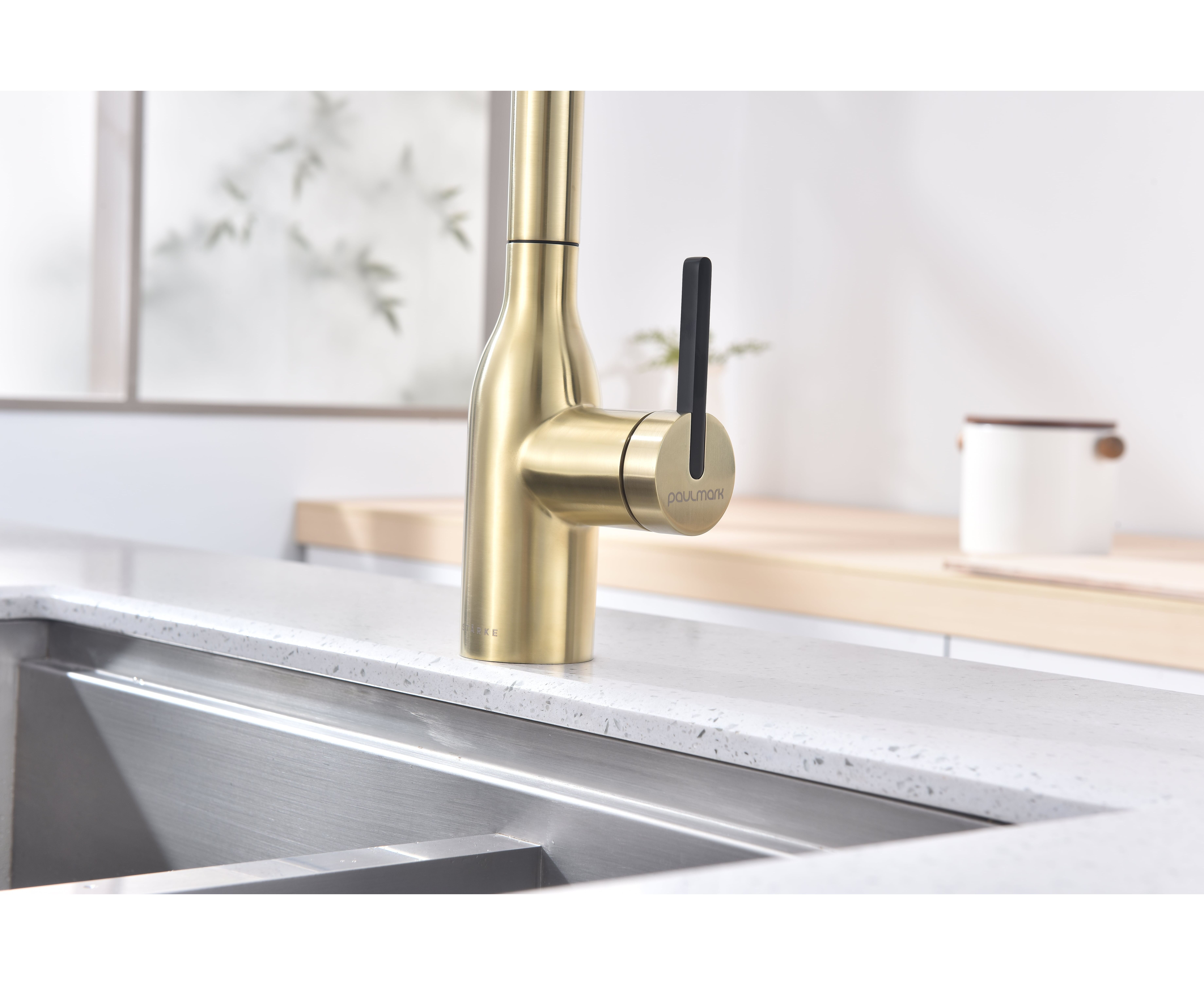 Высокий смеситель премиум-серии с вытяжным изливом и возможностью подключения системы фильтрации питьевой воды. Модель оснащена отдельным каналом для питьевой воды — водопроводная и питьевая вода не смешиваются. Кнопками на конце излива осуществляется управление всеми режимами: подача питьевой воды и переключение режимов струя или душ для водопроводной воды.