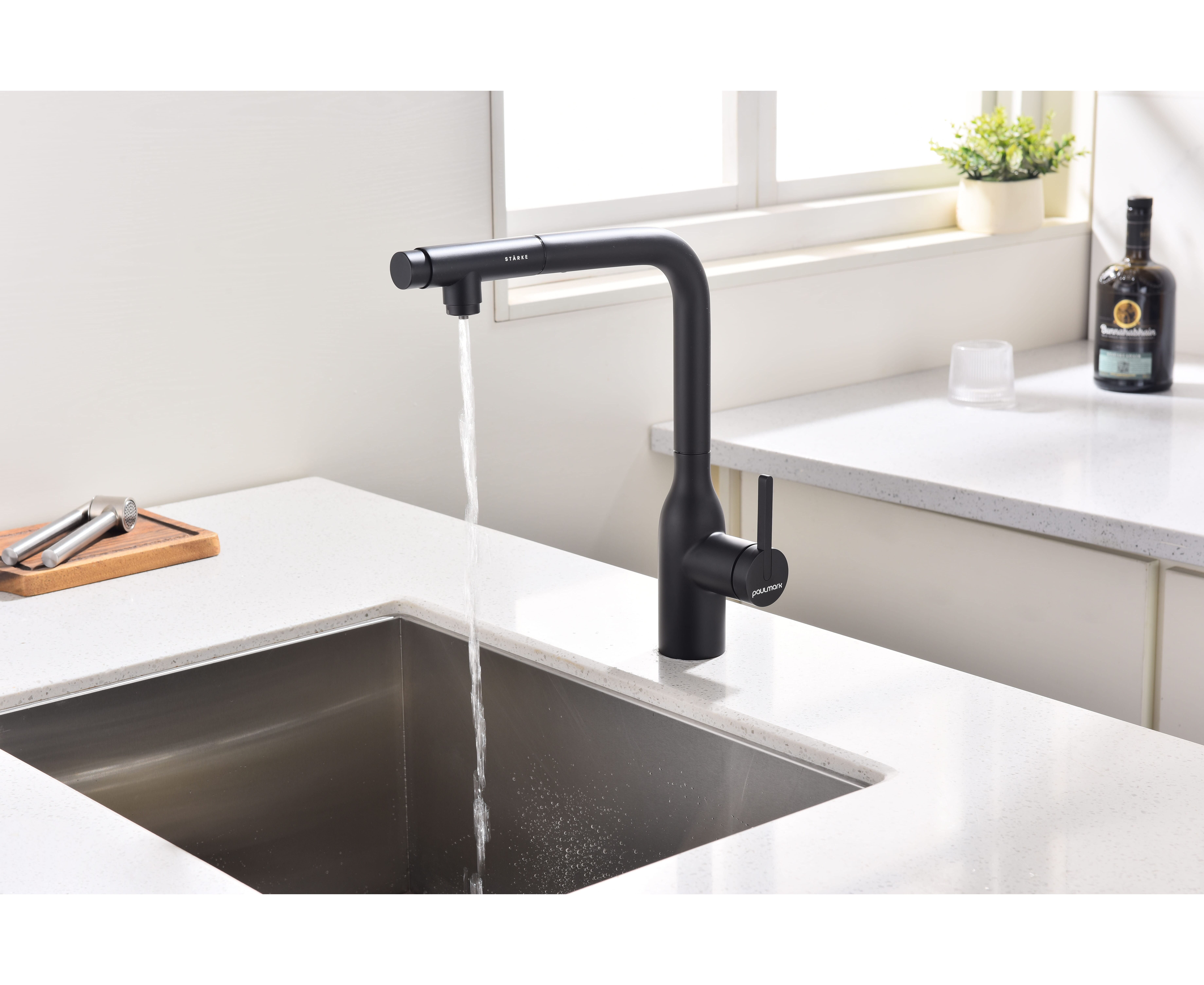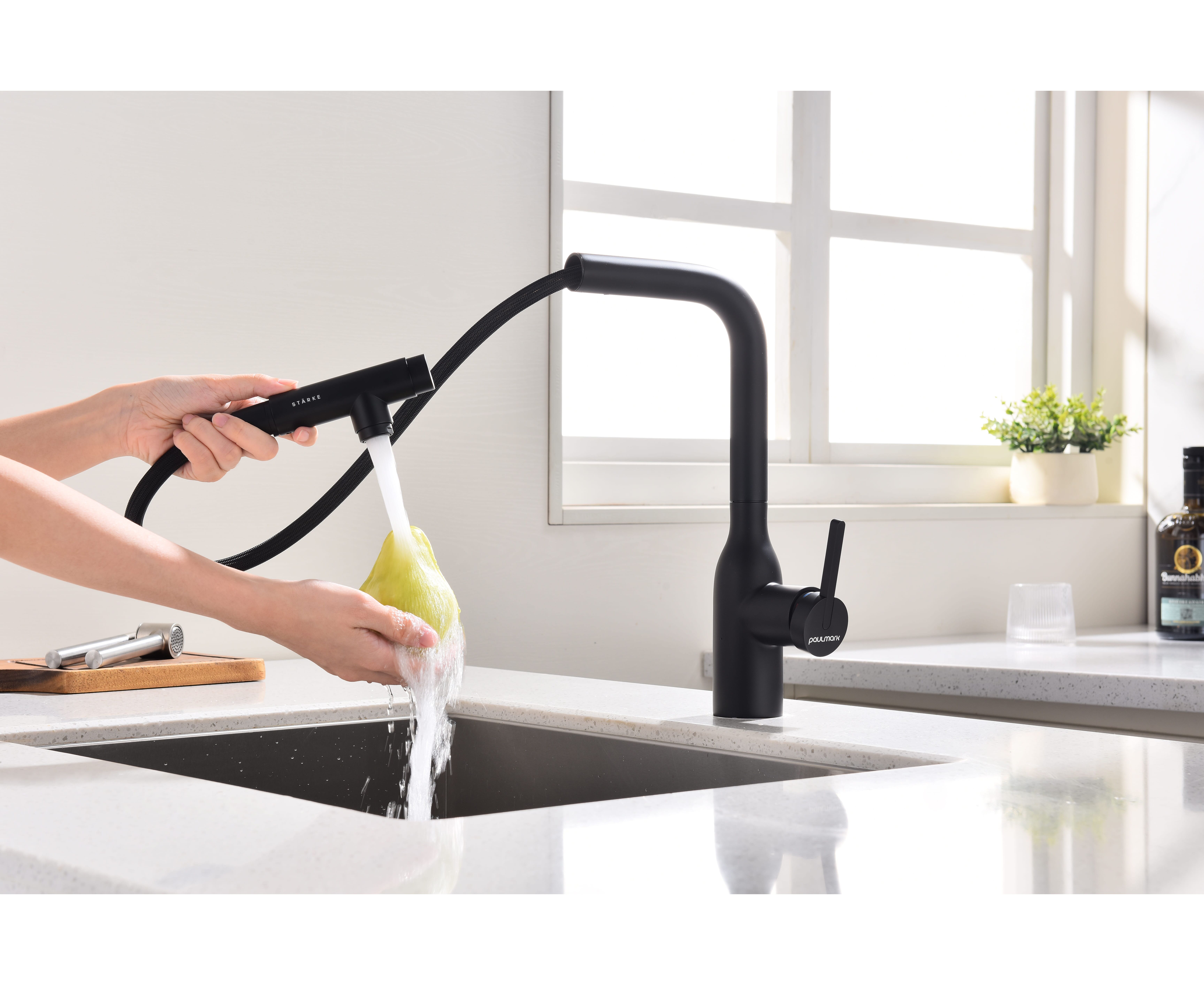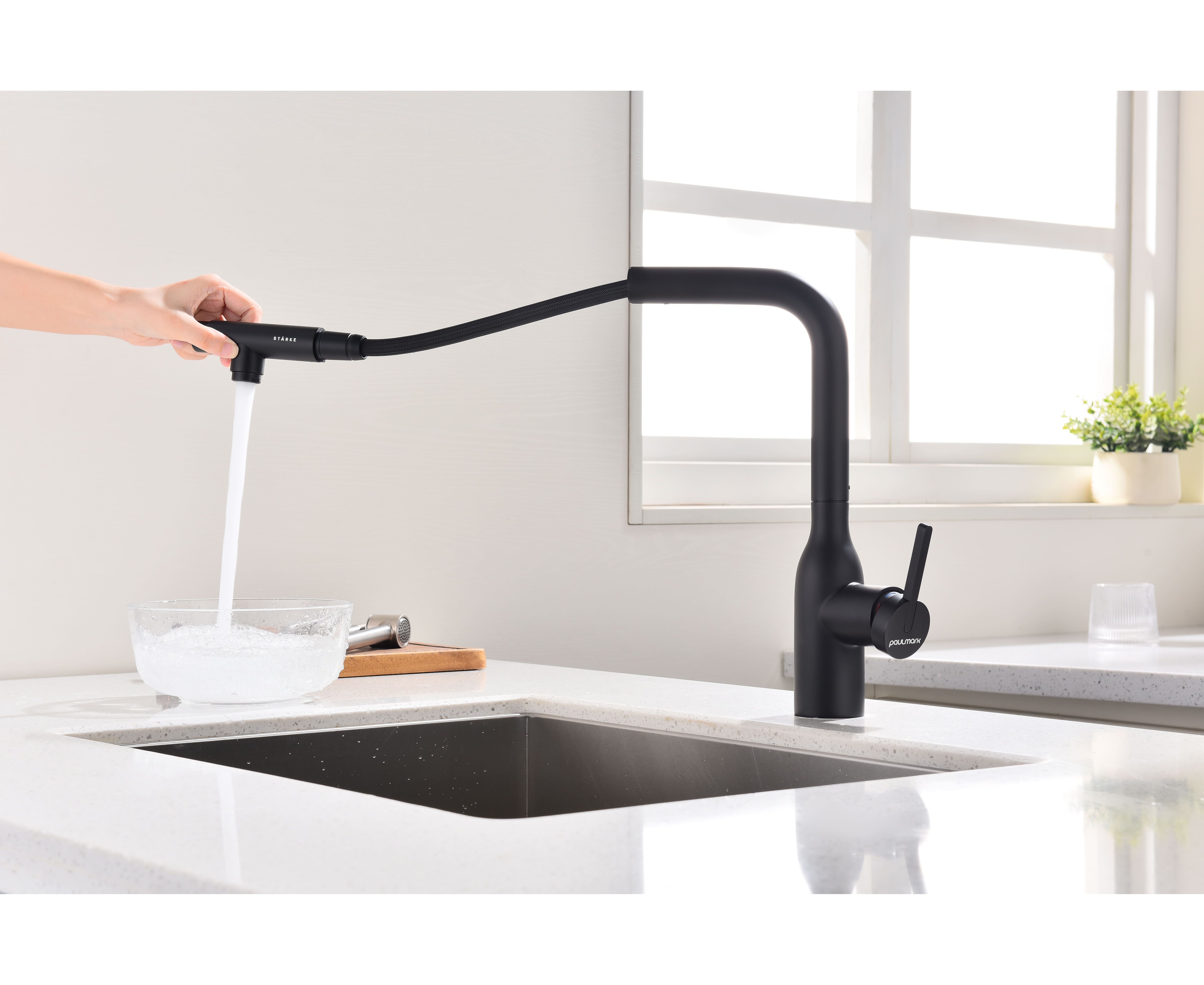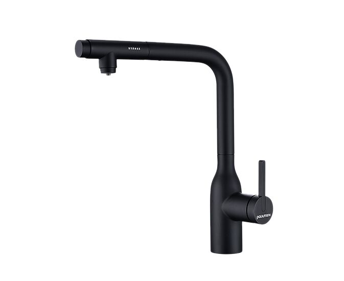 Смеситель с Г-образным изливом с вращением 180° и выдвижной лейкой обеспечивает комфортное использование. Модель оснащена отдельным каналом для питьевой воды — водопроводная и питьевая вода не смешиваются. Переключение между режимами подачи питьевой и водопроводной воды осуществляется эргономичной кнопкой на конце лейки.