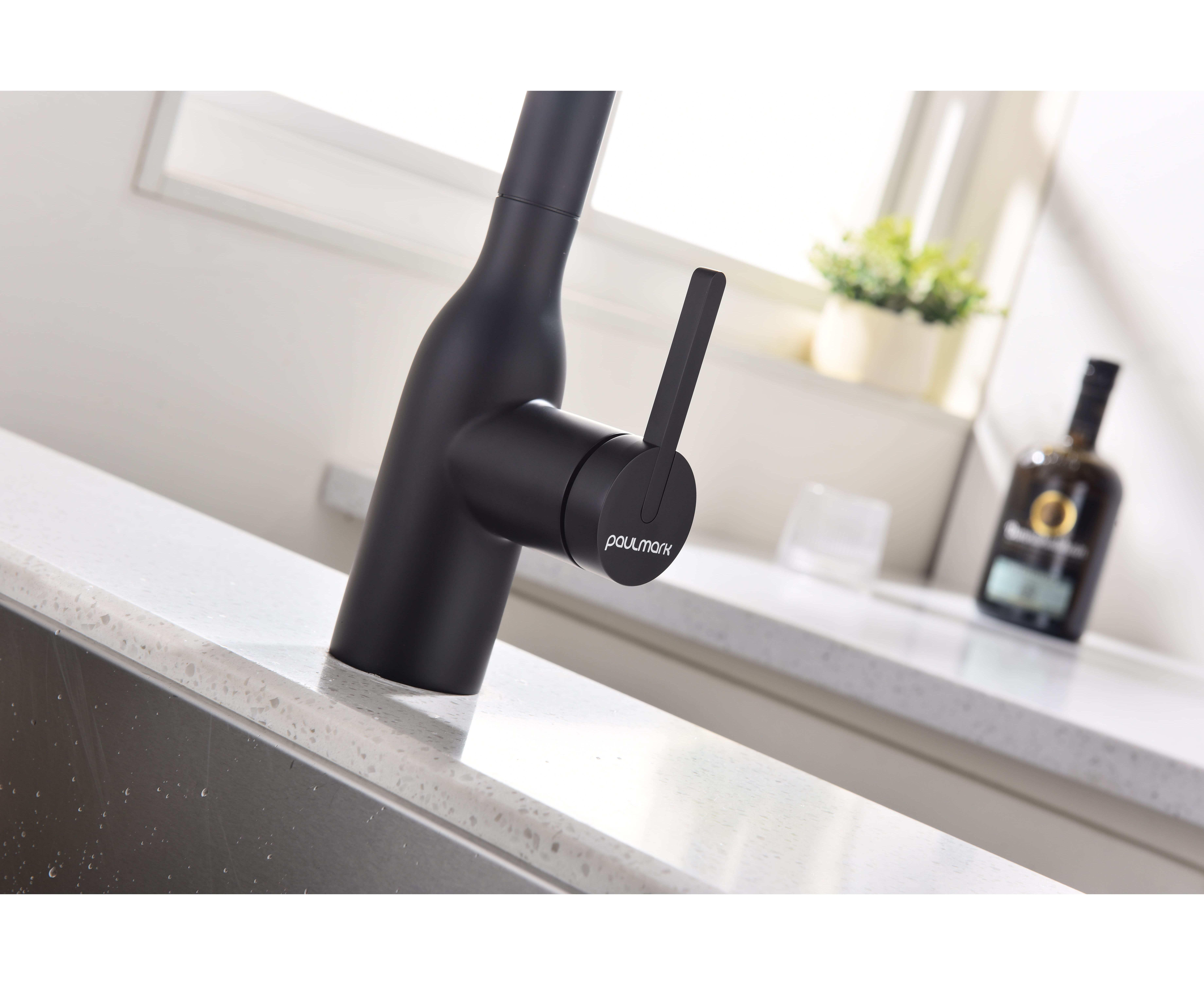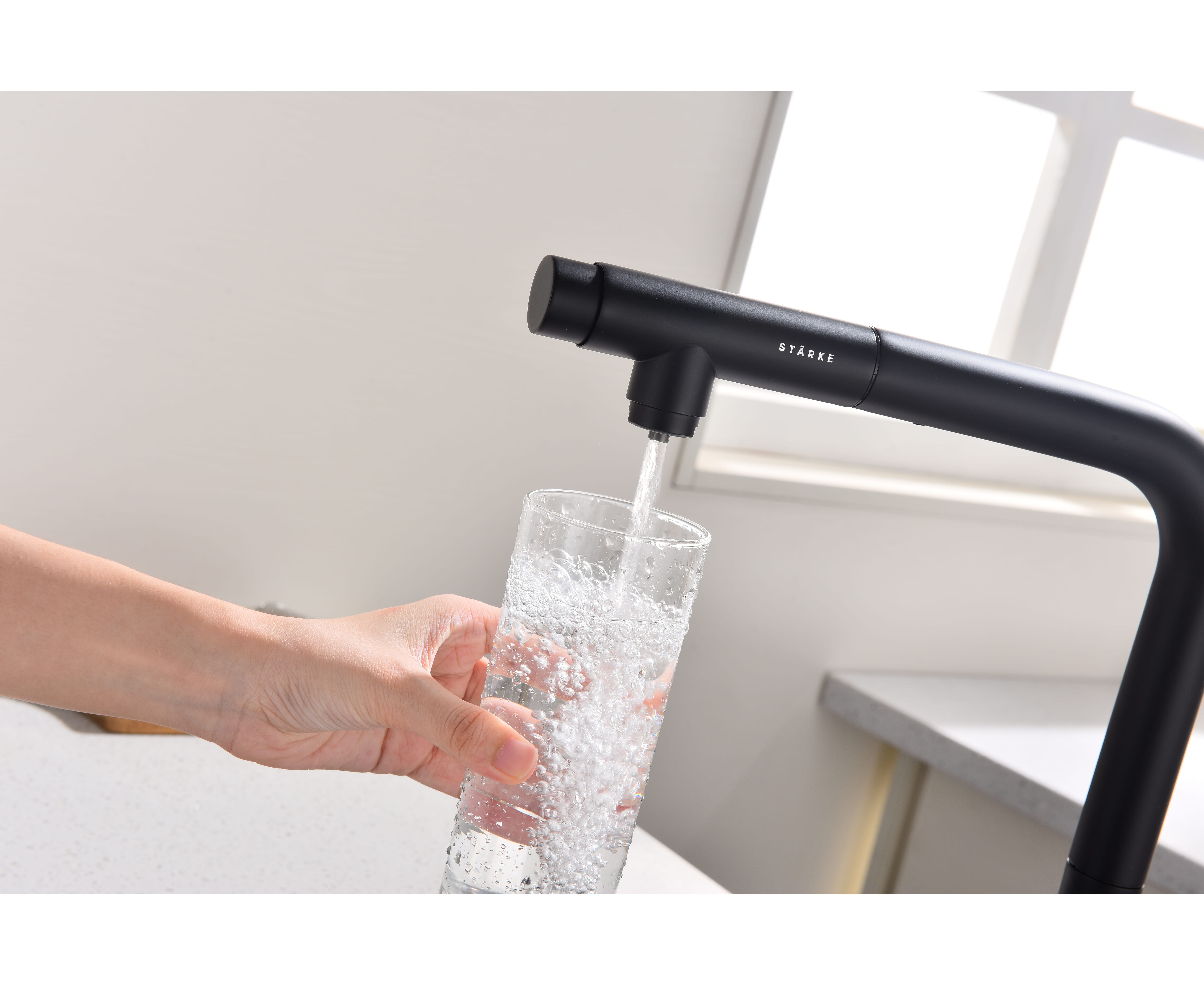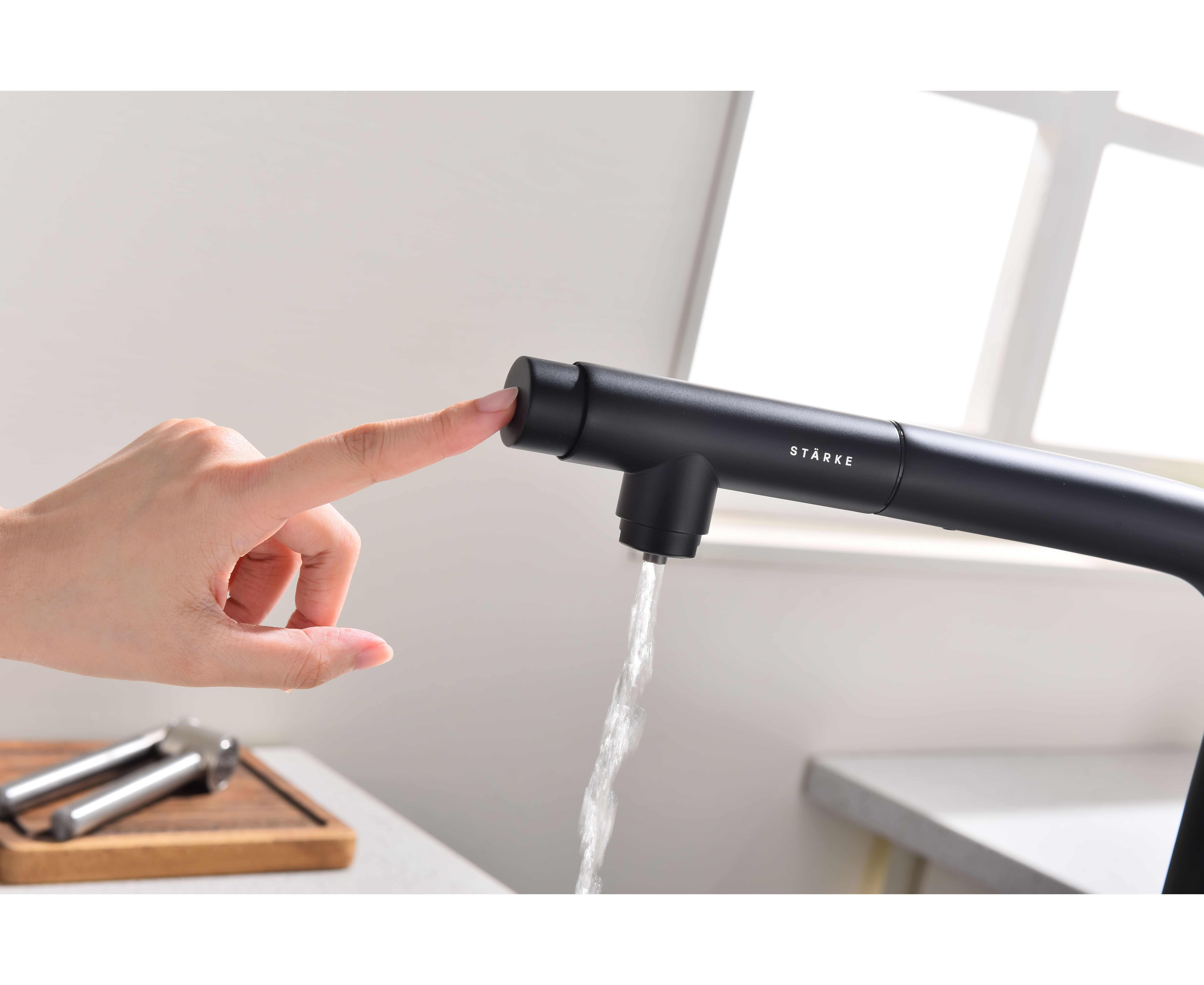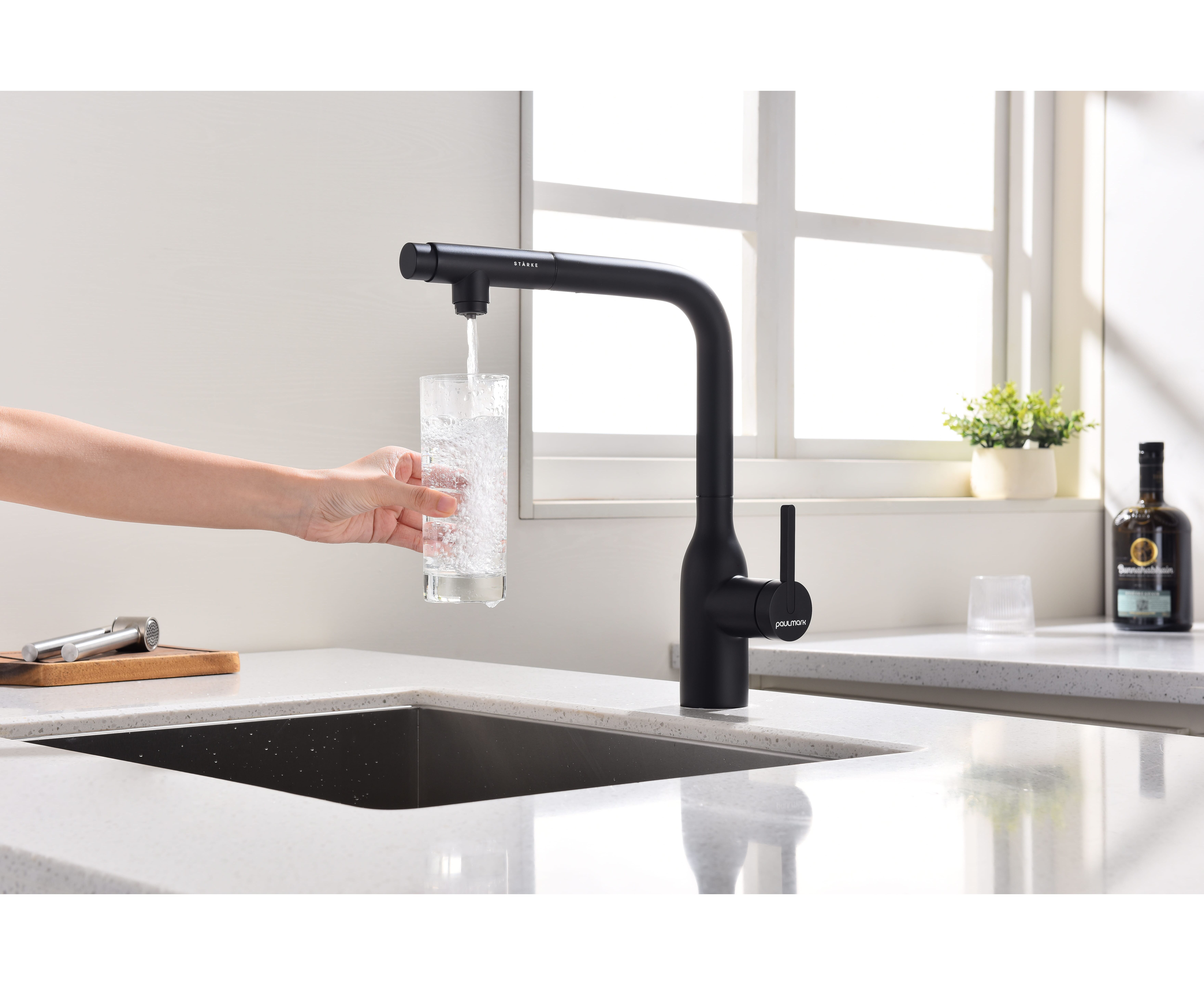 Смеситель с Г-образным изливом с вращением 180° и выдвижной лейкой обеспечивает комфортное использование. Модель оснащена отдельным каналом для питьевой воды — водопроводная и питьевая вода не смешиваются. Переключение между режимами подачи питьевой и водопроводной воды осуществляется эргономичной кнопкой на конце лейки.