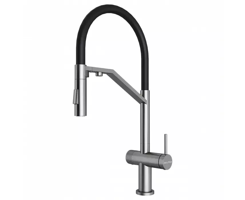 Многофункциональный смеситель для кухни ZENDER оснащен функциями подключения фильтра питьевой воды и гибким силиконовым изливом с двумя режимами подачи водопроводной воды: струя и душ. Для переключения режимов струя/душ служит кнопка на конце излива. Управление питьевой водой производится поворотом ручки, расположенной слева. Питьевая вода подается из отдельного аэратора. Для удобства использования ручка управления питьевой водой имеет декоративные лазерные насечки.