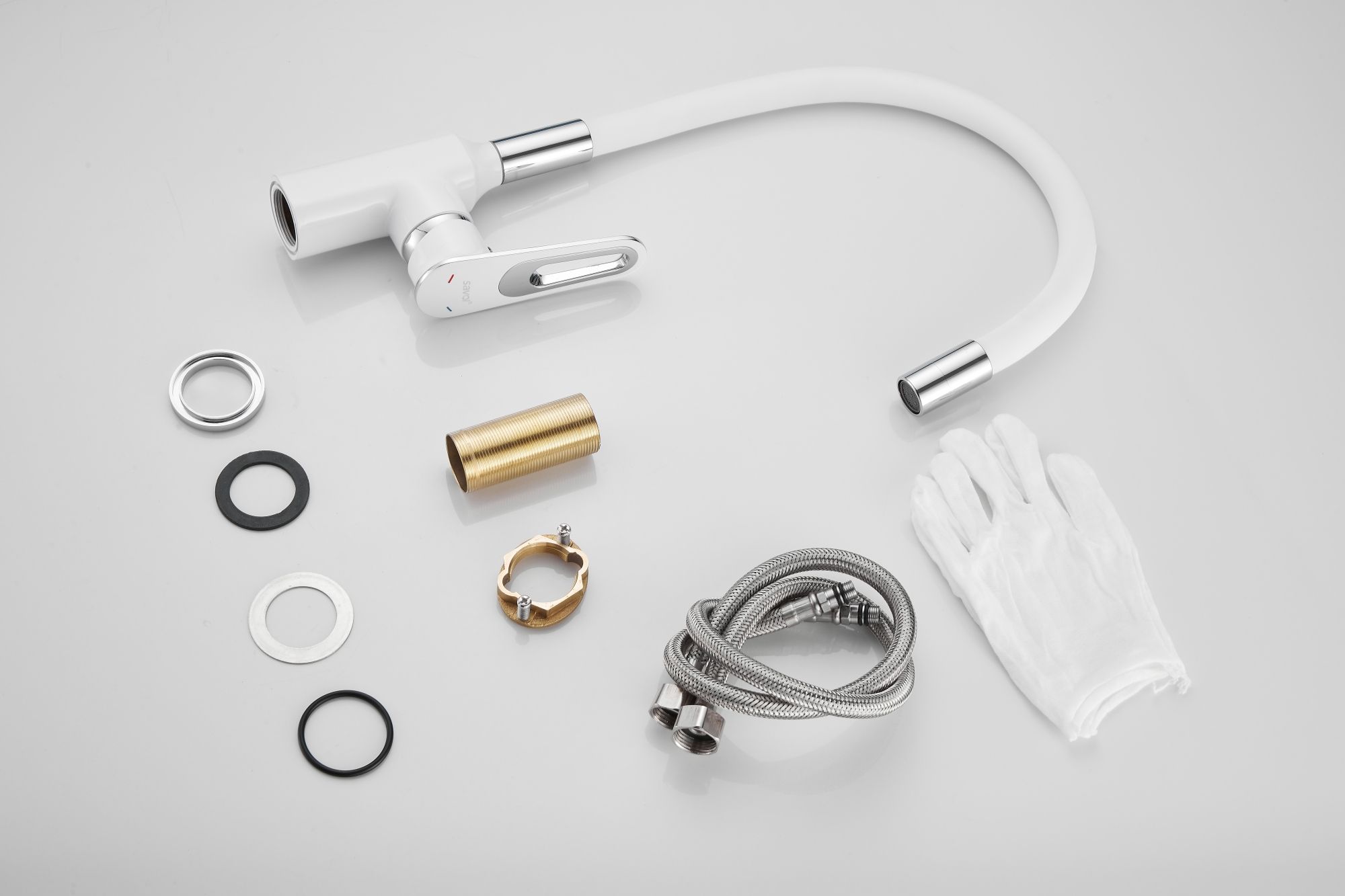 Гибкий силиконовый излив белого цвета прекрасно сочетается c хромированными деталями, что делает изделие привлекательным решением для кухни. Простой монтаж без дополнительных затрат.