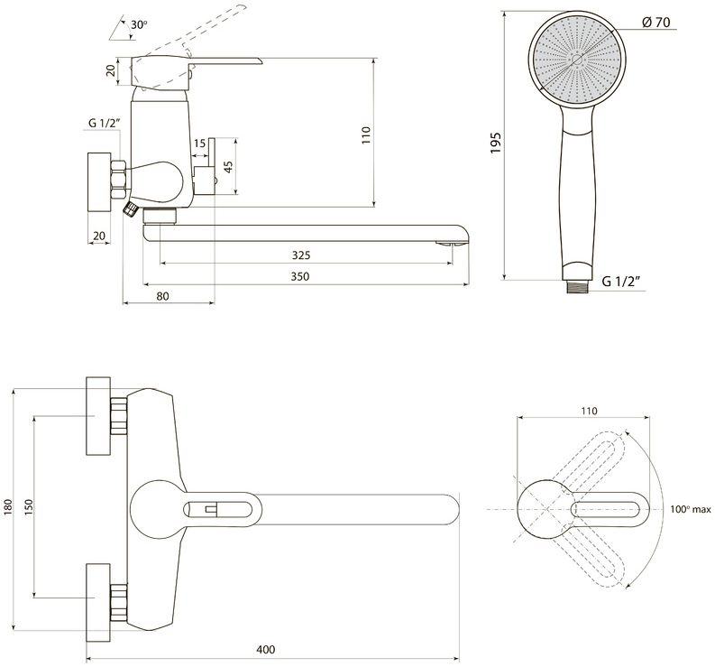 | Оснащение | душевой шланг, настенный держатель, эксцентрики, крепления, переключатель потоков, душевая лейка, аэратор |