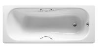 Эмалированная ванна из штампованной стали, с встроенными подлокотниками, хромированными металлическими ручками, противоскользящим покрытием дна и звукоизоляцией.