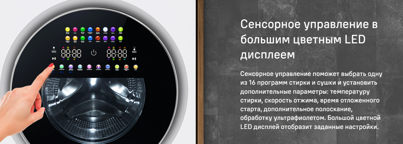 - Большой цветной LED-дисплей и сенсорное управление Помогут настроить одну из 16 программ стирки и сушки, отрегулировать отжим, задать время отложенного старта, добавить дополнительное полоскание или даже обработку ультрафиолетом.