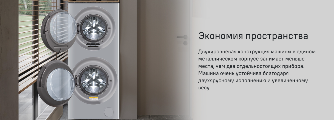 - Два независимых инверторных мотора с прямым приводом Обеспечат тихую и долгую работу стирально-сушильной машины.