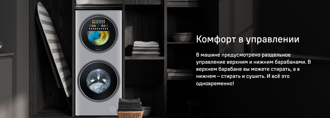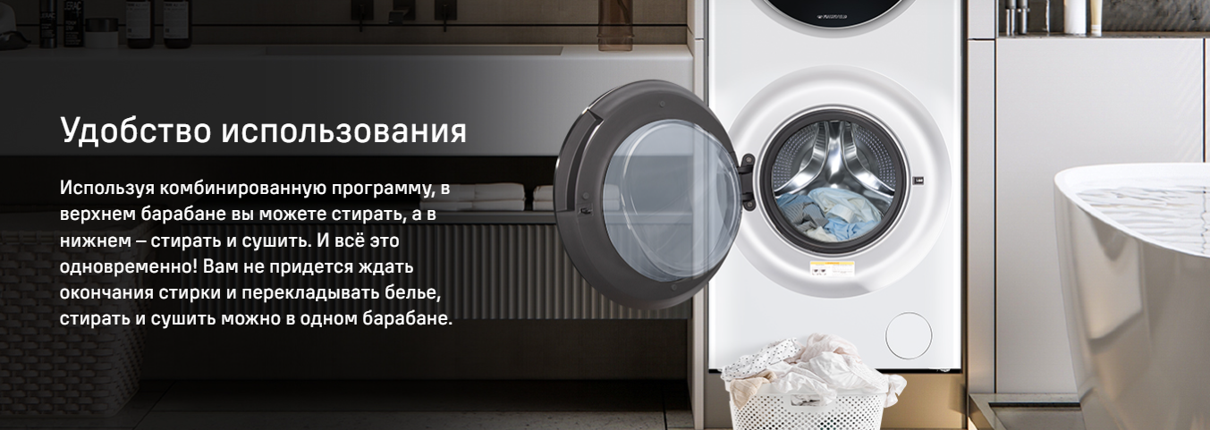- Комбинированные программы стирки и сушки Вам не придется ждать окончания стирки, чтобы переложить белье в сушку. Используя нижний барабан и комбинированную программу, вы получите чистое и сухое белье без лишних усилий.