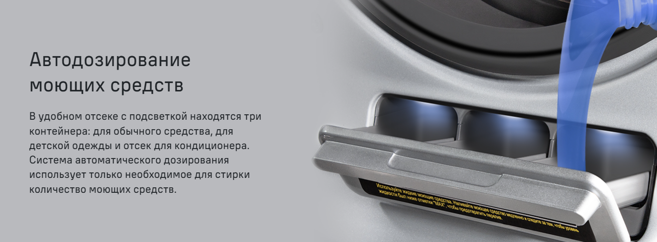 - Автоматическая дозировка моющих средств В удобном отсеке с подсветкой располагаются контейнеры для заливки основного средства для стирки, средства для стирки детских вещей и кондиционера. Машина сама определяет, сколько средства добавить для той или иной программы.