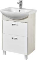 - Боковые стенки и фигурная планка под раковиной изготовлены из ламинированной, текстурированной влагостойкой ЛДСП в цвете дуб сомерсет, а фасады - из крашеной в белый цвет влагостойкой ЛДСП