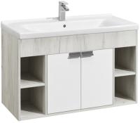 - Выполненная из влагостойкой ламинированной плиты тумба обладает простым и удобным функционалом - в центре за распашными фасадами-створками находится вместительное отделение с регулируемой по высоте полкой в цвете дуб крафт, а слева и справа - открытые ниши, на которых так приятно разместить красивые мелочи и декор для ванной комнаты.