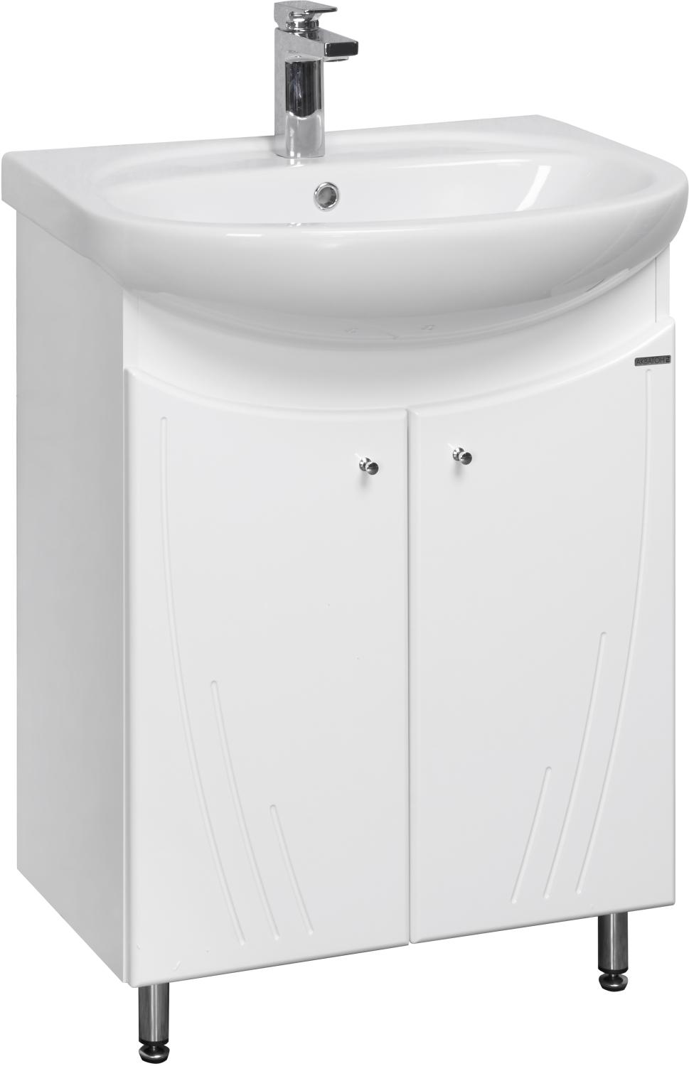 Тумба под раковину Акватон Минима Н 65 1A104201MN010 на двух ножках, с двумя распашными дверцами и одной полкой за ними, с фрезеровкой на фасаде. Корпус выполнен из ДСП с ламинированным покрытием, обладает повышенной влагостойкостью и сопротивляемостью износу, не выделяет вредных испарений, хорошо выдерживает воздействие бытовых химических средств, за исключением абразивных материалов и едких веществ и жидкостей. Фасадные детали изготавливаются из МДФ с пятислойной покраской.