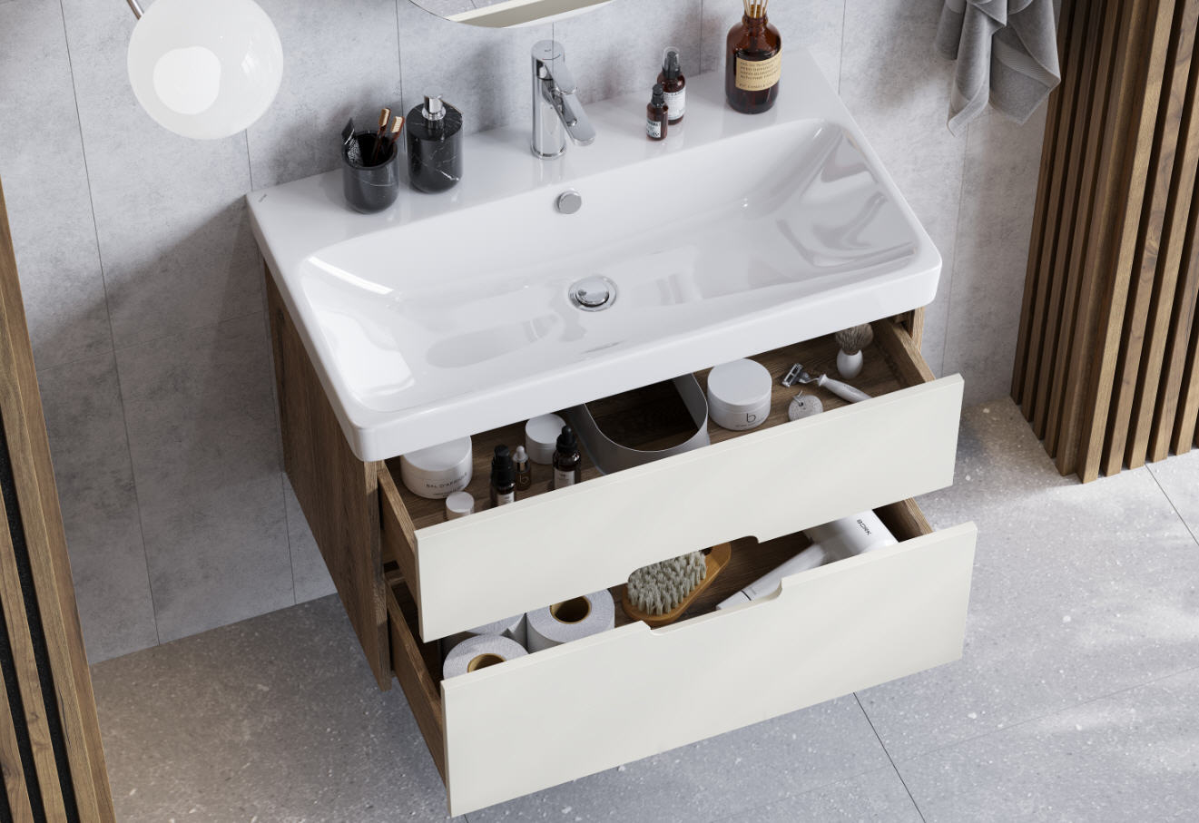 - Ящики установлены на направляющие полного выдвижения с доводчиками, что обеспечит легкий доступ ко всем предметам, которые хранятся в ящиках.