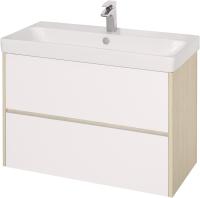- Корпус тумбы выполнен из влагостойкой ЛДСП в декоре натурального дерева, а фасады в белой глянцевой покраске.