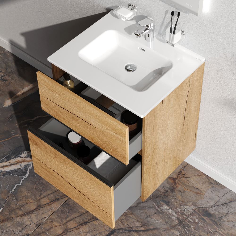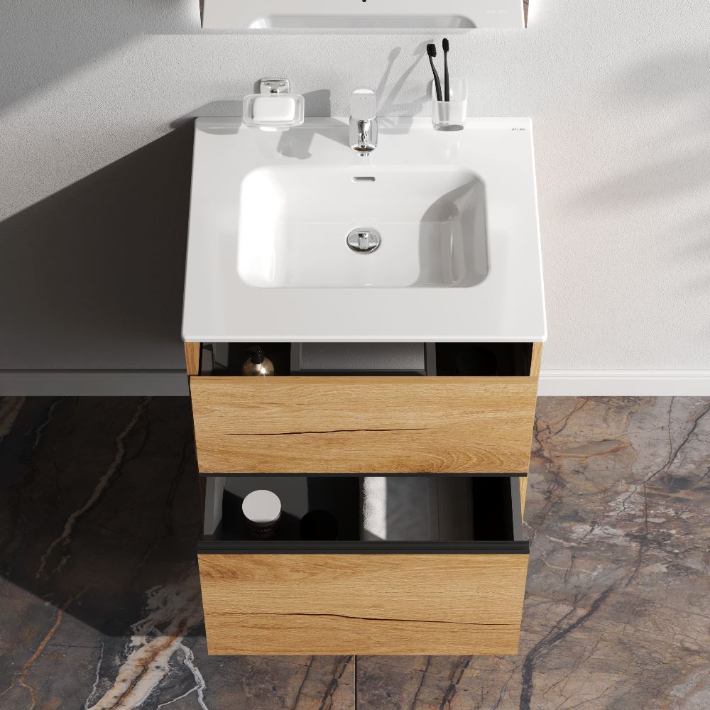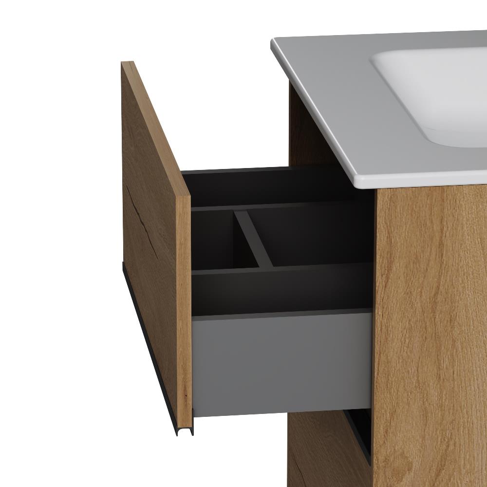 - Два вместительных ящика на направляющих Soft-close скрытого монтажа, которые обеспечивают плавное и бесшумное открывание и закрывание - использование тумбы максимально комфортное.